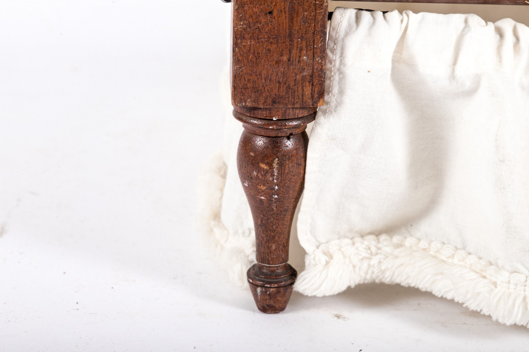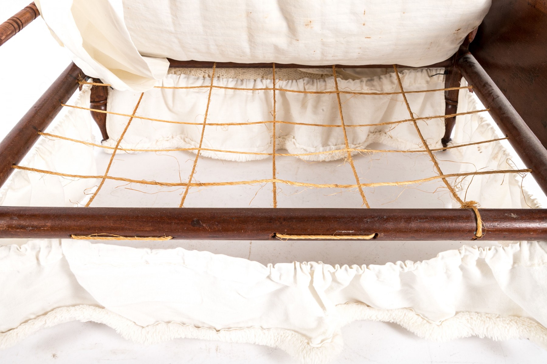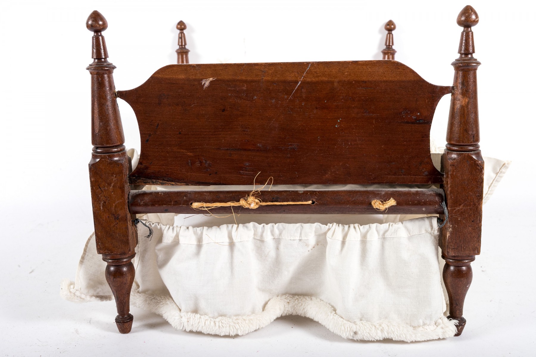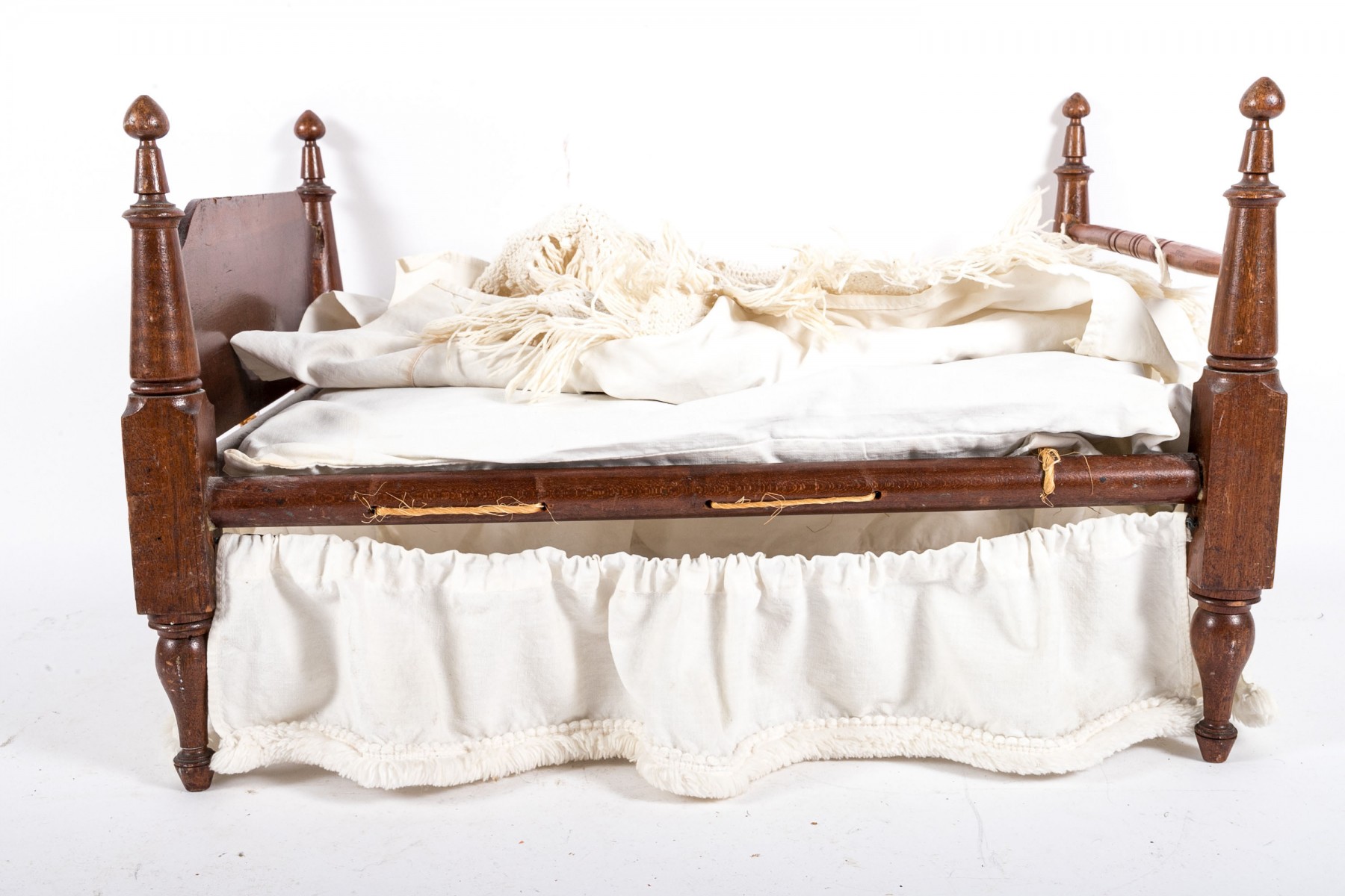 An adorable Eastlake-styled doll bed with a dark brown oak frame, fitted with ropes to support a darling mattress pad, flat sheet, and crochet coverlet. Finished with a white skirt lined with plush white fringe.