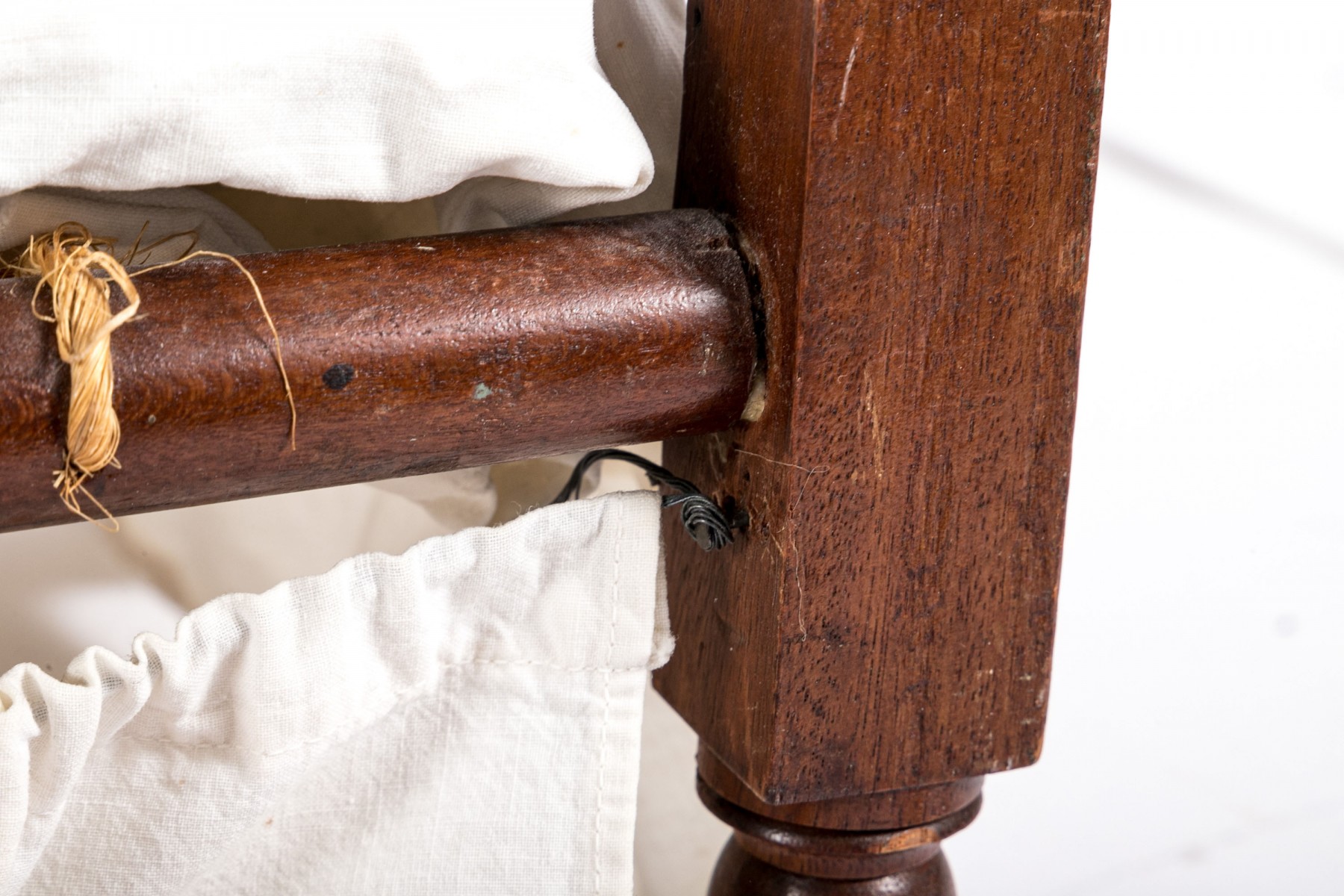 Displays well with wear commensurate with age, including surface scratches, scuffs, nicks, finish wear. Staining to the fabric. Spots of adhesive residue around the frame joints. Please review the pictures as they are a part of the condition report.