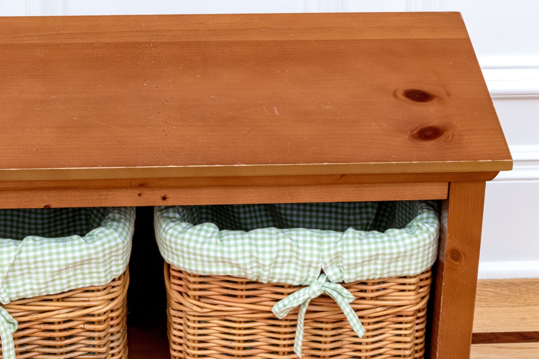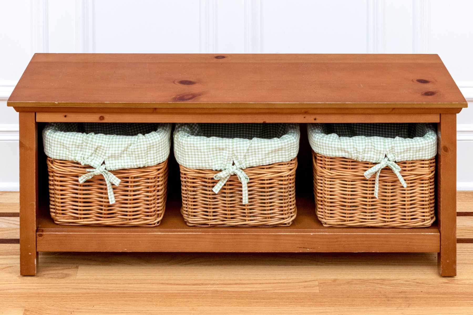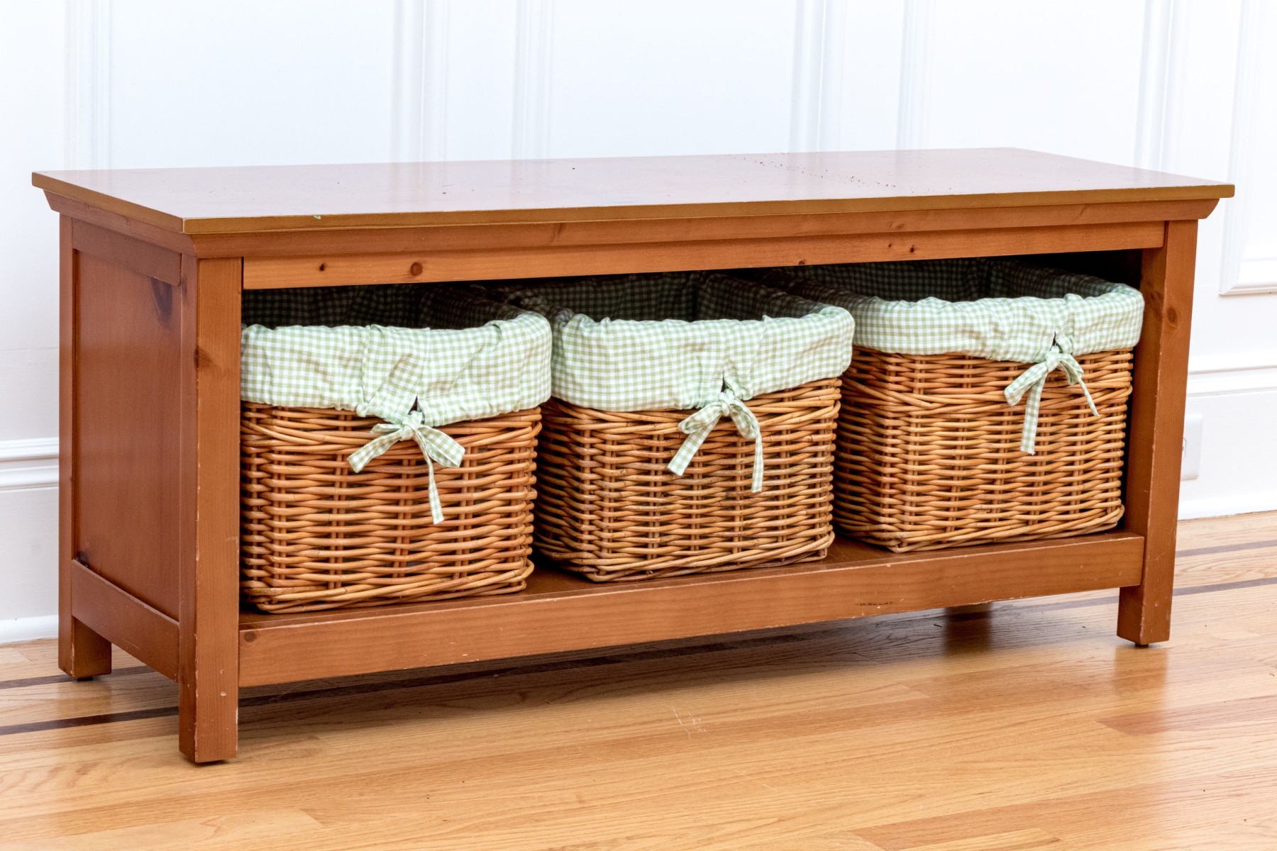 A lovely entry way storage bench in warm-toned orange brown pine, showcasing a contemporary rustic flare with a minimalist profile. Includes three beautiful wicker baskets lined in green plaid fabric finished with drawstrings tied in bows at the fronts.