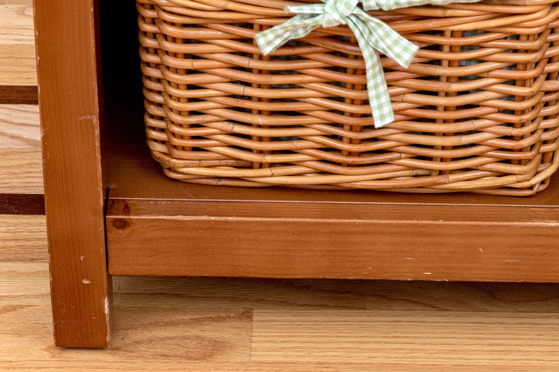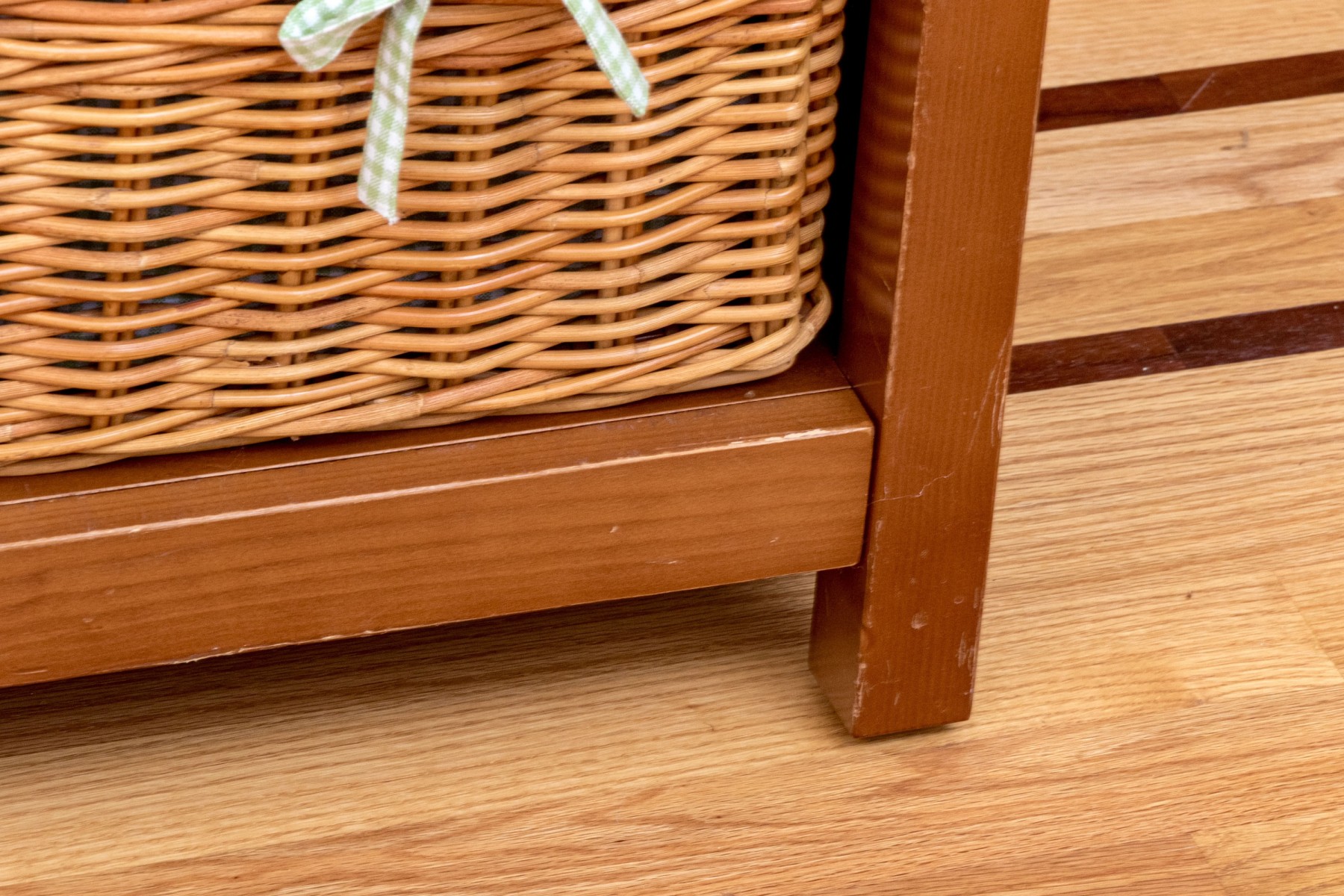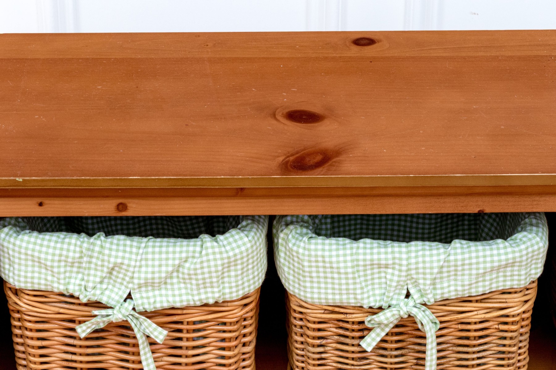 A lovely entry way storage bench in warm-toned orange brown pine, showcasing a contemporary rustic flare with a minimalist profile. Includes three beautiful wicker baskets lined in green plaid fabric finished with drawstrings tied in bows at the fronts.