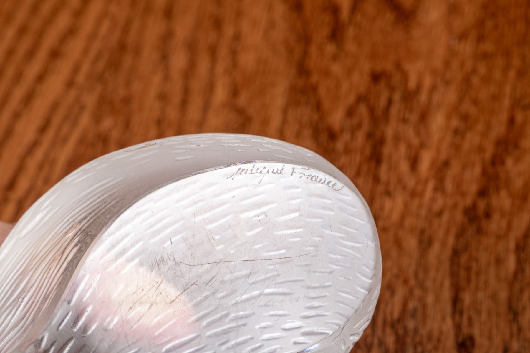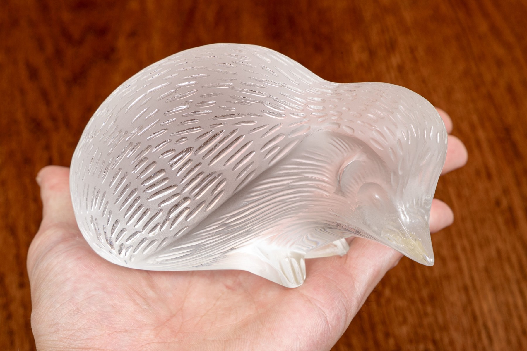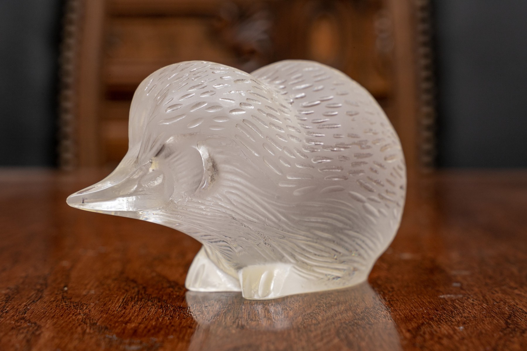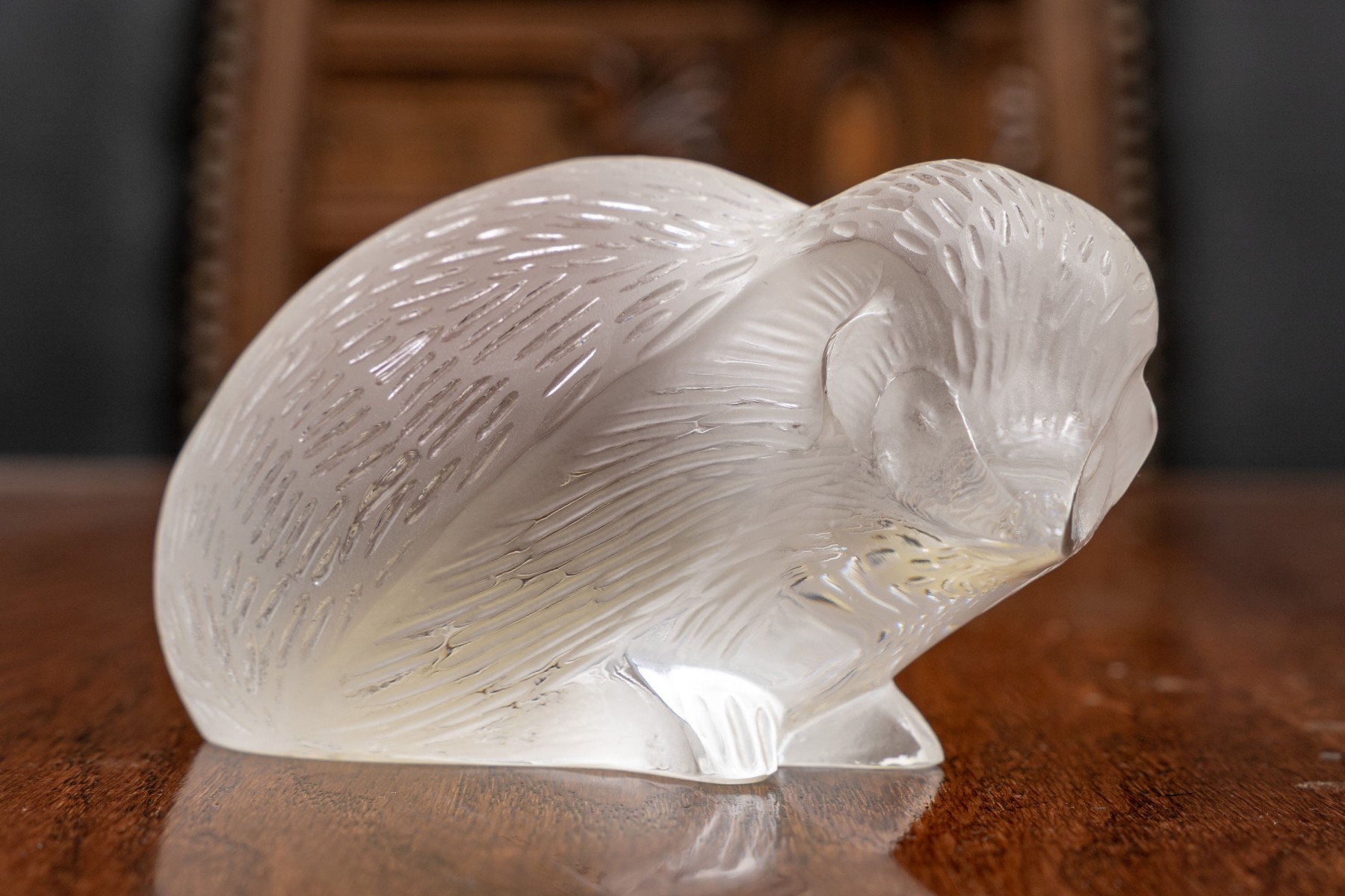 An adorable French, Lalique frosted crystal hedgehog. Depicted in crouched position with its head up and tilted to the right hand side. Etched surface decoration resembling fur, with a pointed nose.