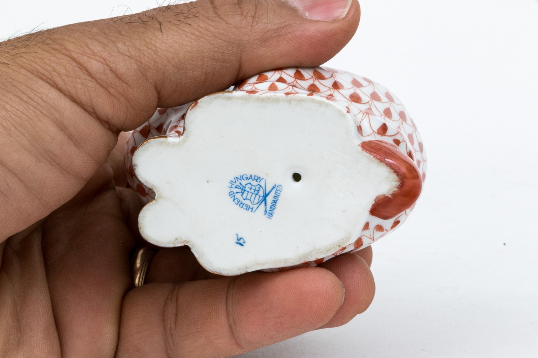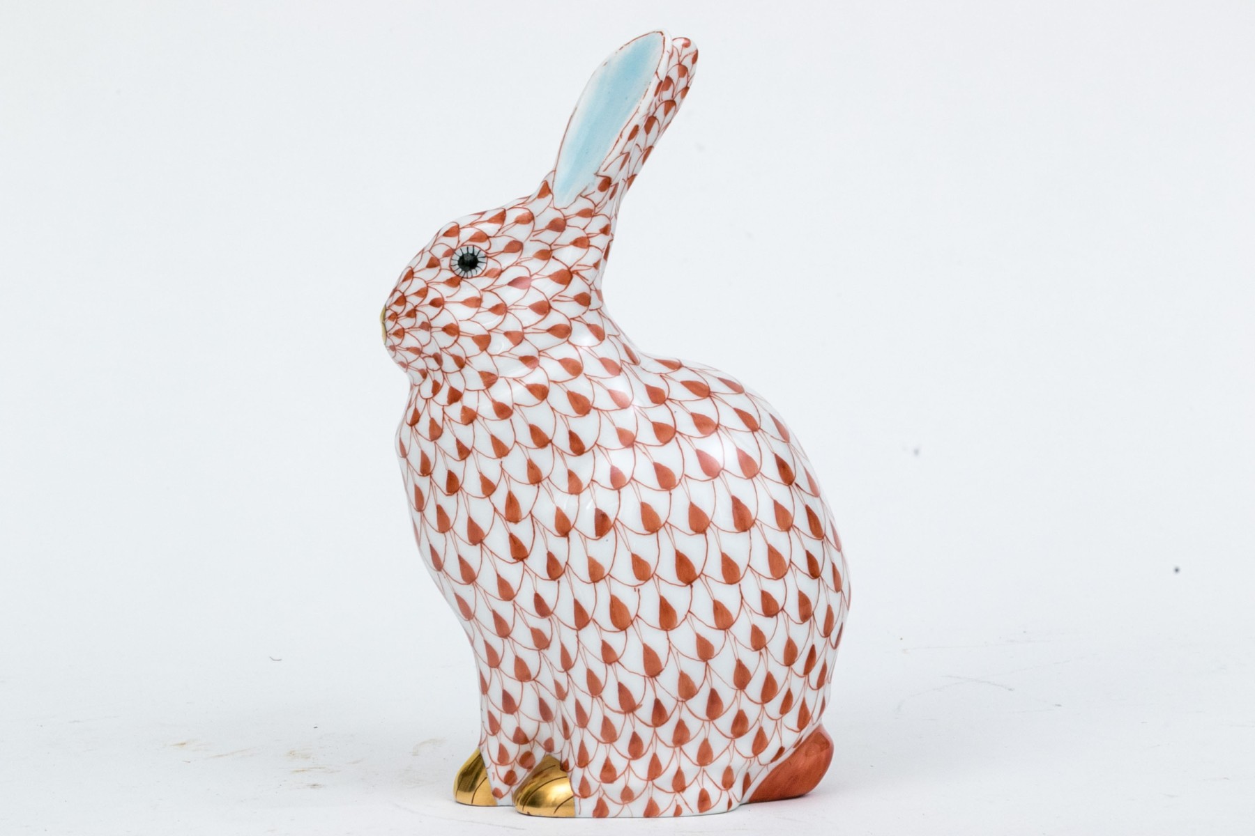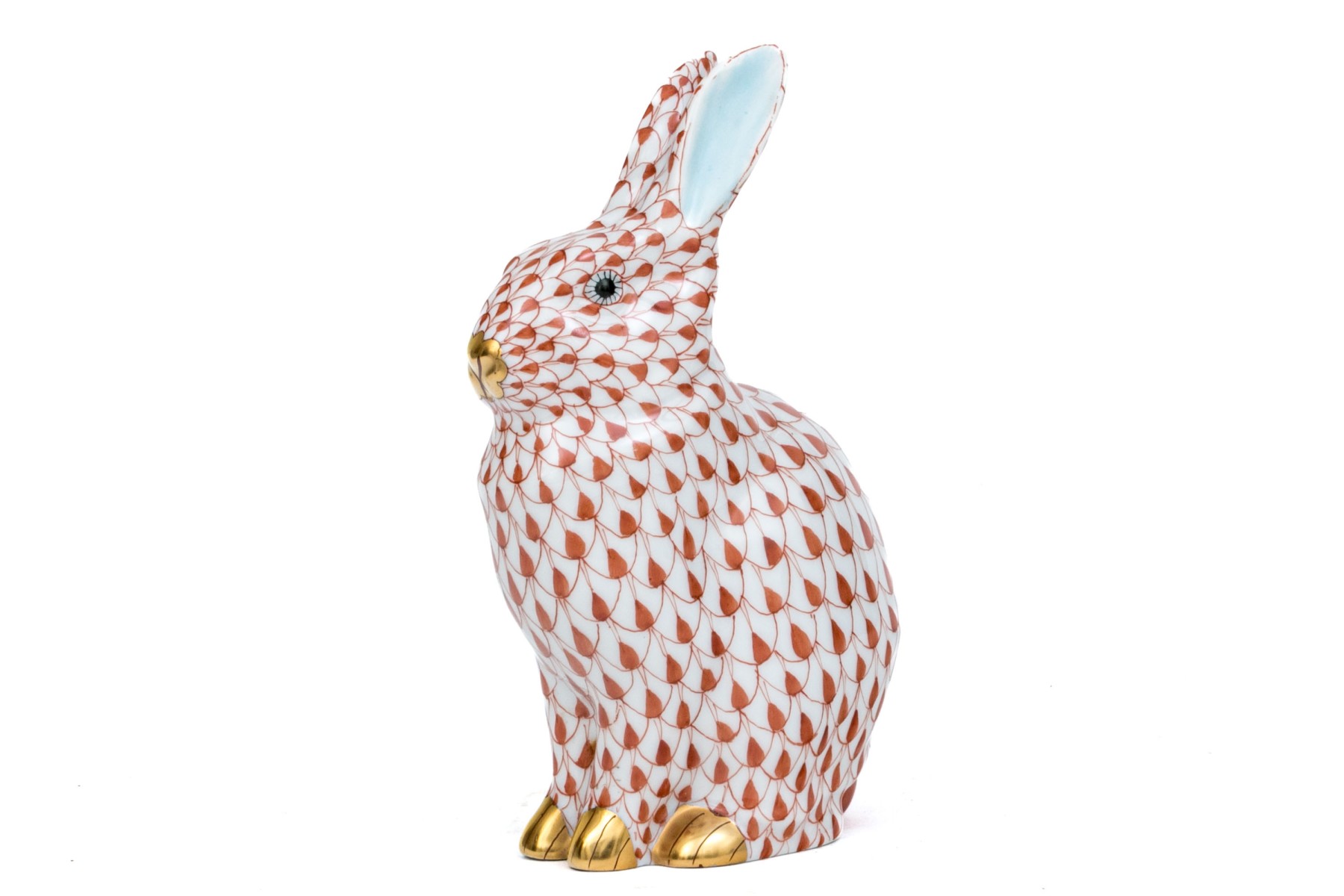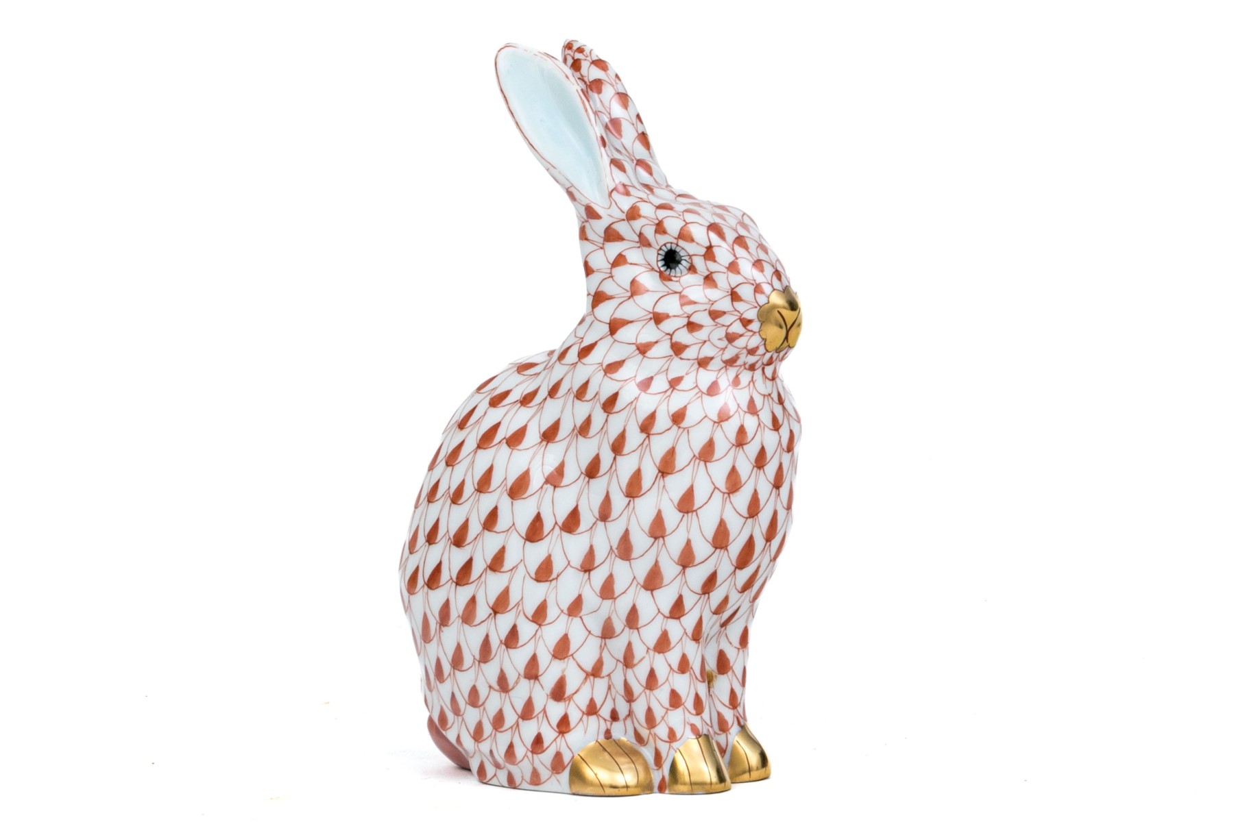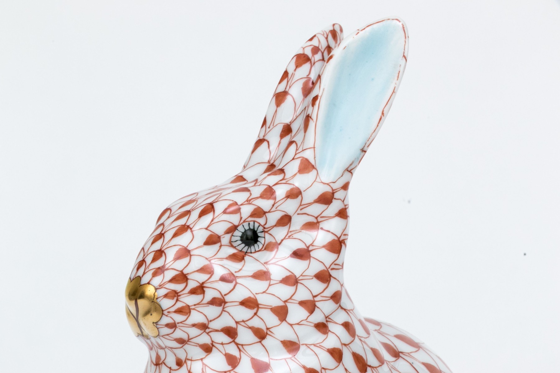 An adorable Herend Hungarian porcelain figure of a seated rabbit with tall powder blue ears, hand-painted with a striking orange-red fishnet motif and finished with gilt paws.