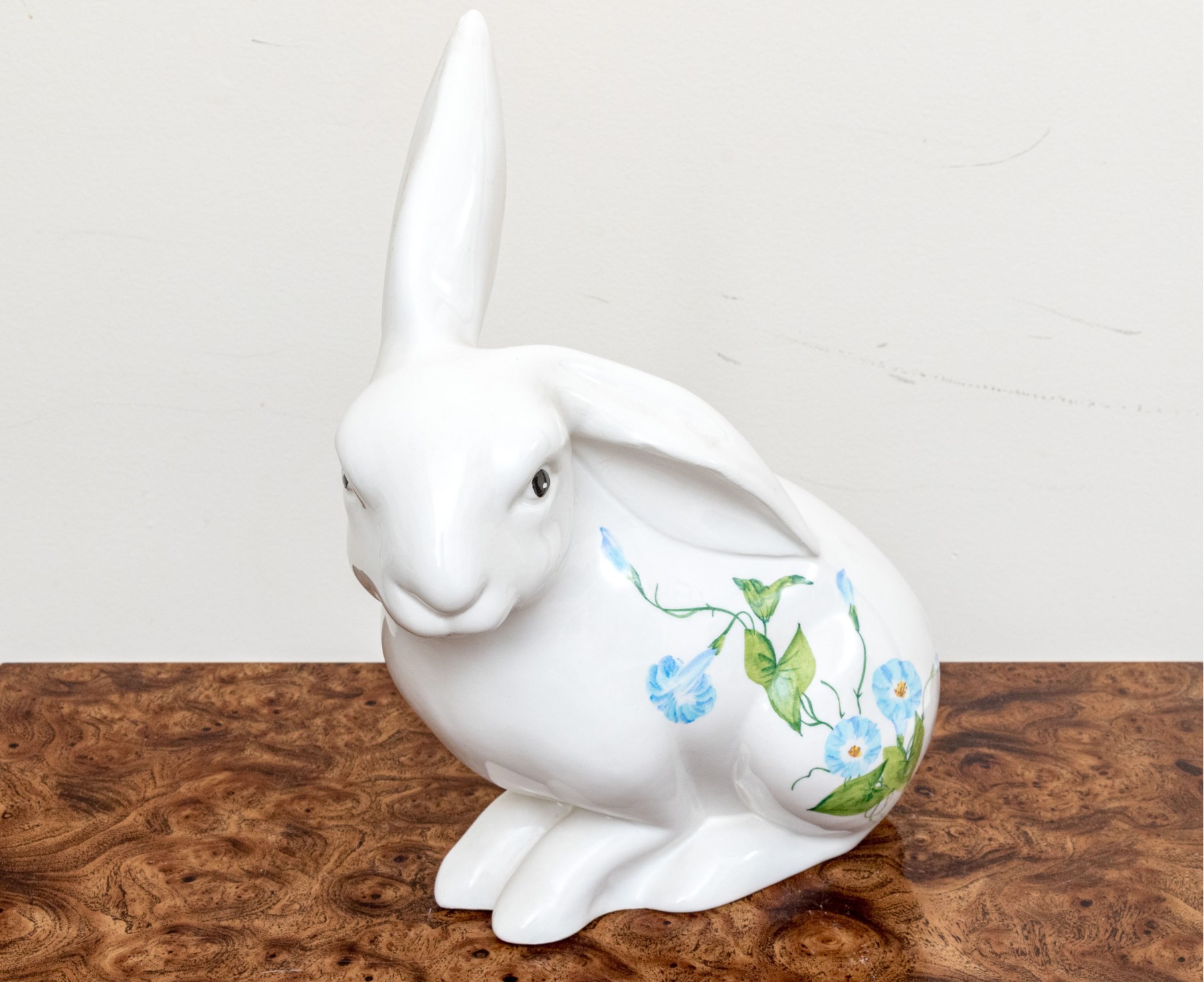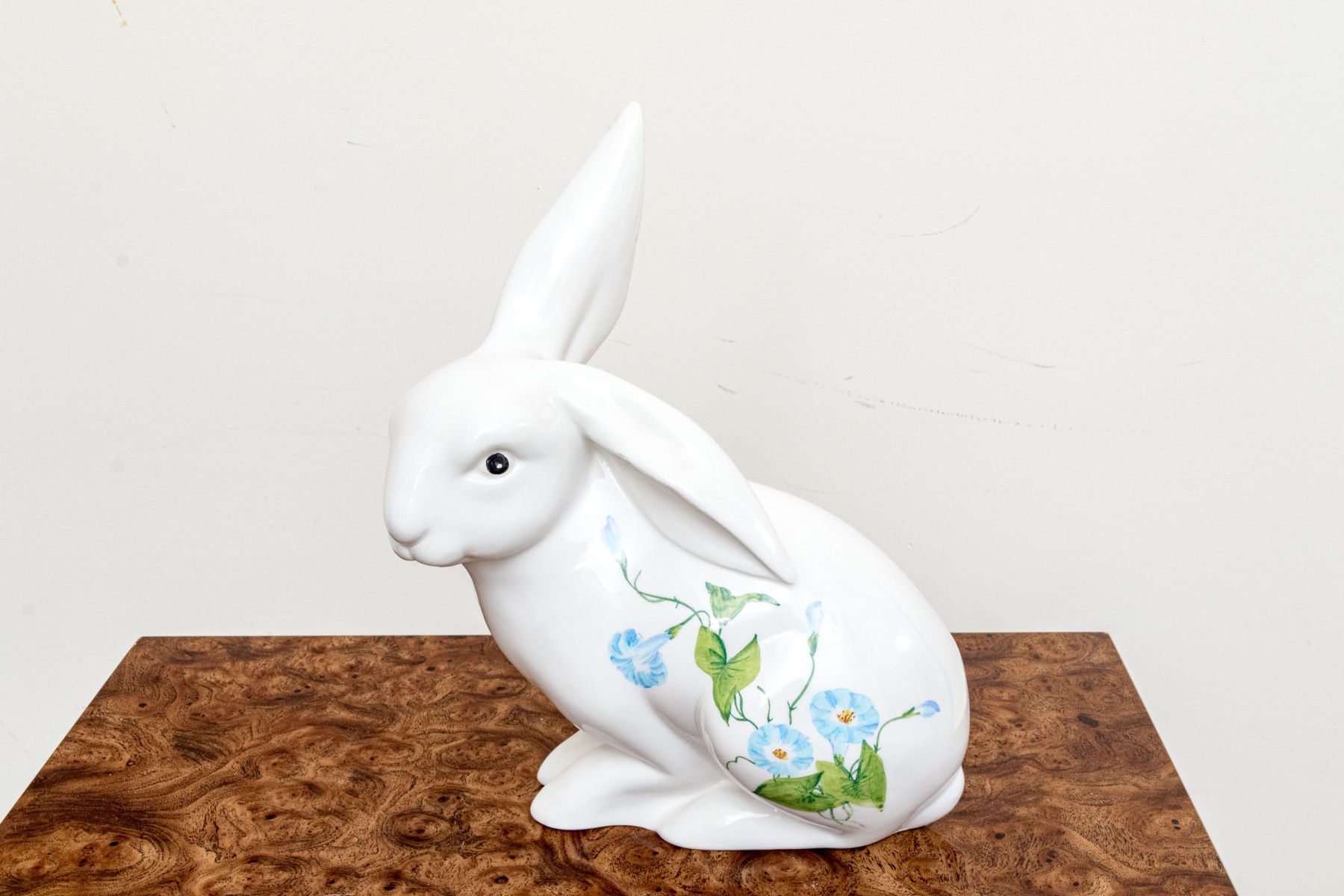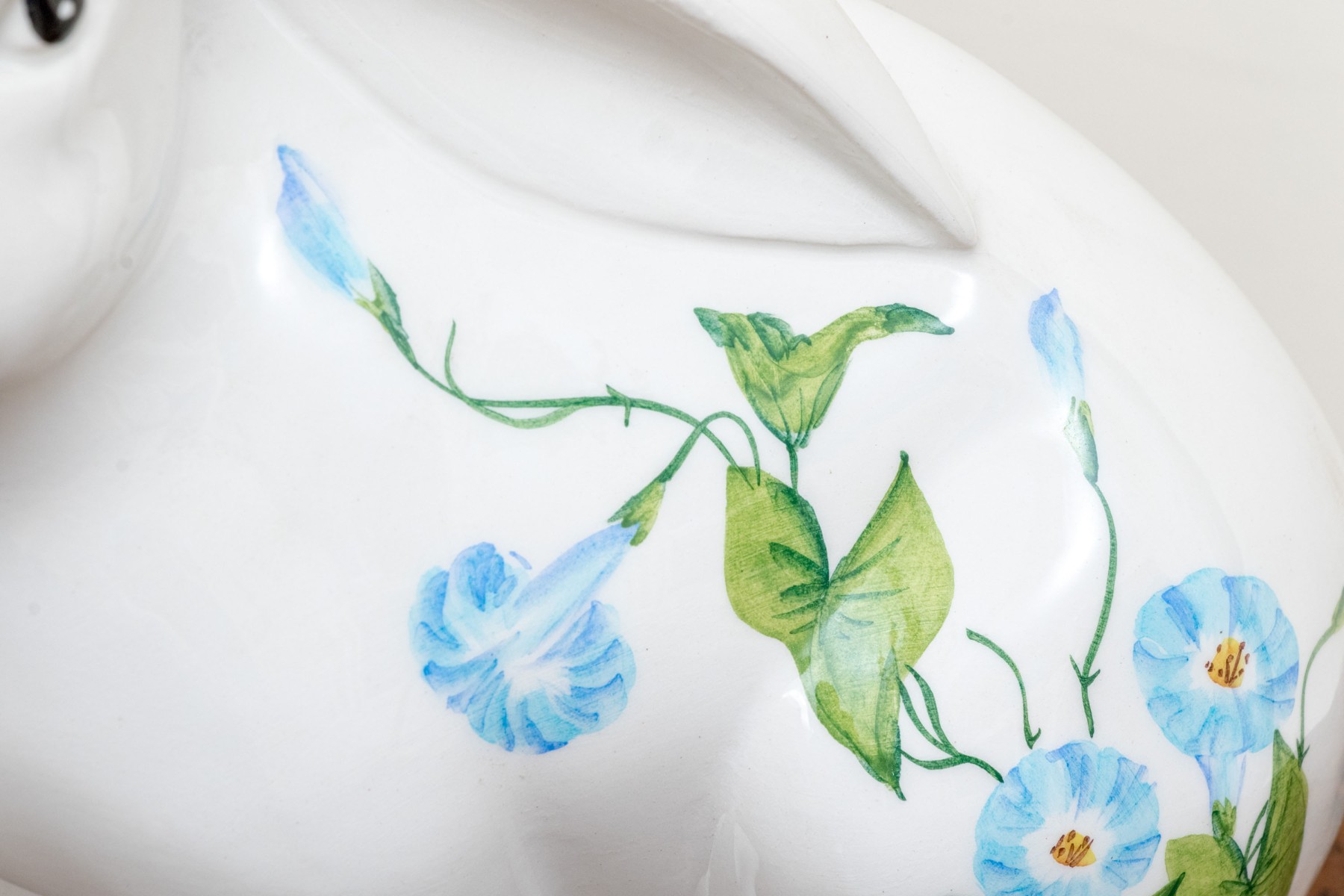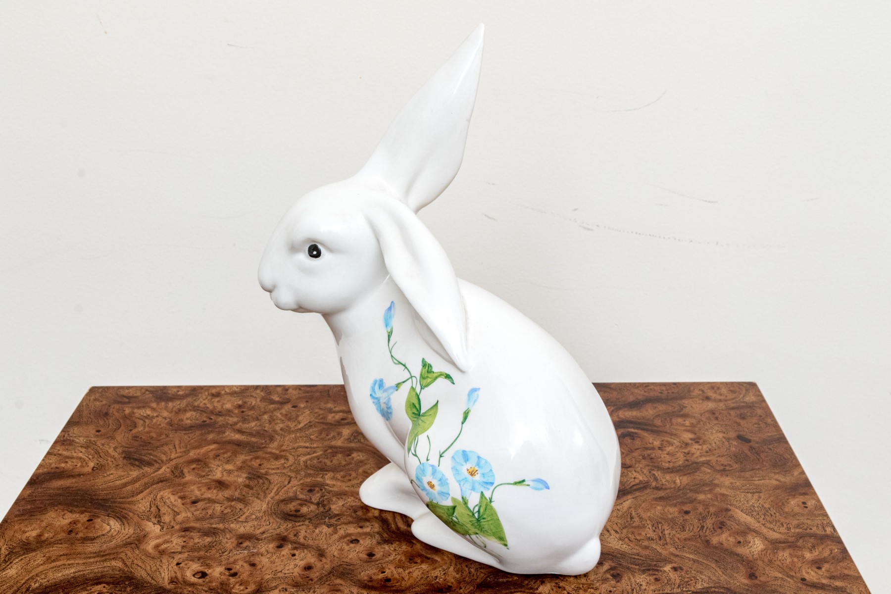 An adorable Italian Gump's ceramic figure of a seated rabbit posed with one ear perked, the other flopped over on its back. Decorated with blue flowers and green foliage on the side.