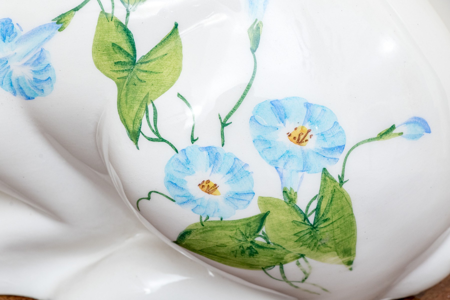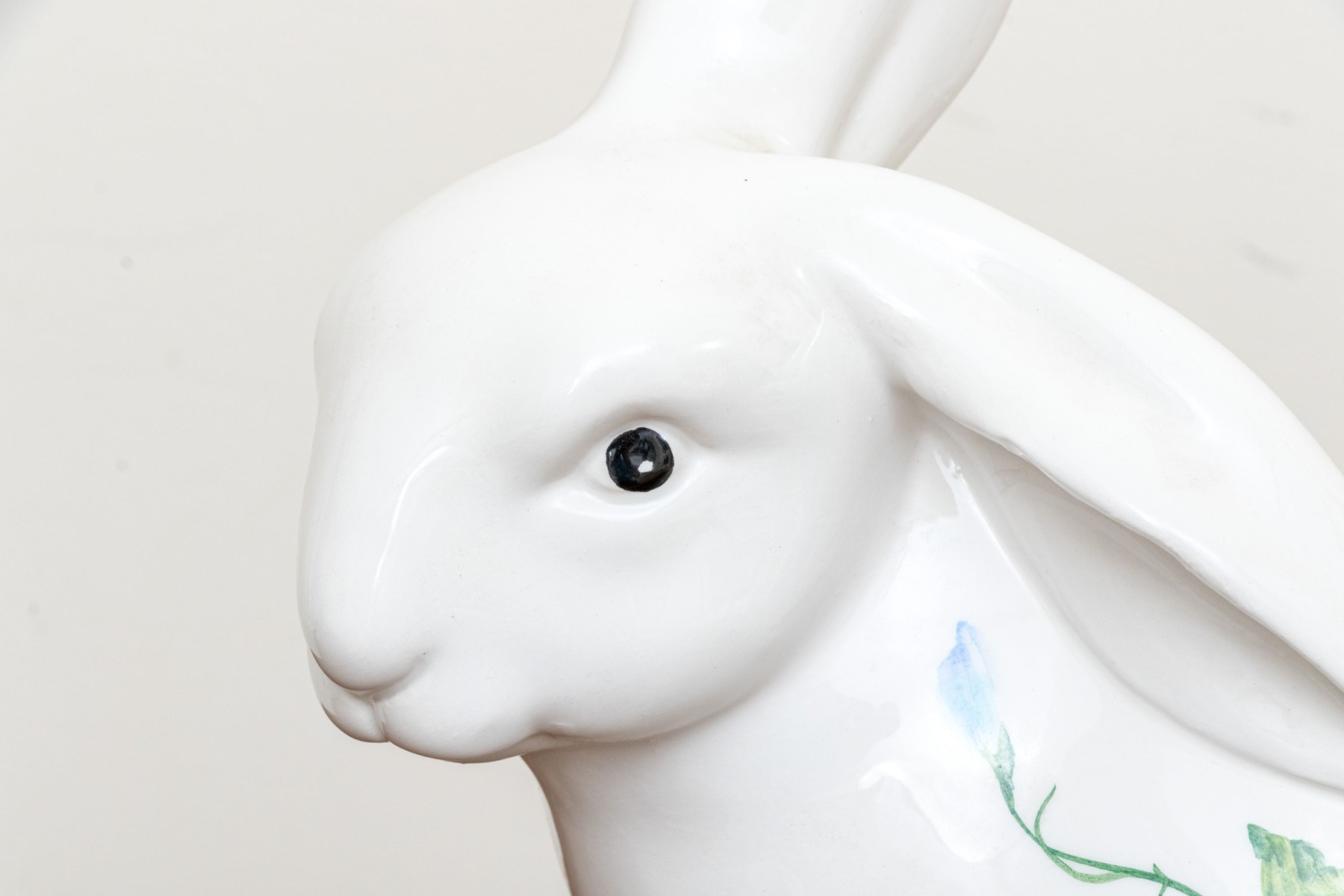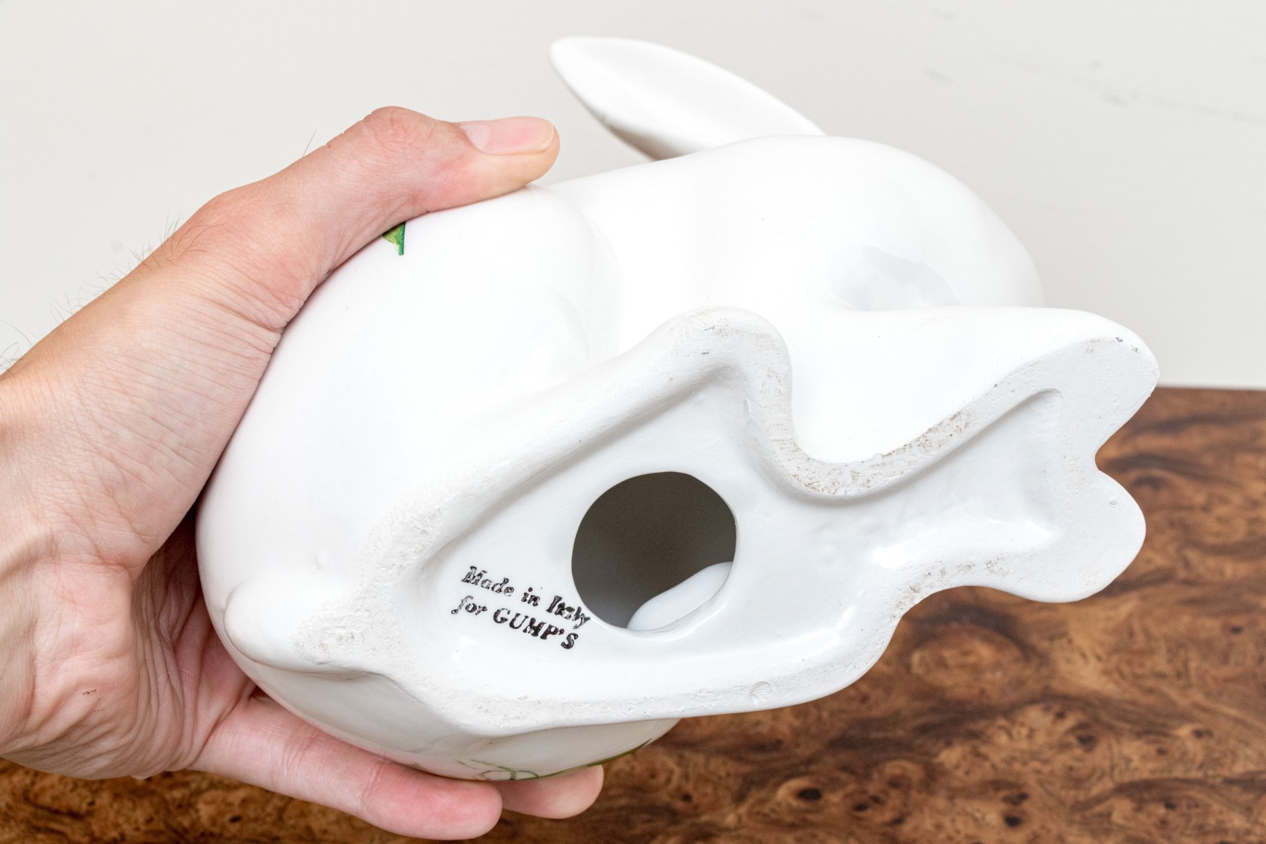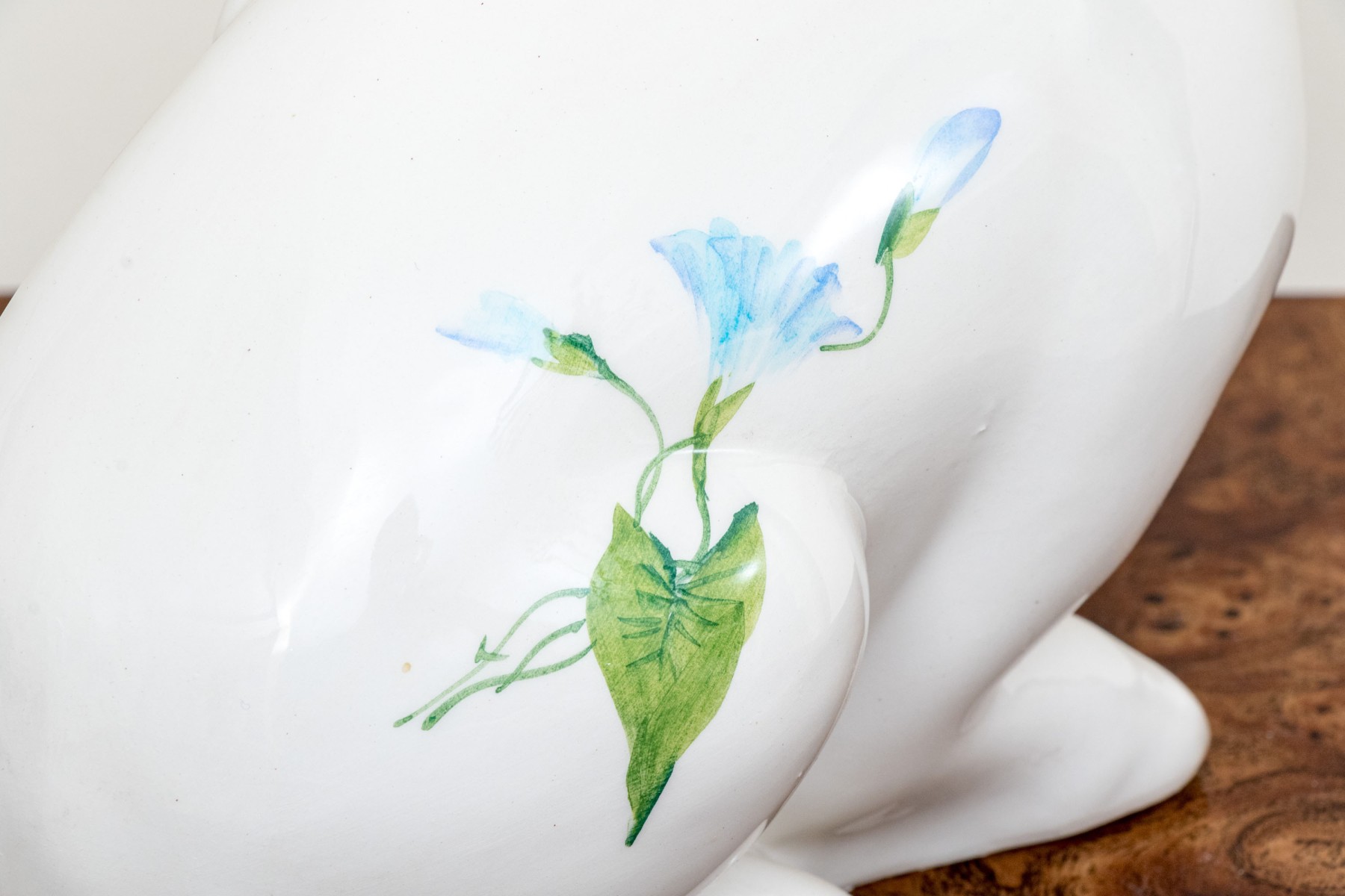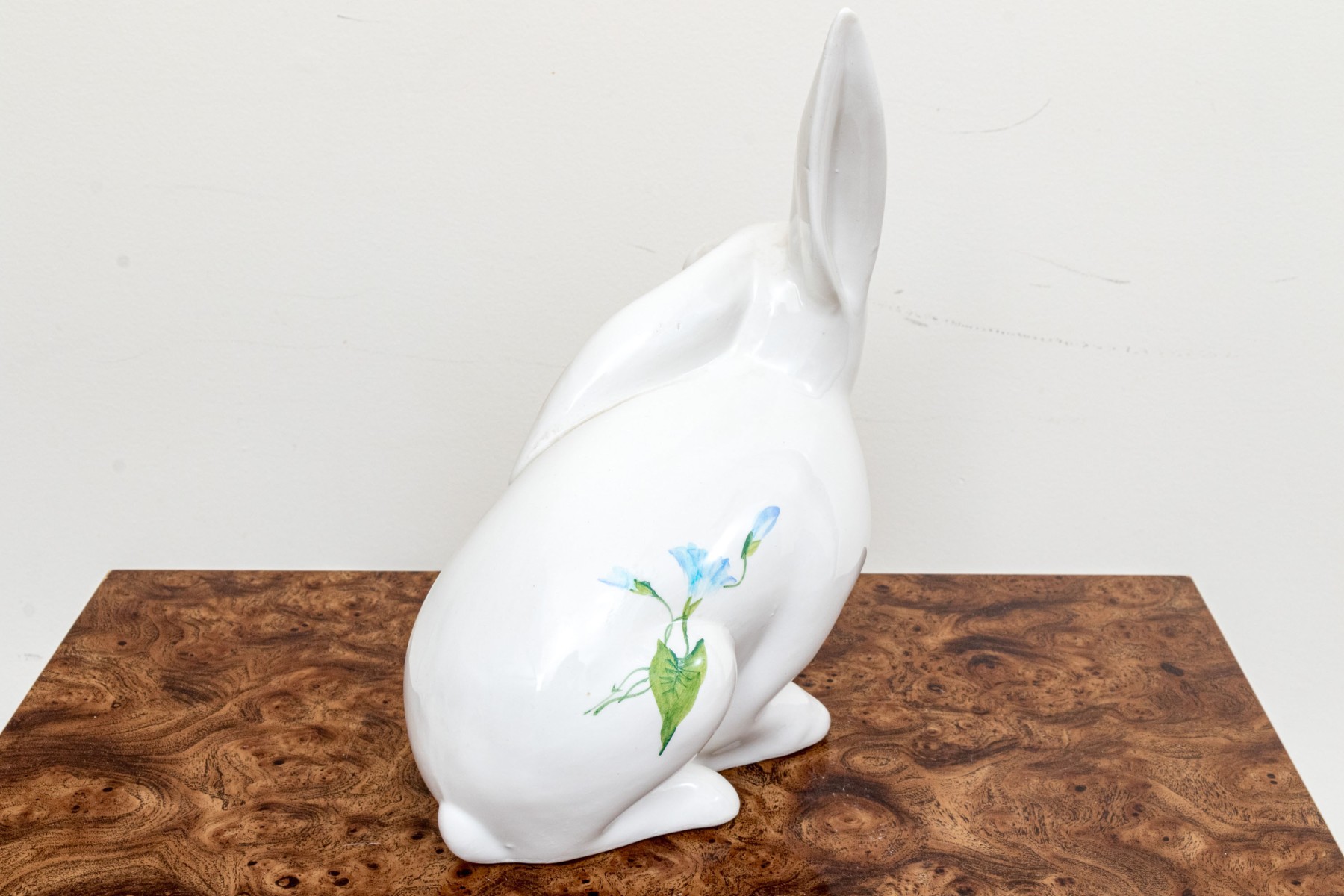 An adorable Italian Gump's ceramic figure of a seated rabbit posed with one ear perked, the other flopped over on its back. Decorated with blue flowers and green foliage on the side.