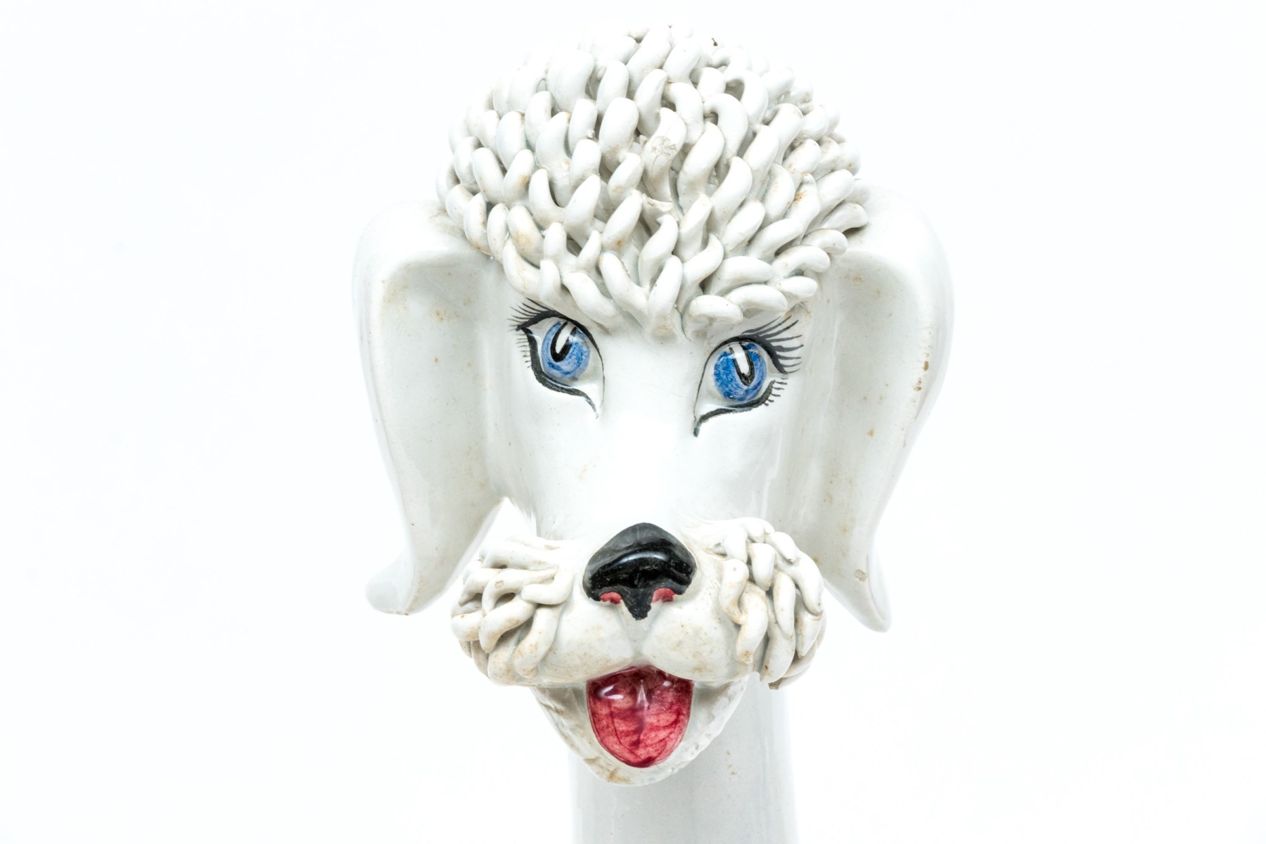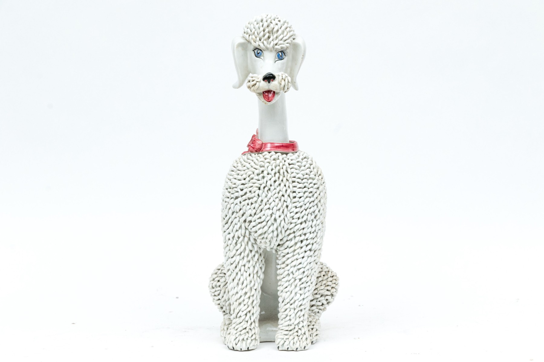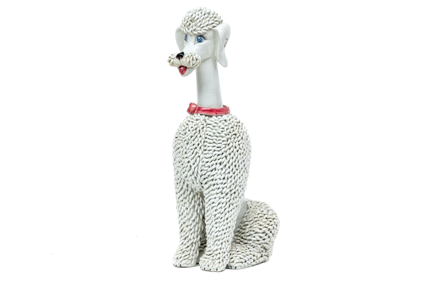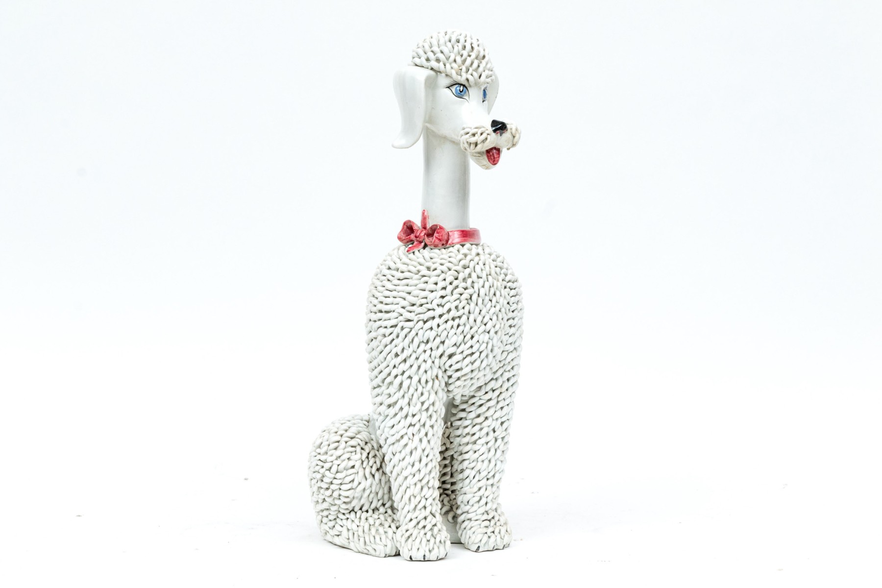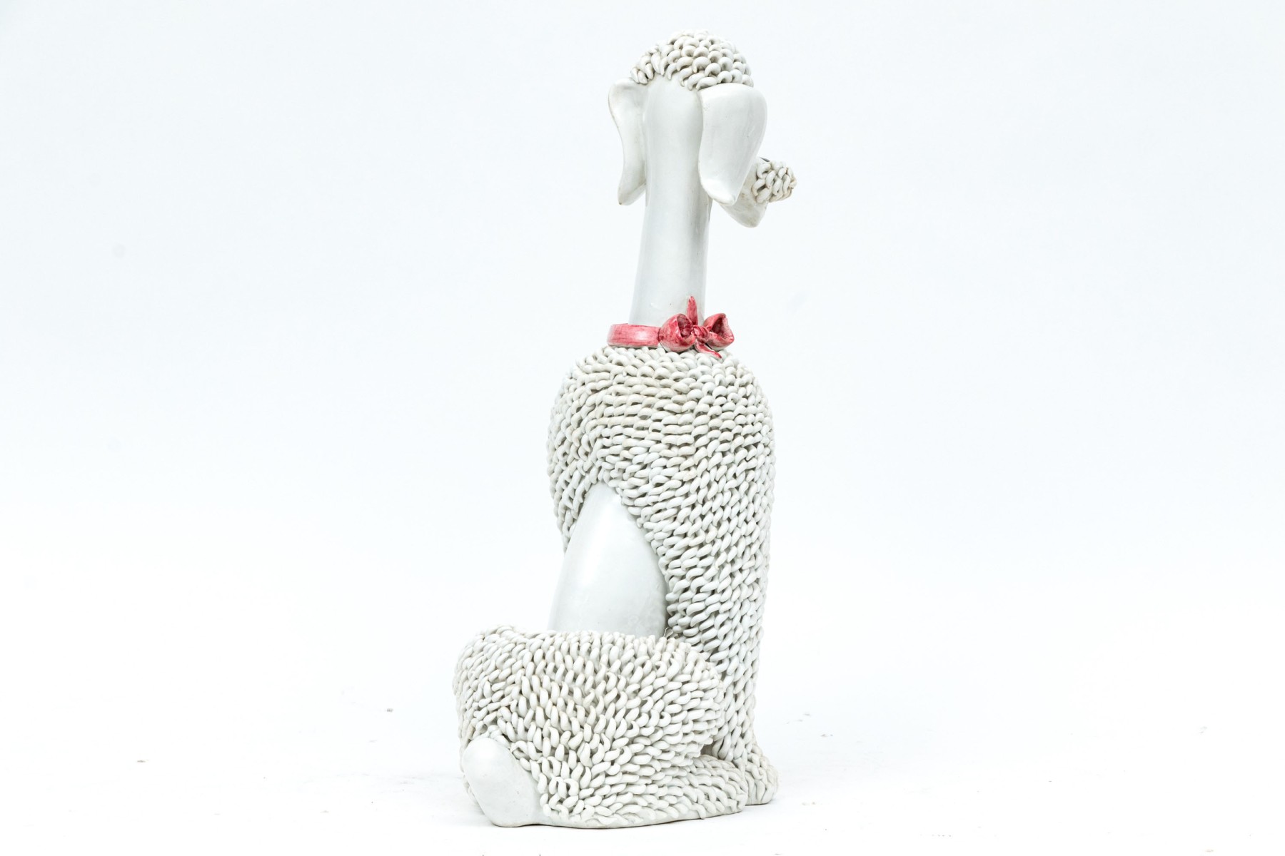 A wonderful tall white seated poodle with its fur articulated in curls overall and with painted details including its cute pink collar with a bow.