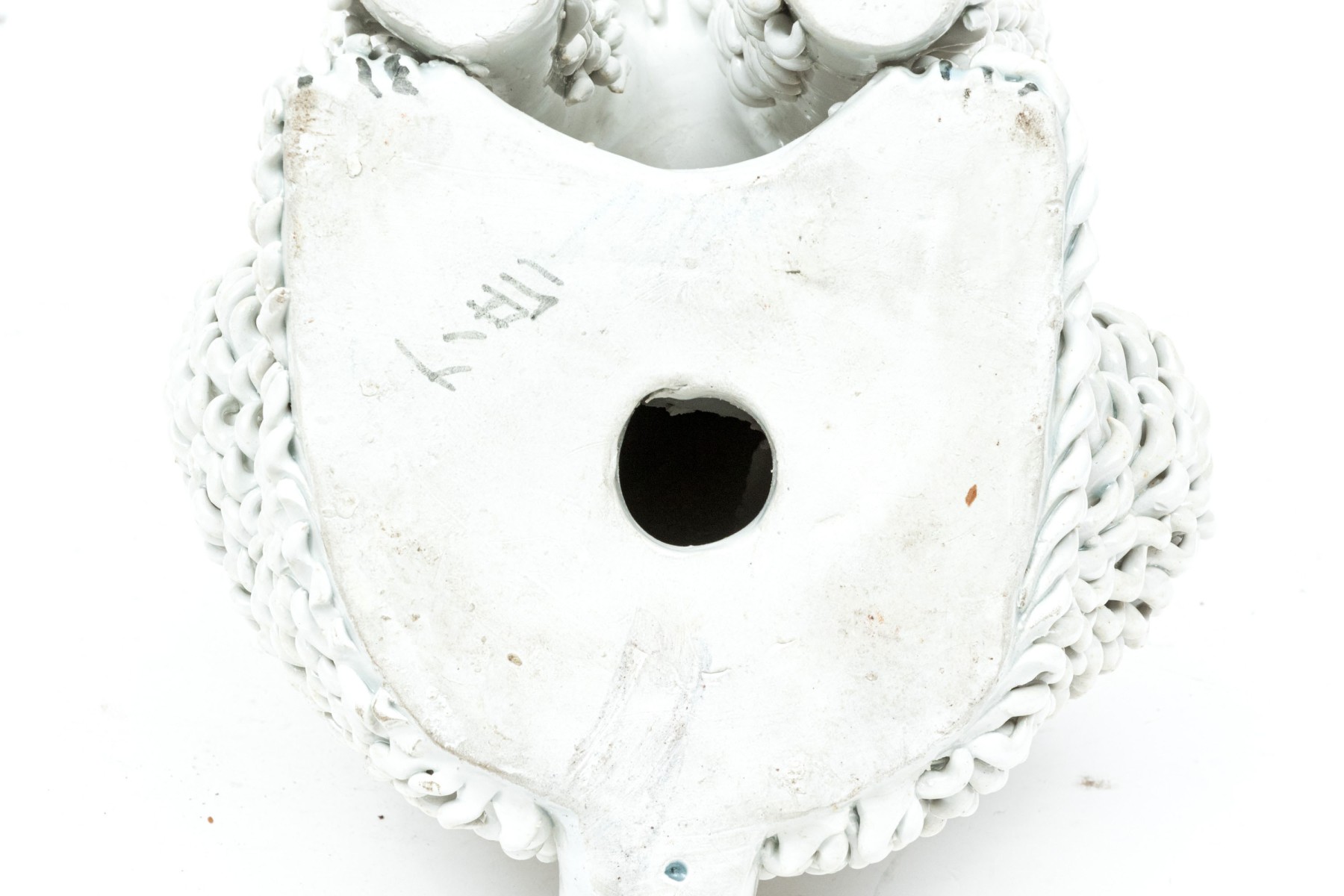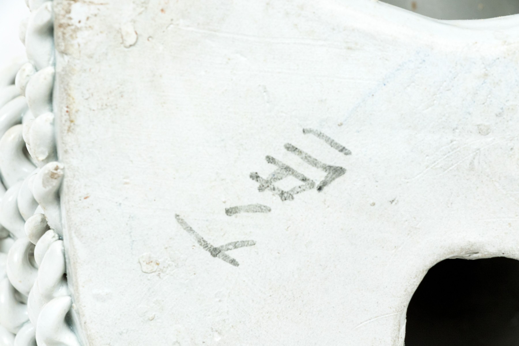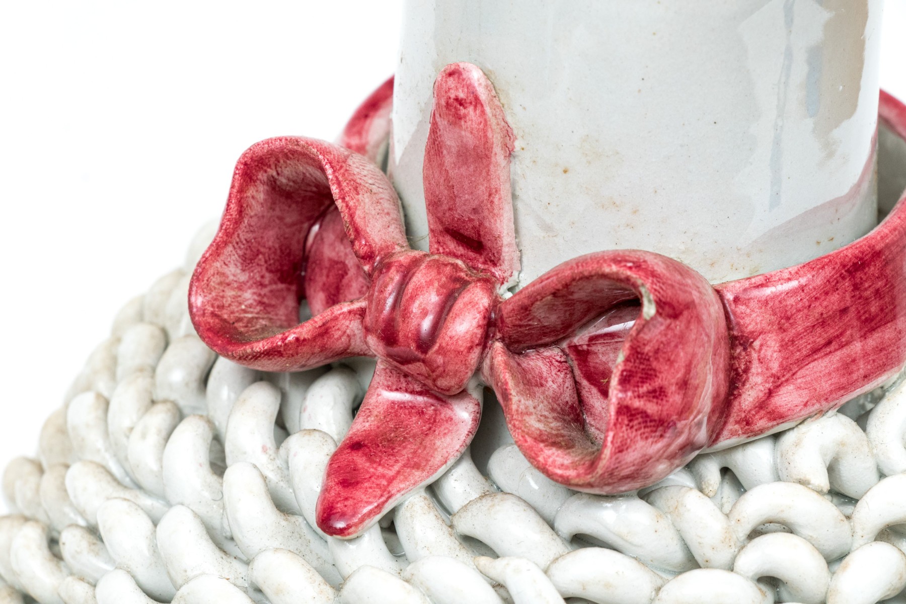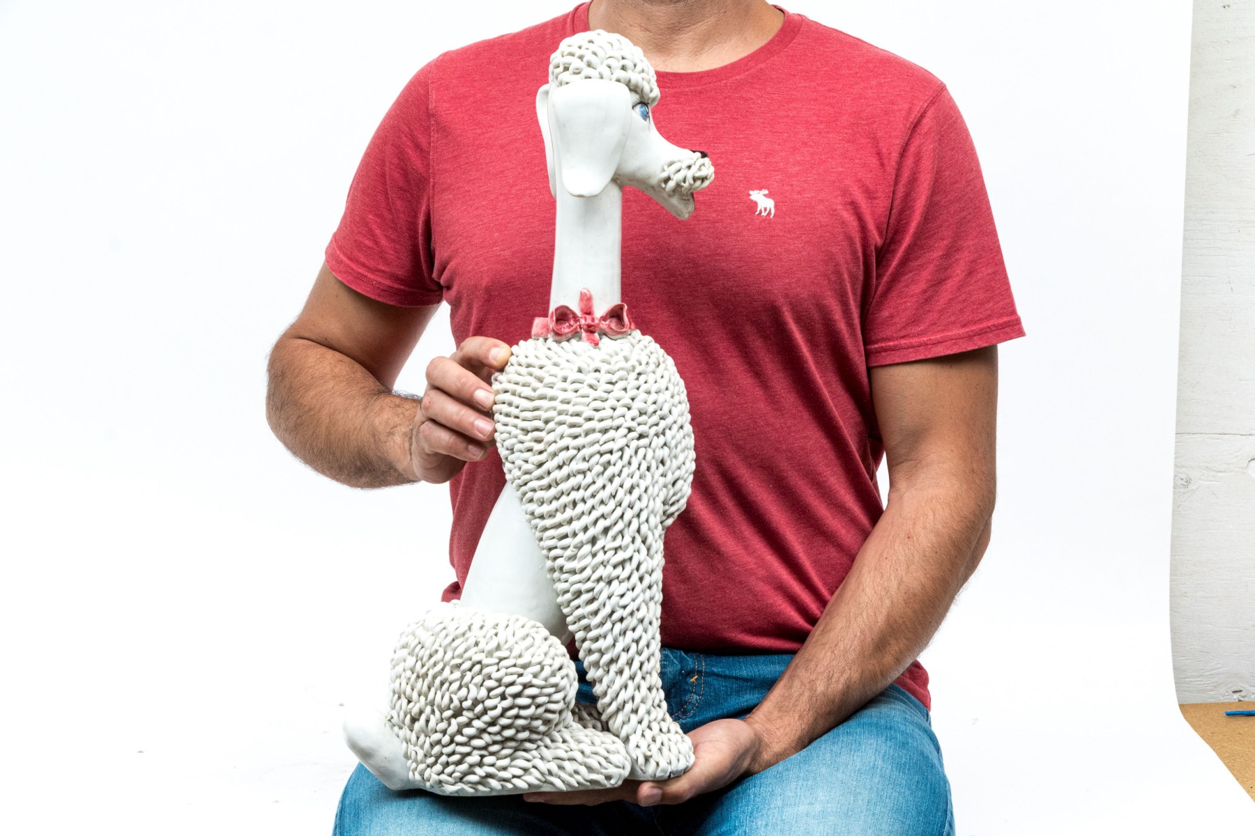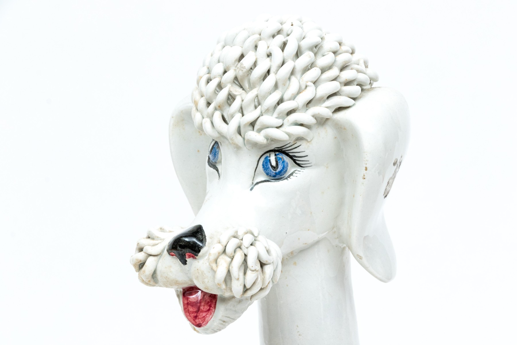 A wonderful tall white seated poodle with its fur articulated in curls overall and with painted details including its cute pink collar with a bow.