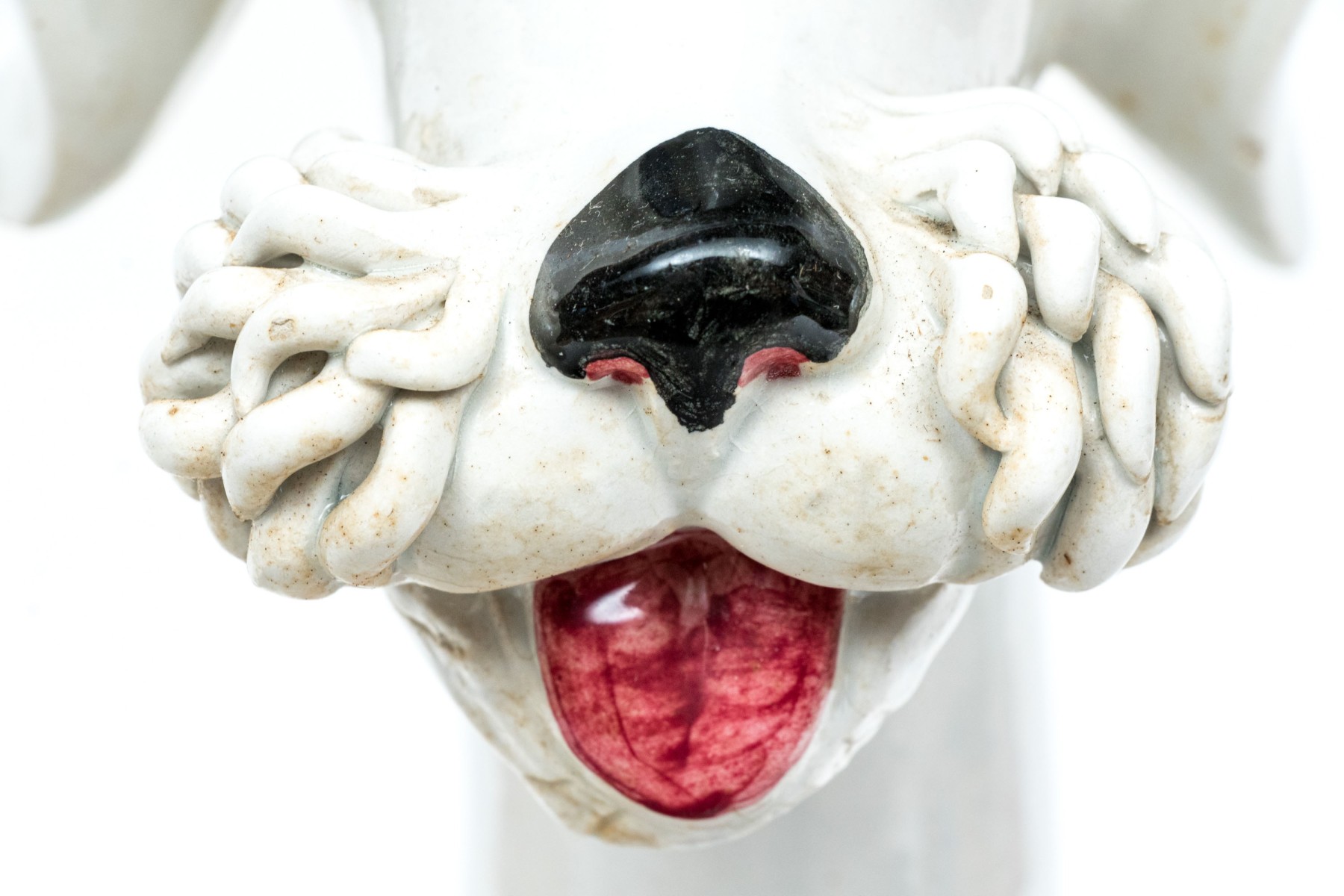 In overall good form. There is a chip to the top of one of the moulded hair curls on the dogs back. Overall presents very handsomely. See lot images.