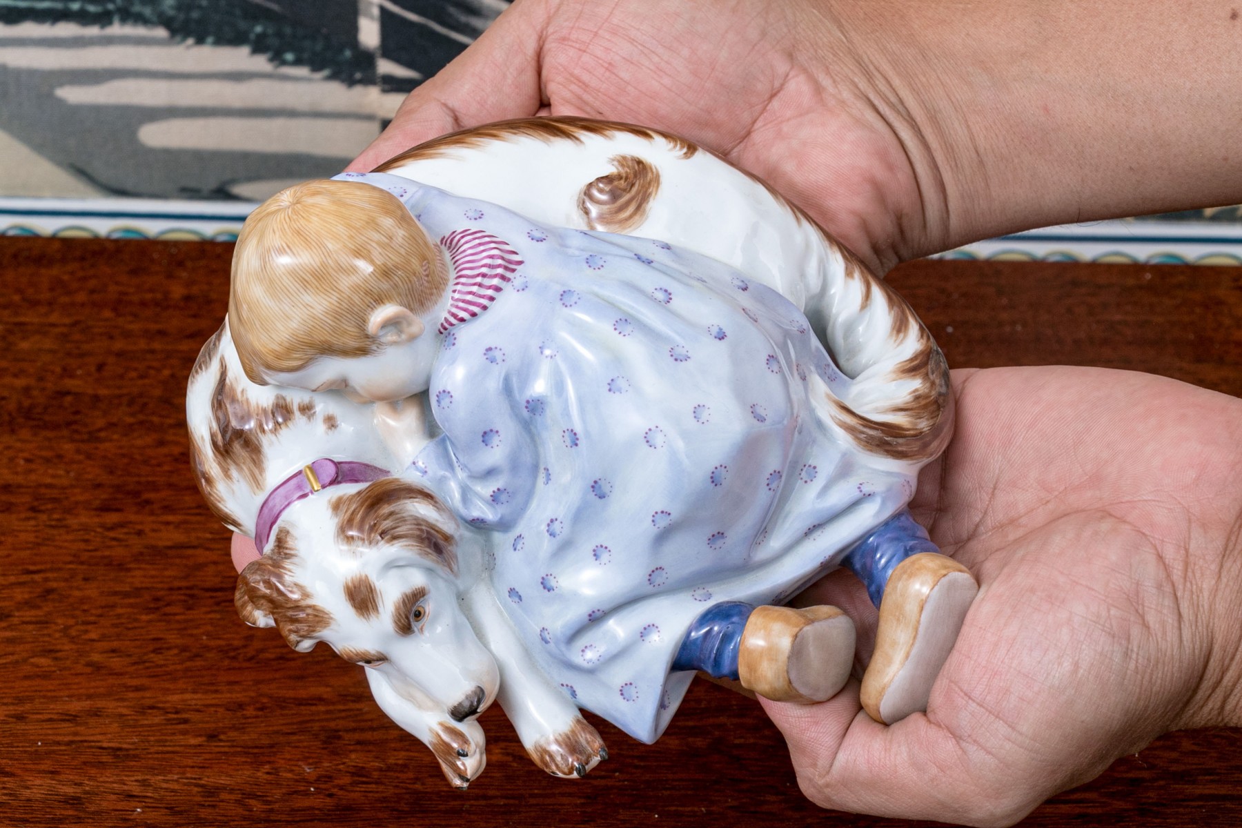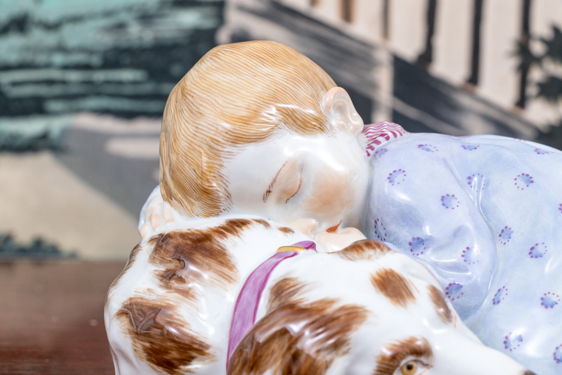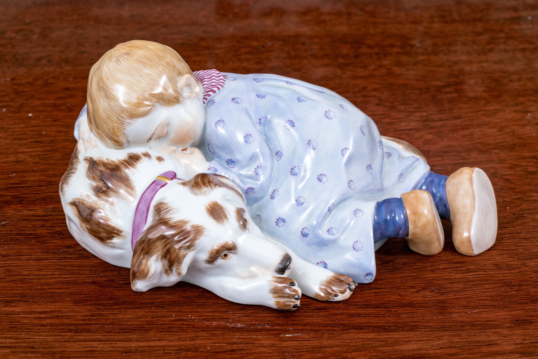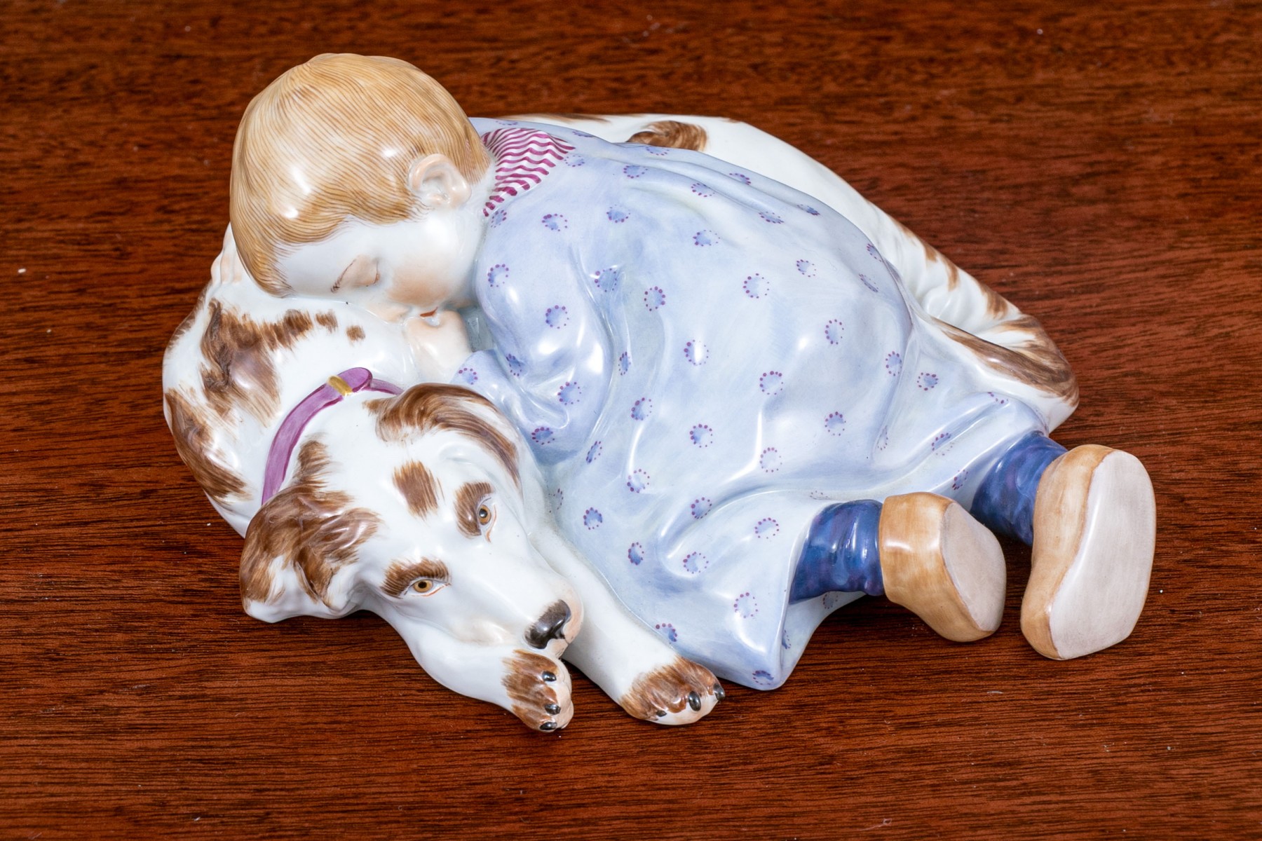 Adorable Meissen Porcelain Young Boy Resting With Dog Figure bearing blue mark on bottom.