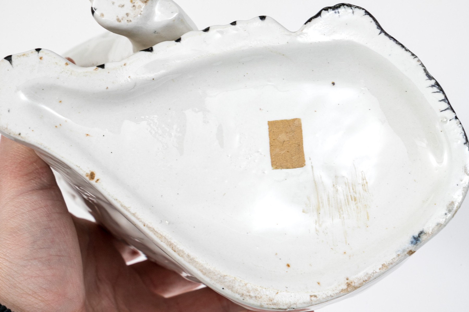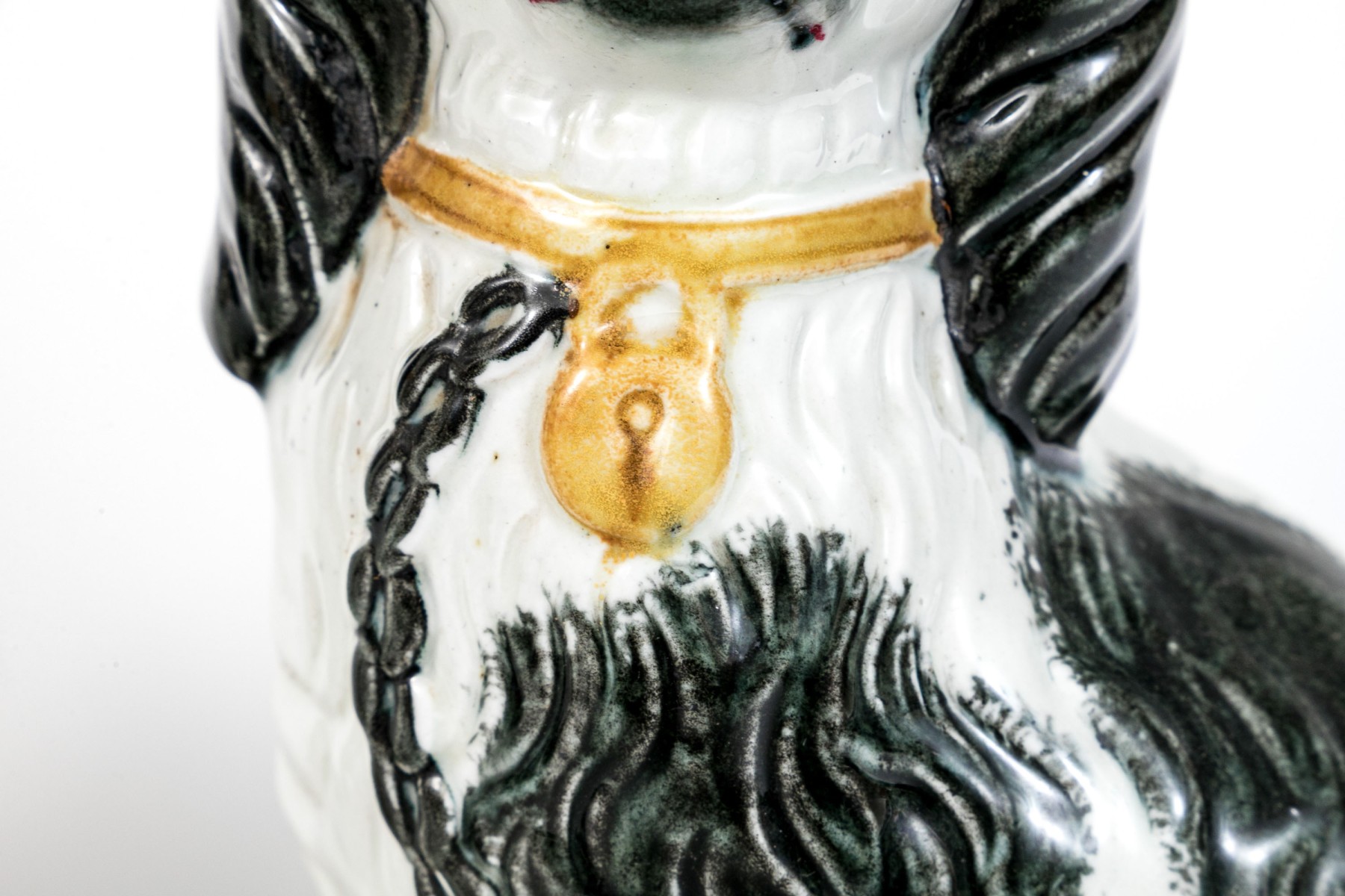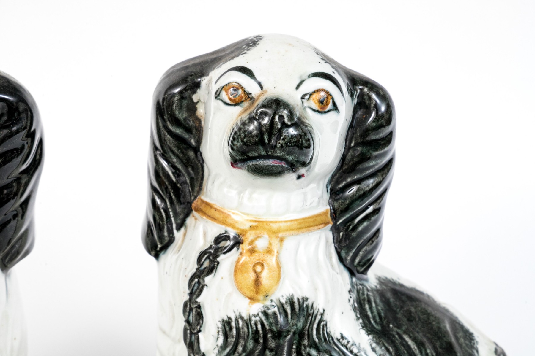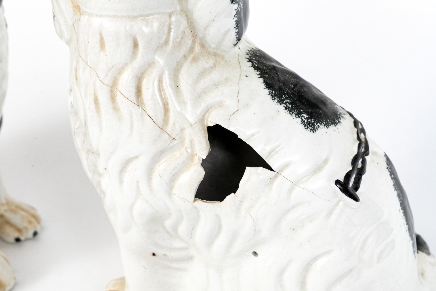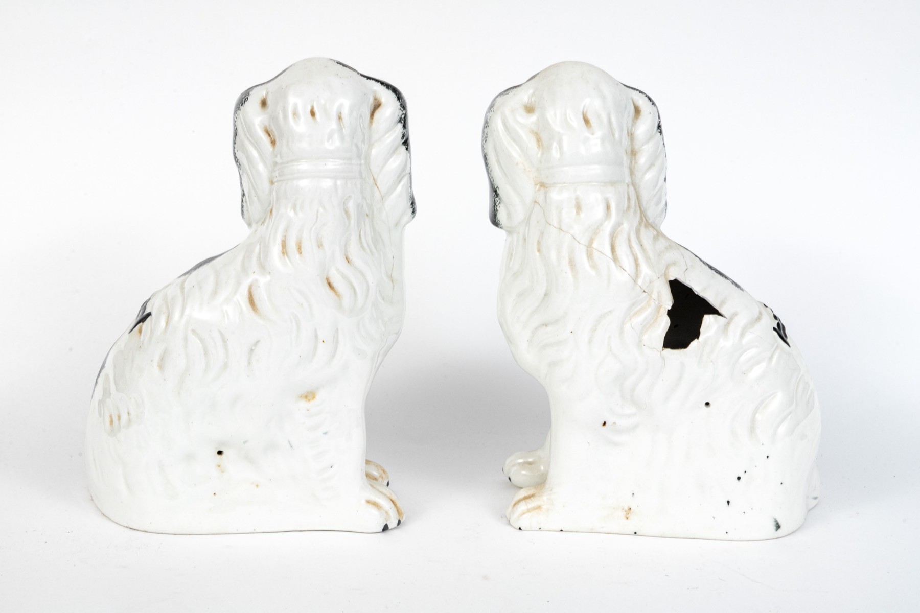 Condition: There is wear to the finish and dirt spots with crackled glaze and surface scuffing around the noses where the muzzle meets the eyes. There is a hairline ffracture to the body of one which wraps around its back from one shoulder to the opposite shoulder. When handled one of the dogs sounds as if there is a piece of dried ceramic that has broken off and rattles around the inside. Despite wear commensurate with age and handling, the dogs presents nicely. See lot images for further visual inspection as they are considered part of the lot condition report.