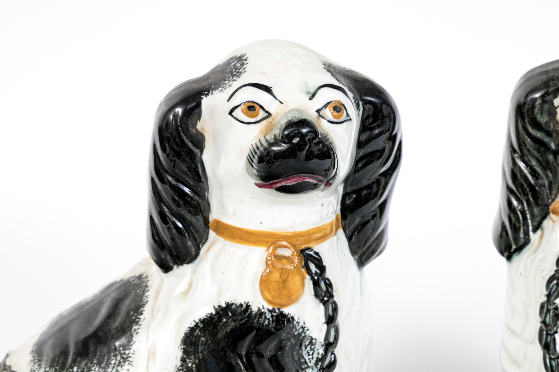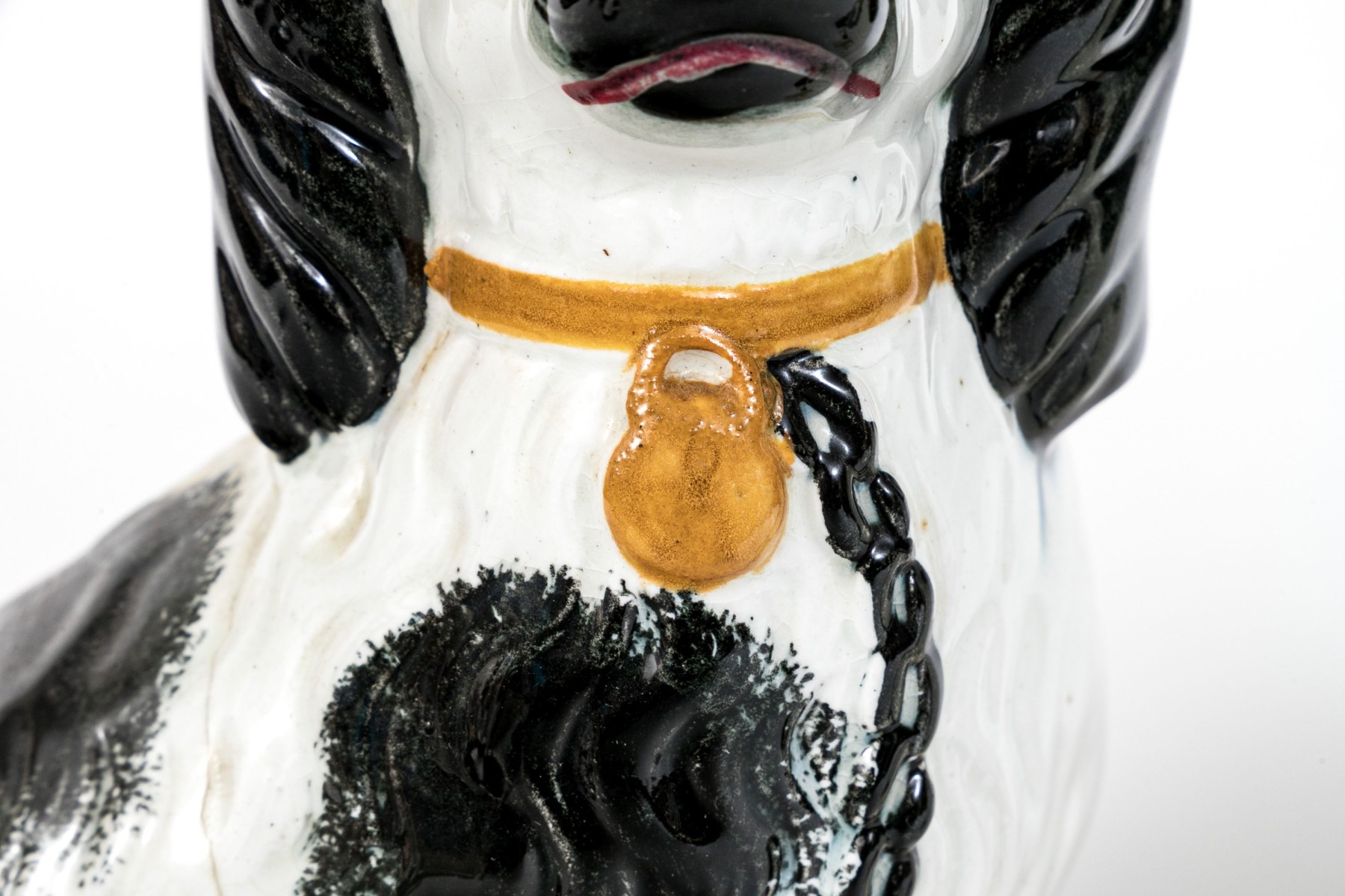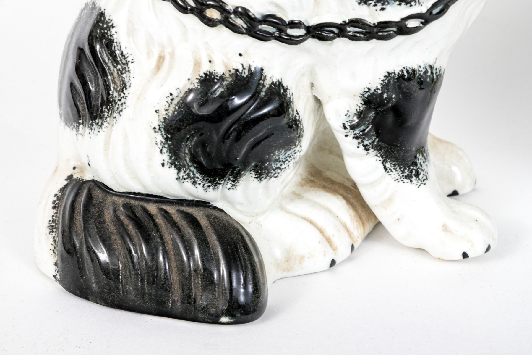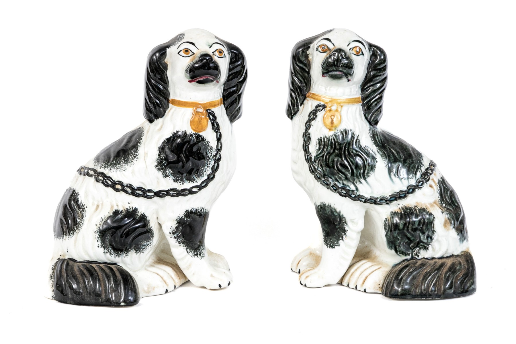 Both wonderfully hand painted and formed as seated in opposed form. Both spaniels have black spots including to the ears and tails. Both have yellow finished collars with locks holding their black finished chain link leashes.