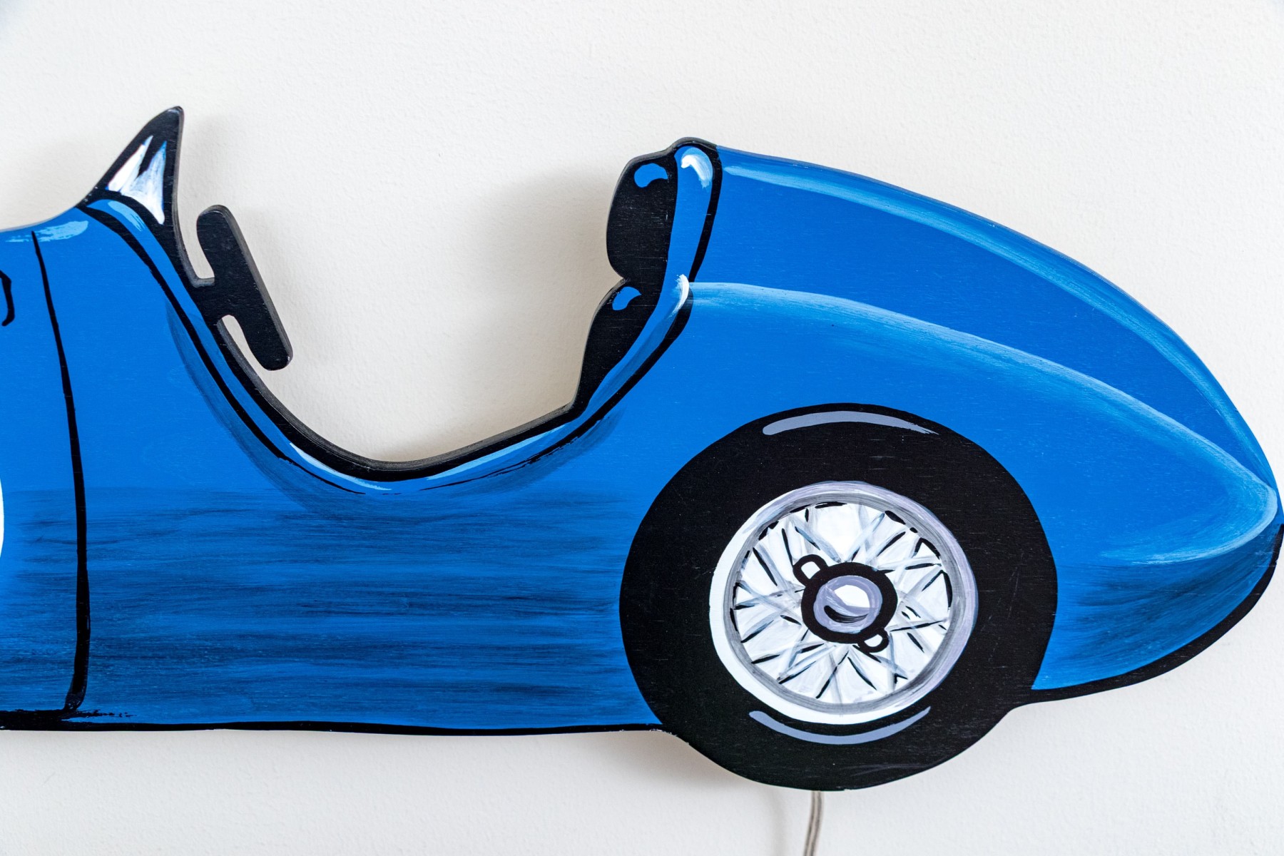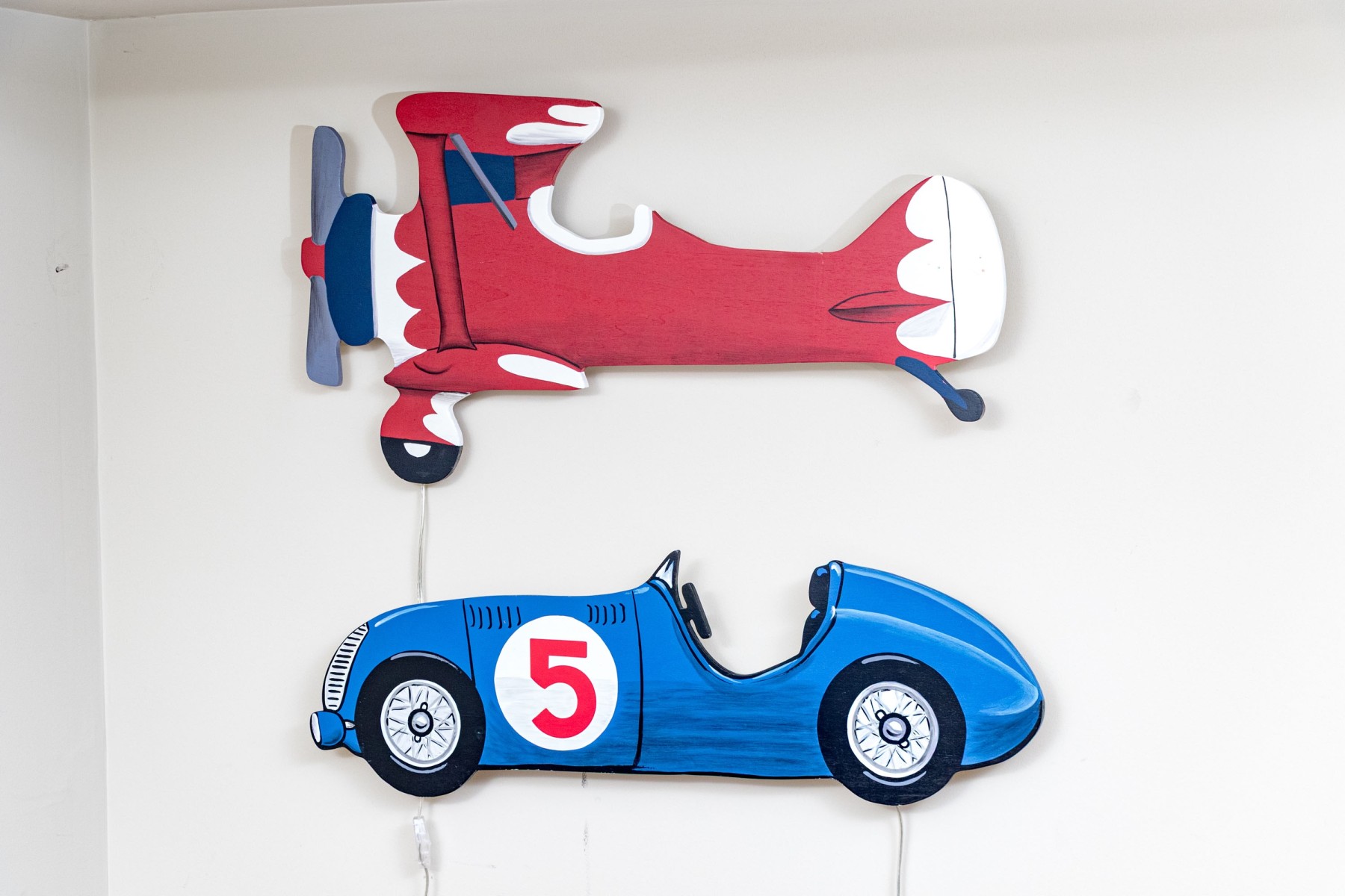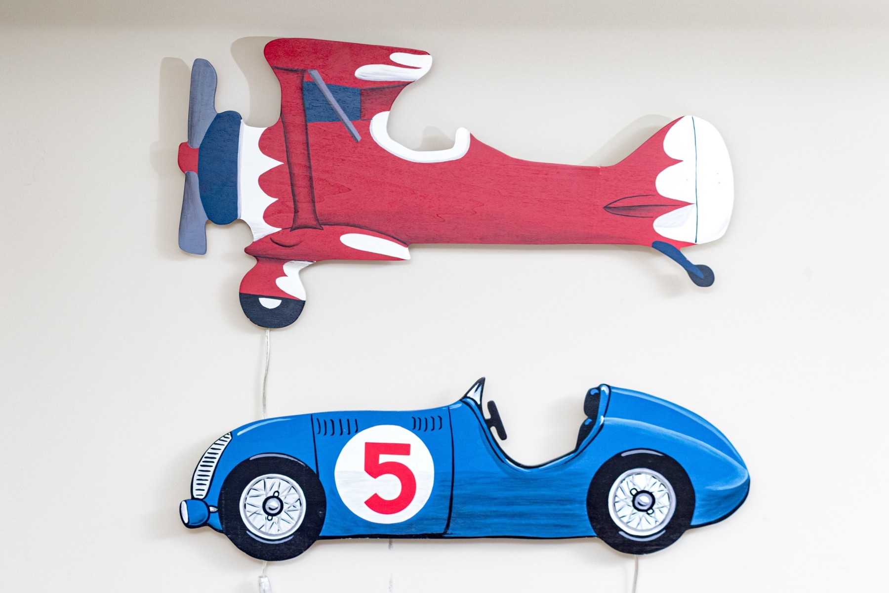 An adorable duo of vehicle themed nightlights. One in the form of a antique blue racer with the number 5 in red in a white reserve, together with a red propeller plane with white finished accents including tail, and around the wings and cockpit.