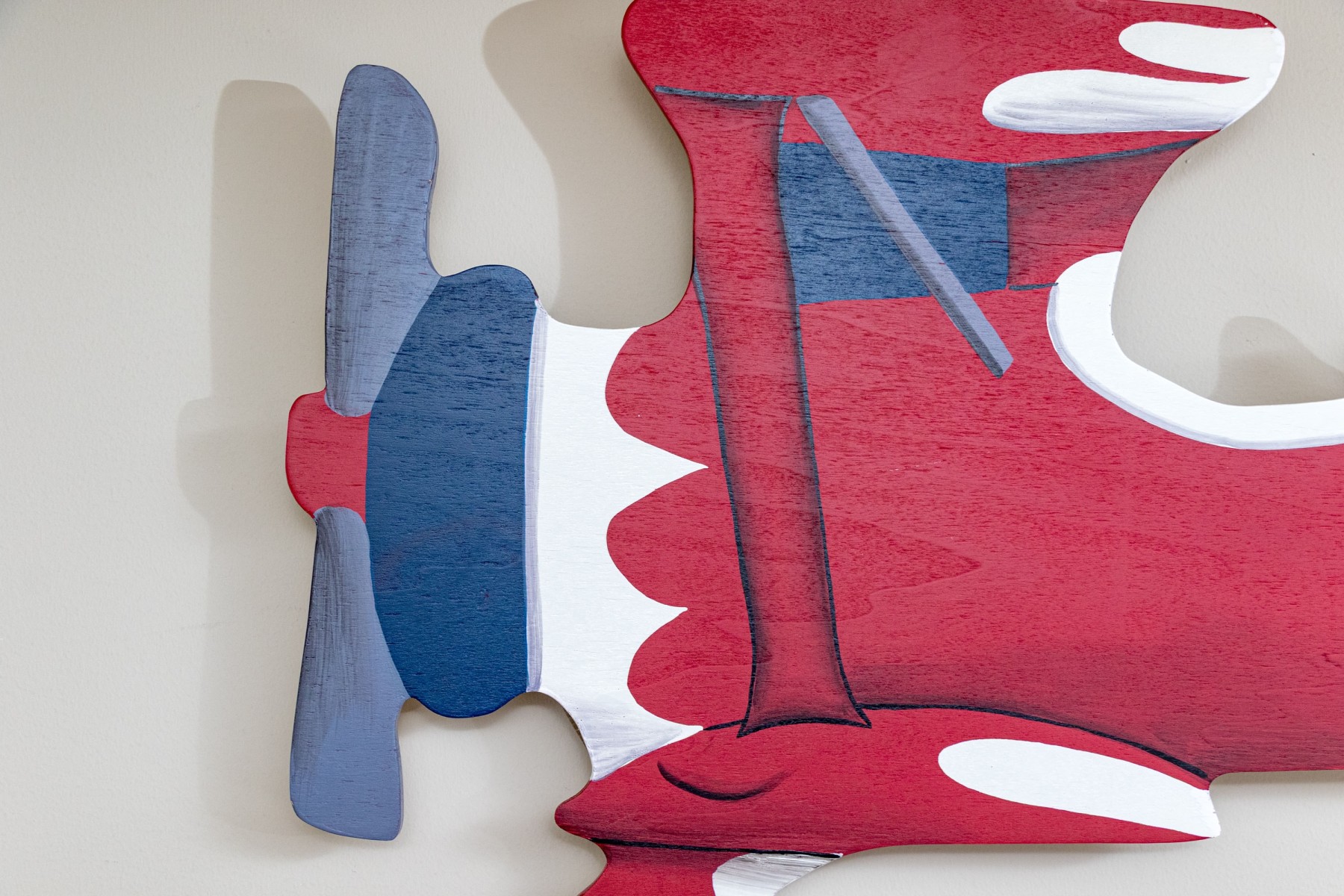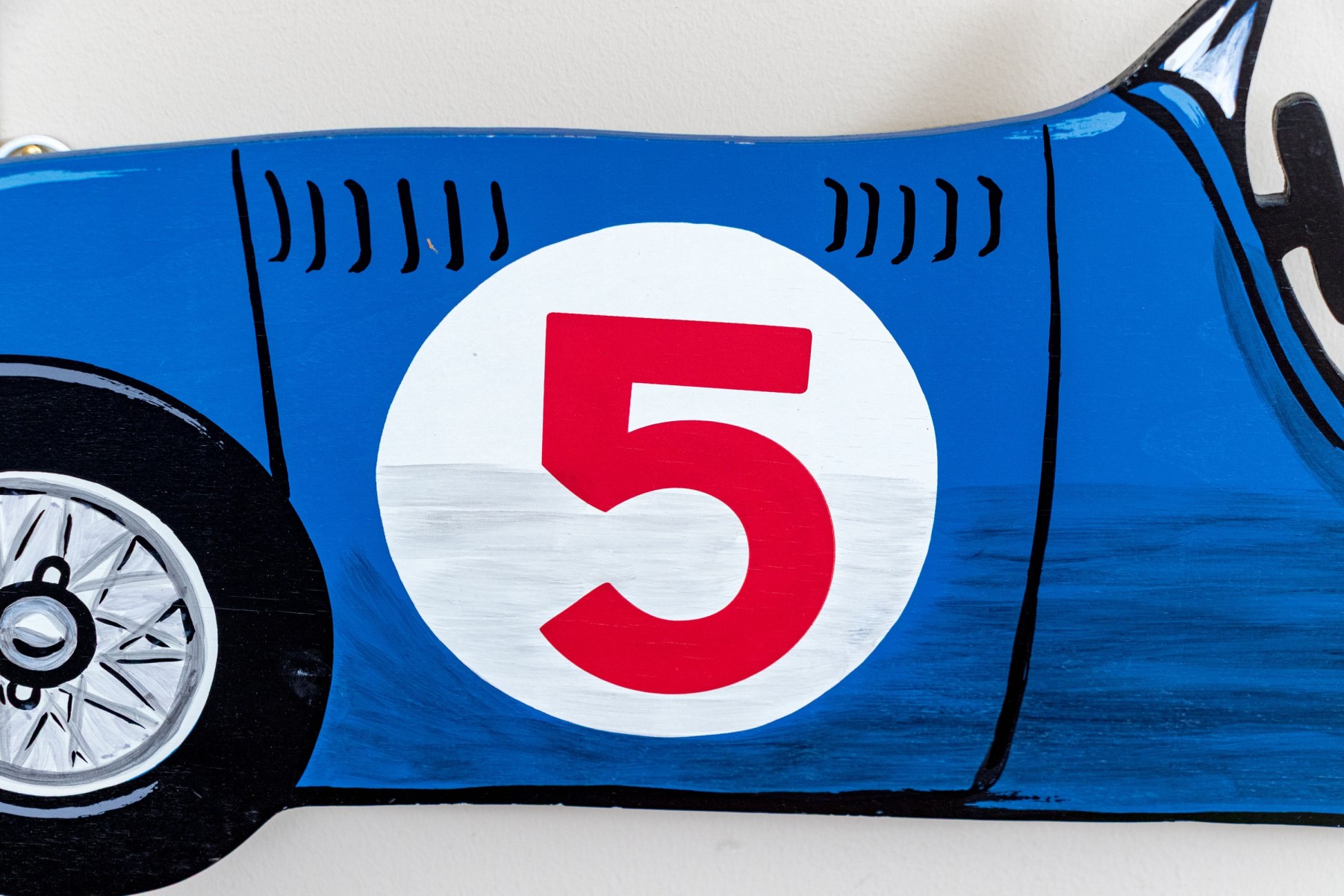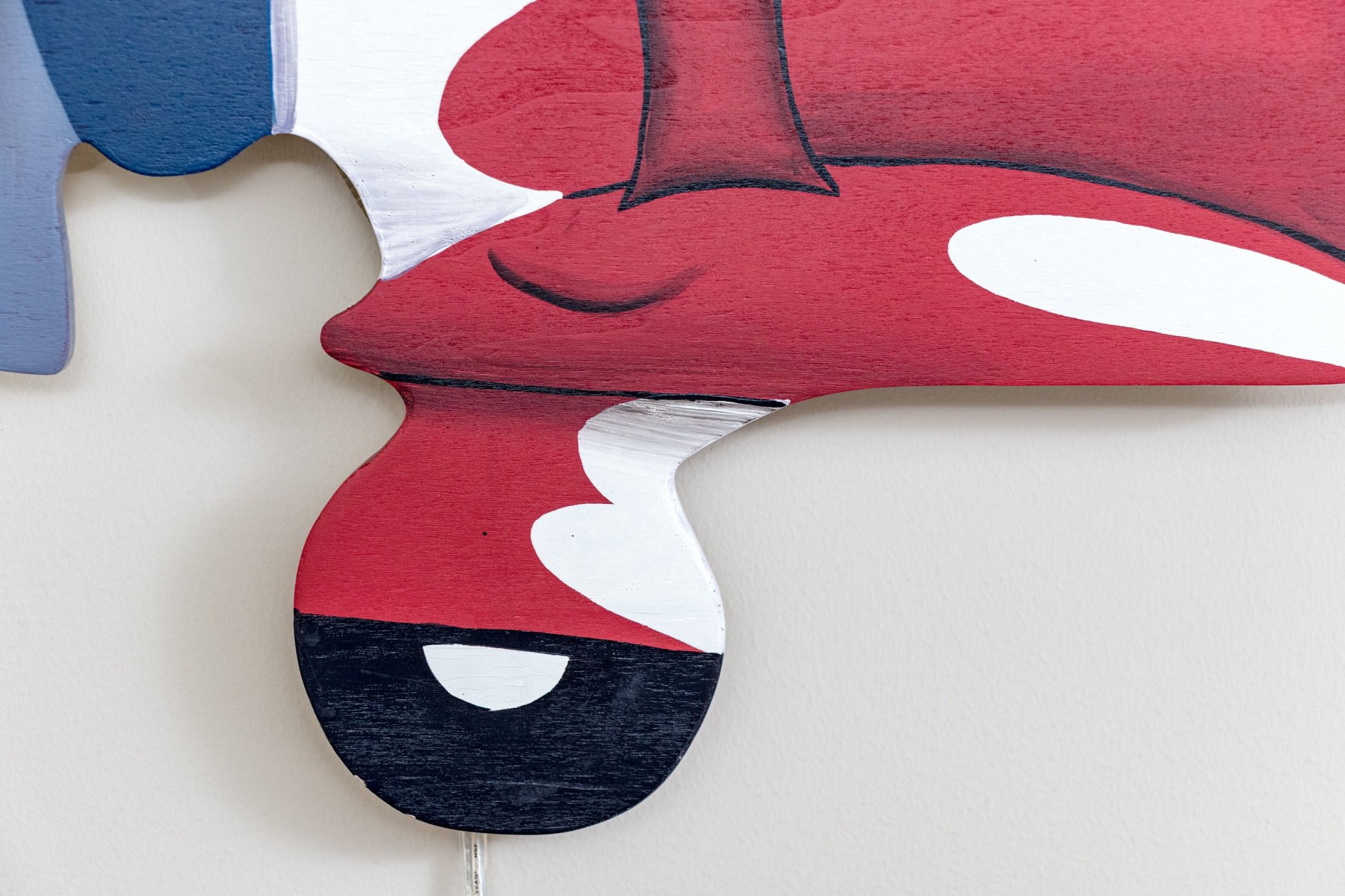 An adorable duo of vehicle themed nightlights. One in the form of a antique blue racer with the number 5 in red in a white reserve, together with a red propeller plane with white finished accents including tail, and around the wings and cockpit.