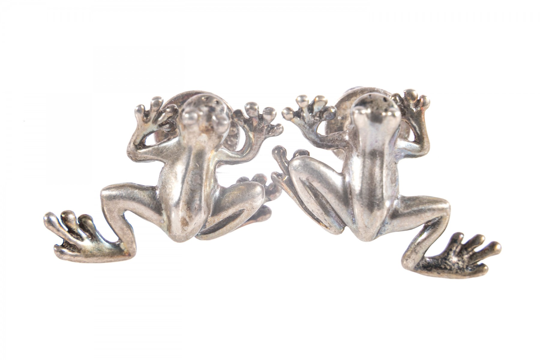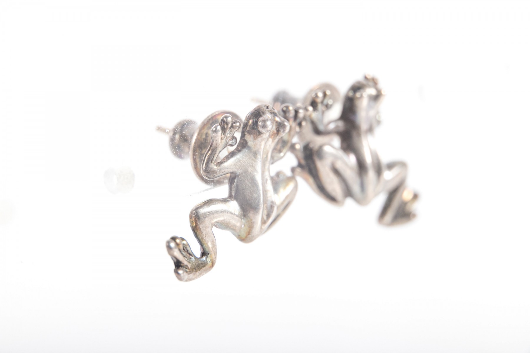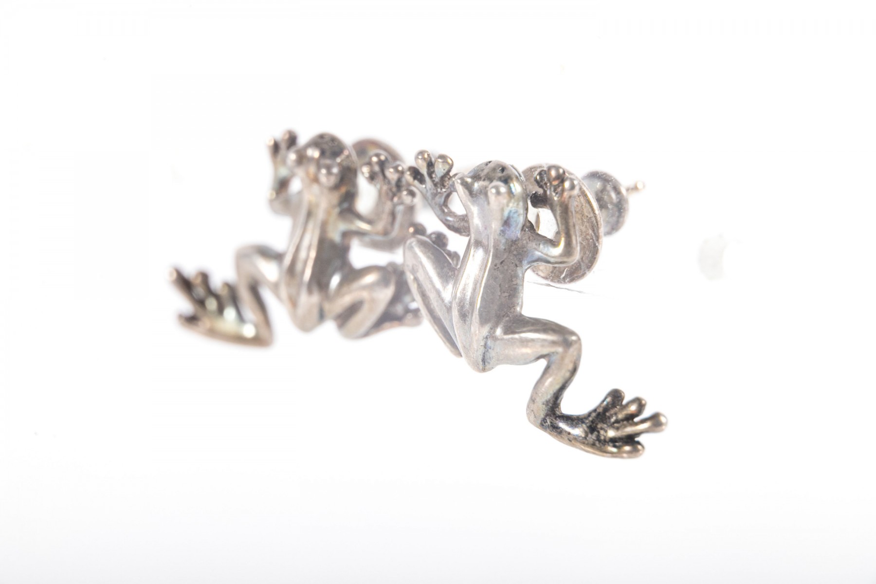 An adorable pair of sterling silver studs displaying frogs with tiny splayed fingers and a gently ridged body in a climbing position.