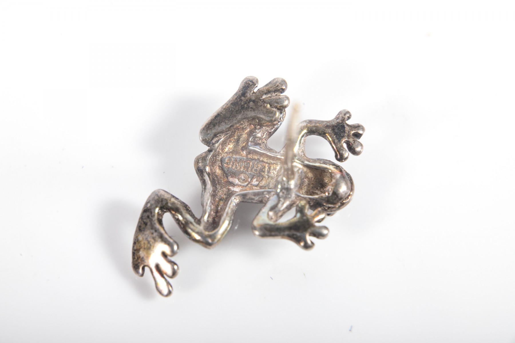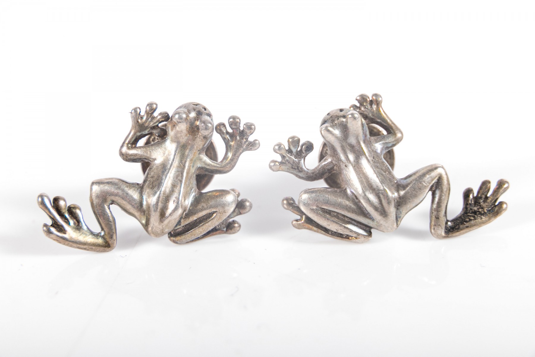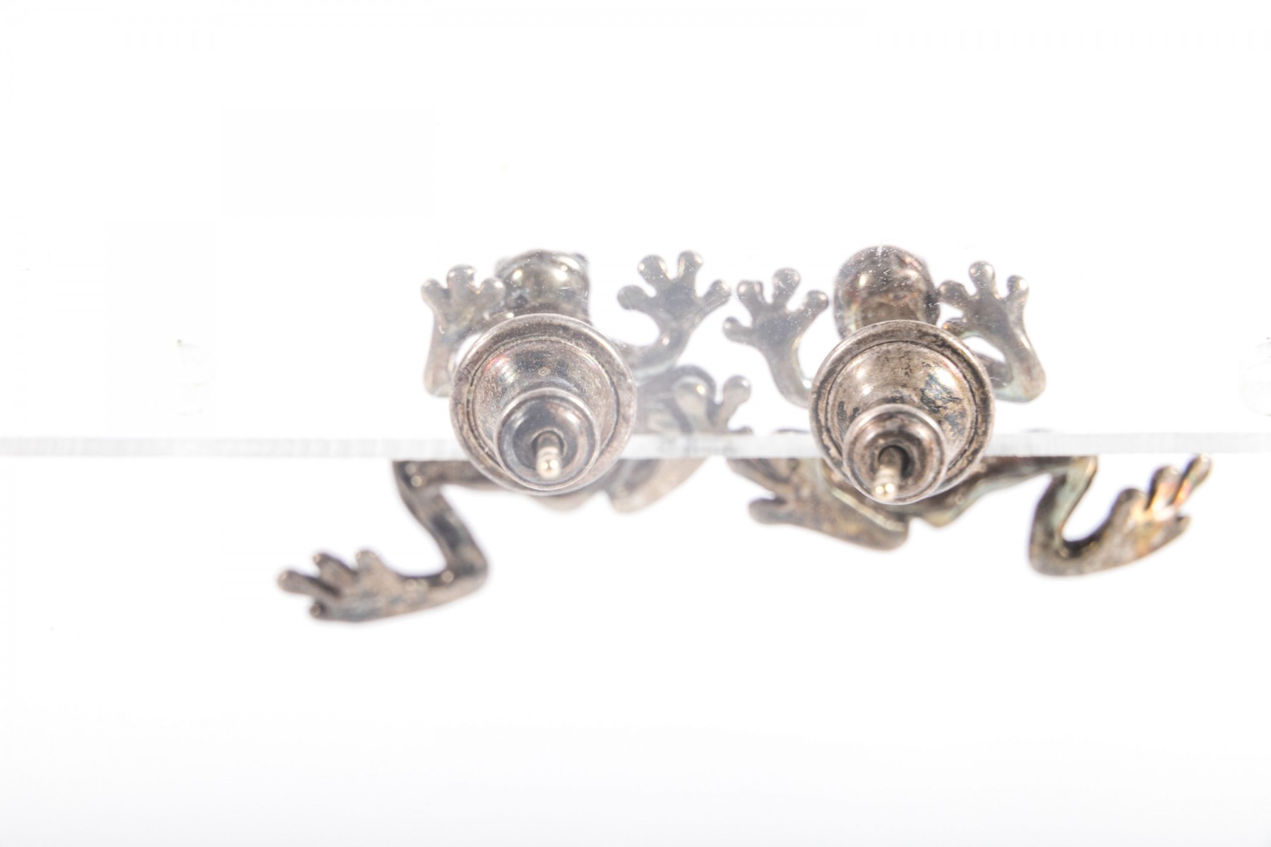An adorable pair of sterling silver studs displaying frogs with tiny splayed fingers and a gently ridged body in a climbing position.