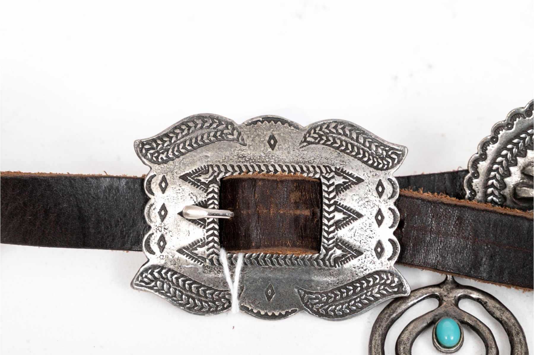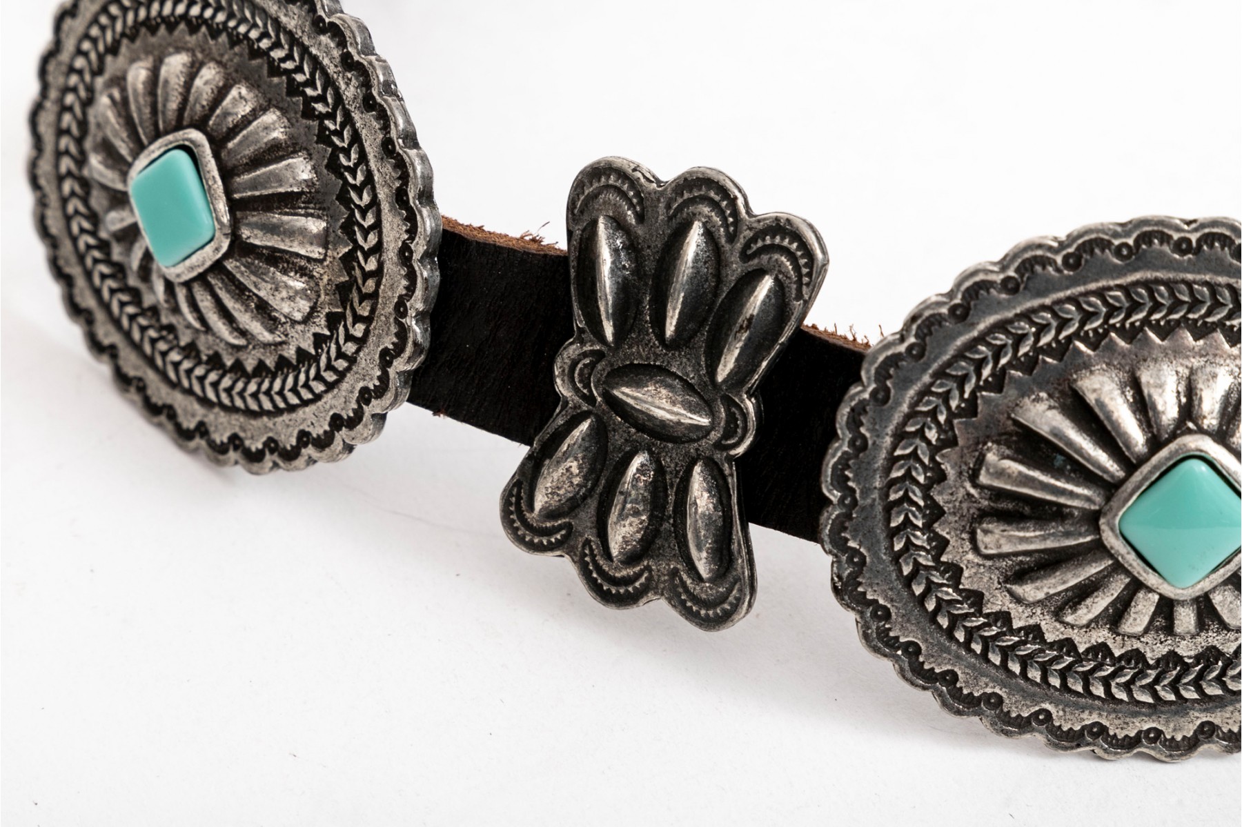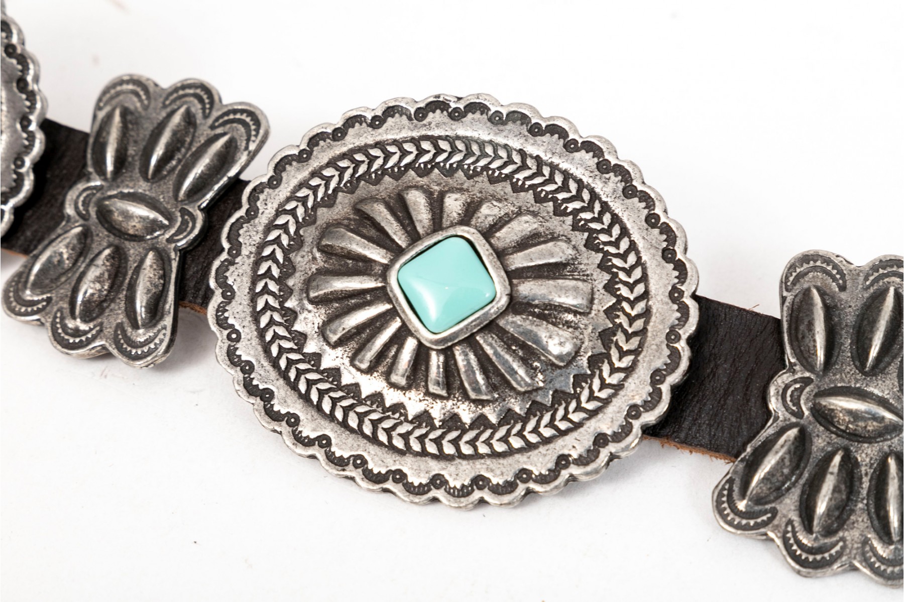 A striking southwestern inspired leather belt. Set into the belt are dyed howlite stones.. buckle clasp.