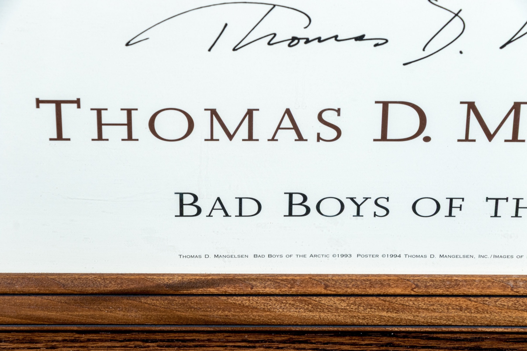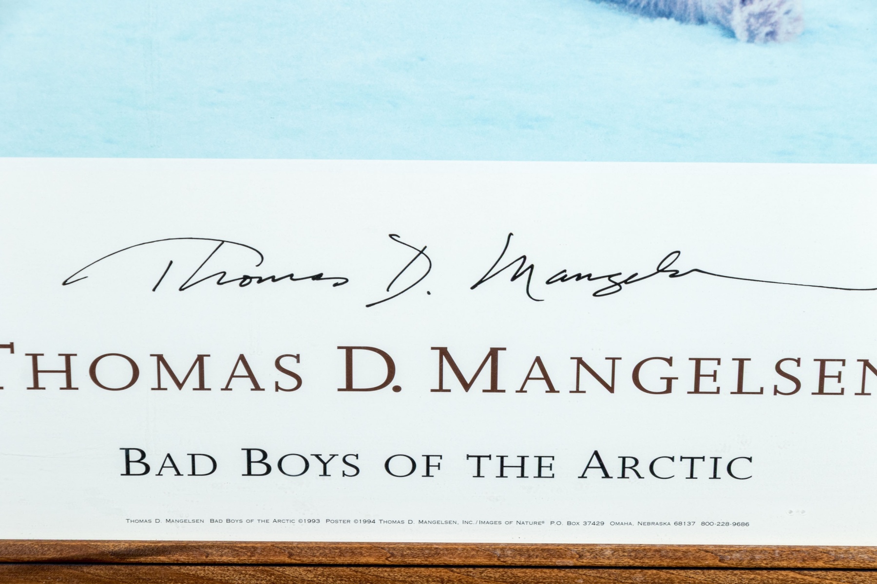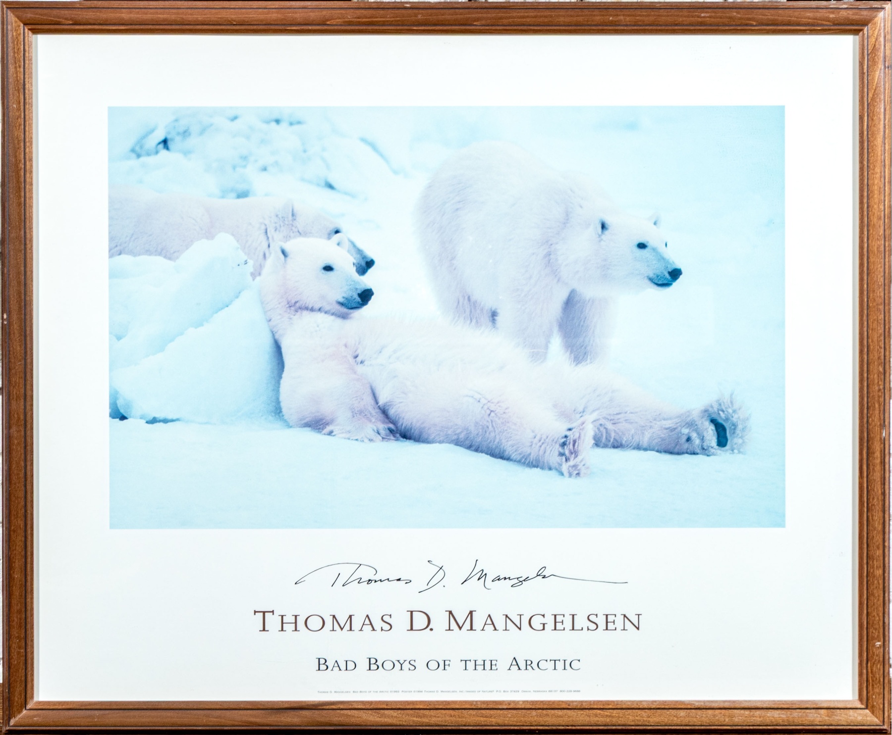 A charming advertisement print For Thomas D. Mangelsen (American, b. 1946) "Bad Boys Of The Arctic" depicting a group of three polar bears relaxing in an icy landscape with a cool blue tint.