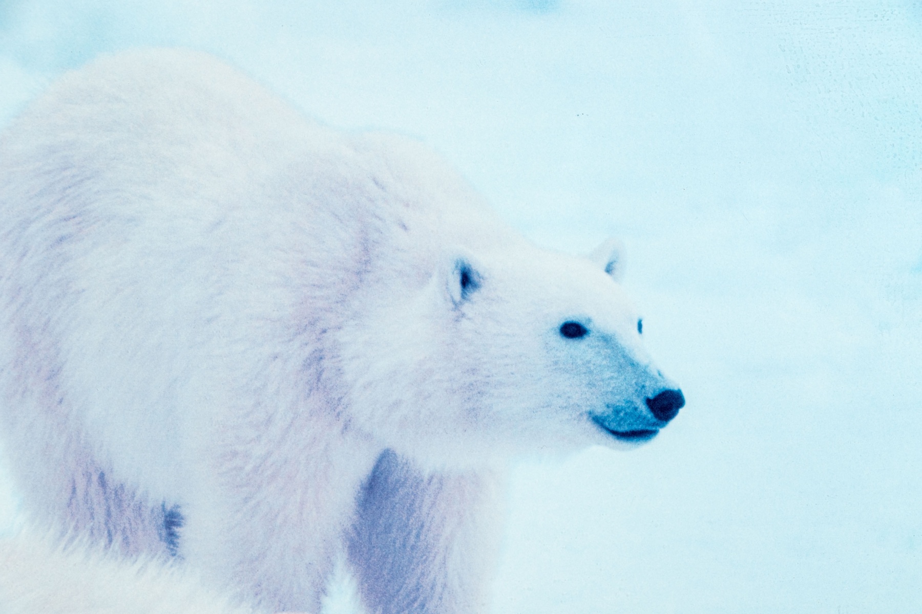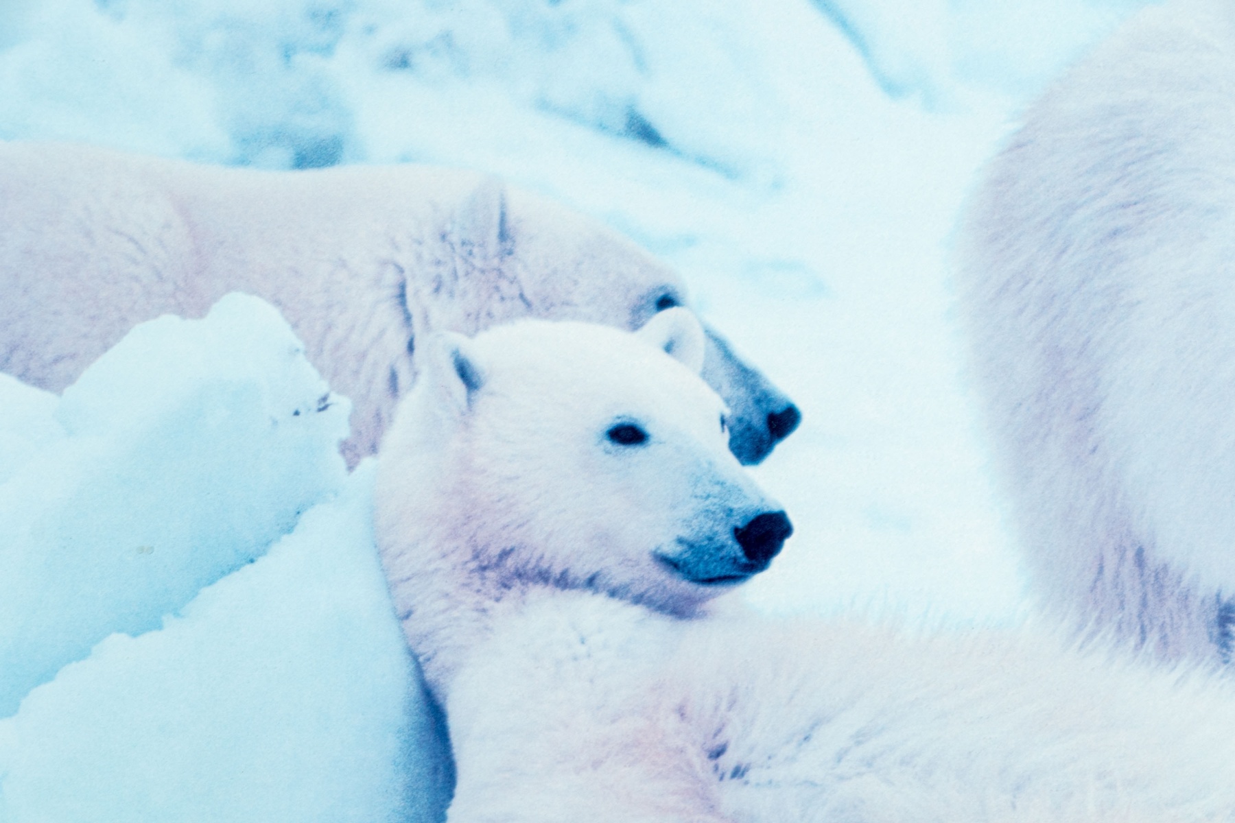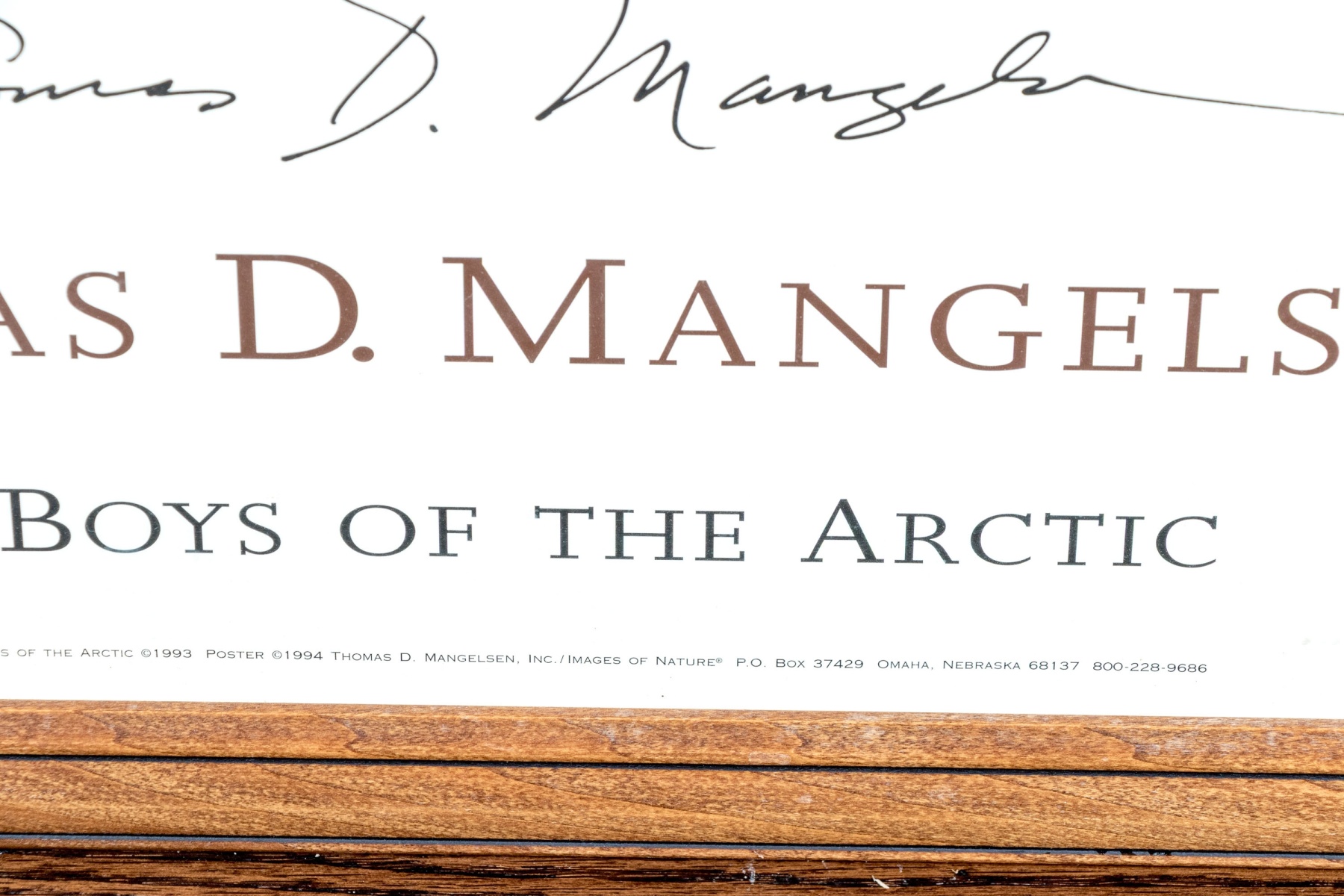 A charming advertisement print For Thomas D. Mangelsen (American, b. 1946) "Bad Boys Of The Arctic" depicting a group of three polar bears relaxing in an icy landscape with a cool blue tint.