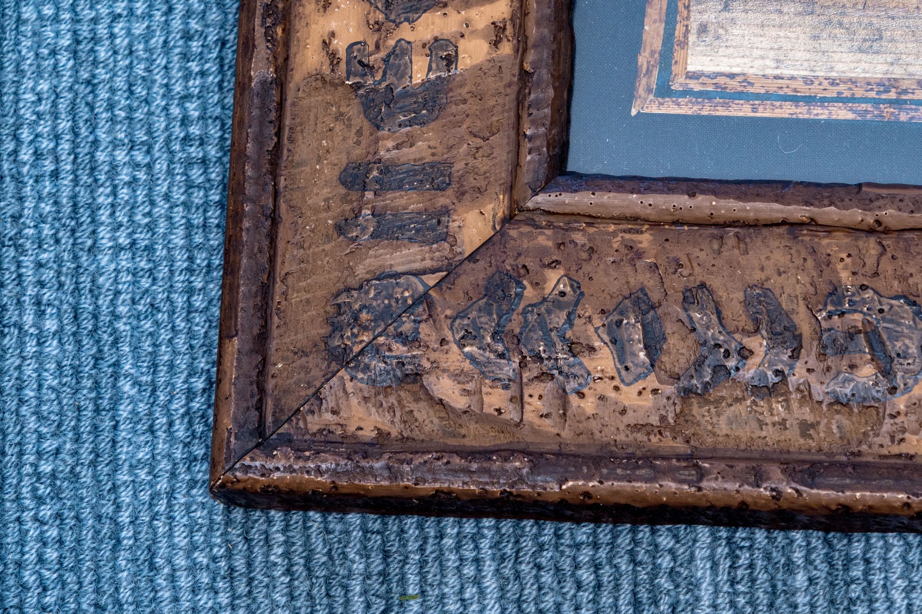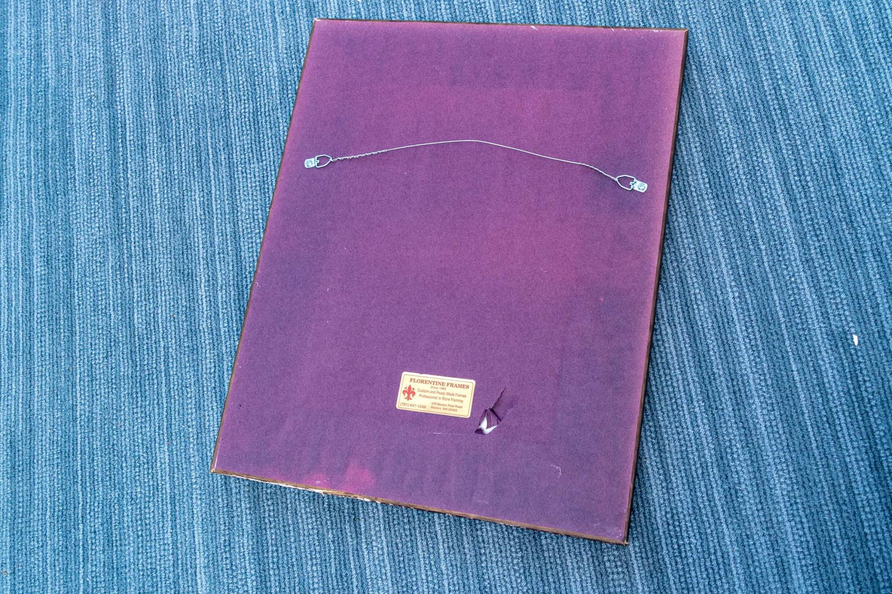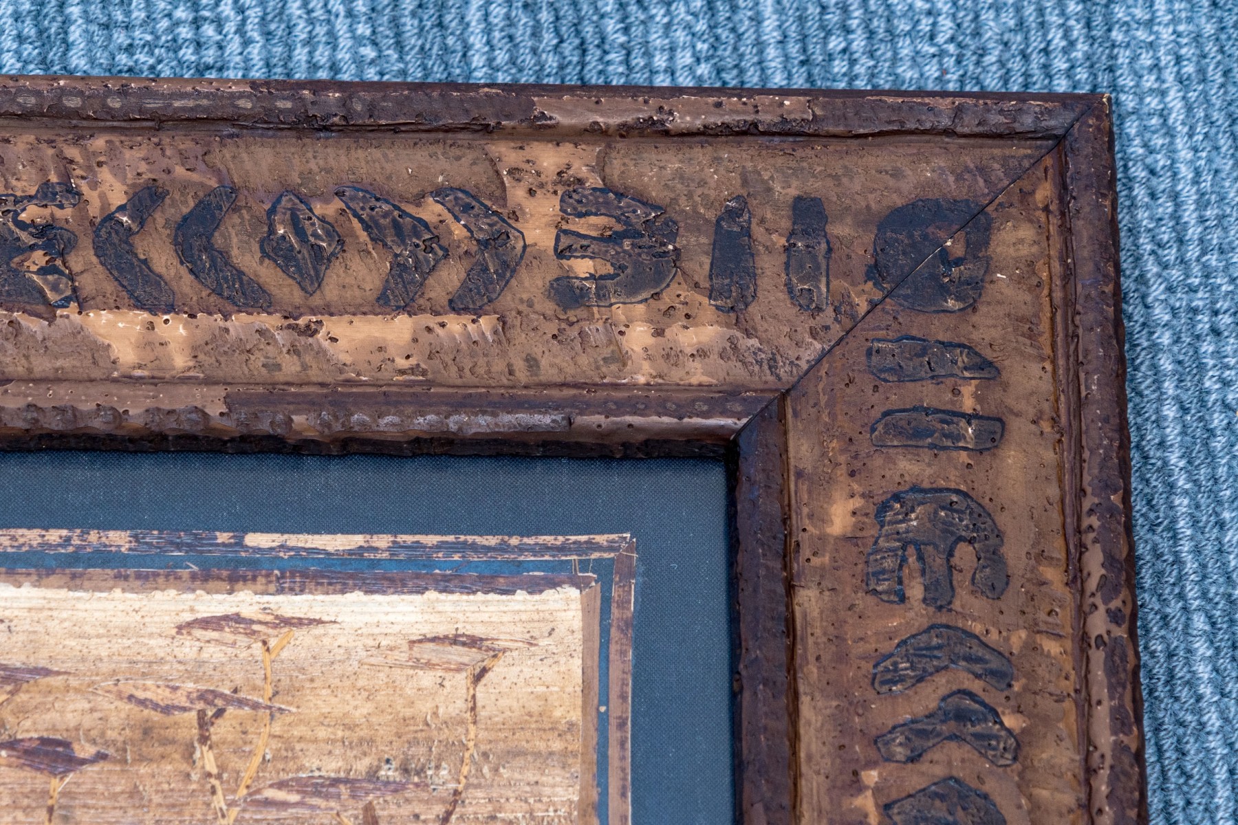 Displayed in a rustic brown frame with a center border of dark geometric forms.