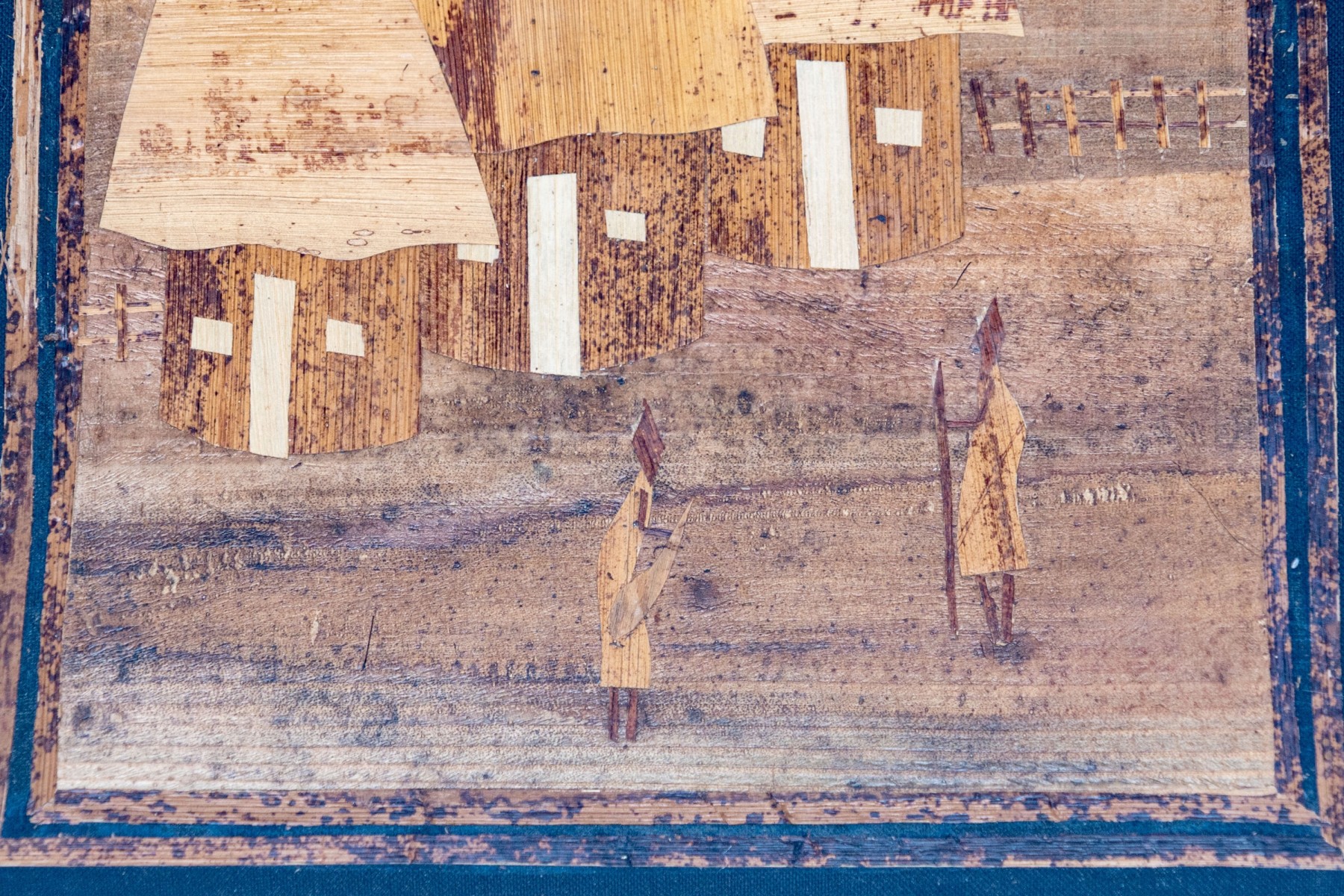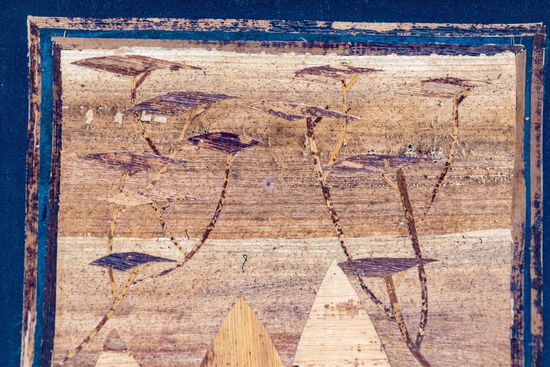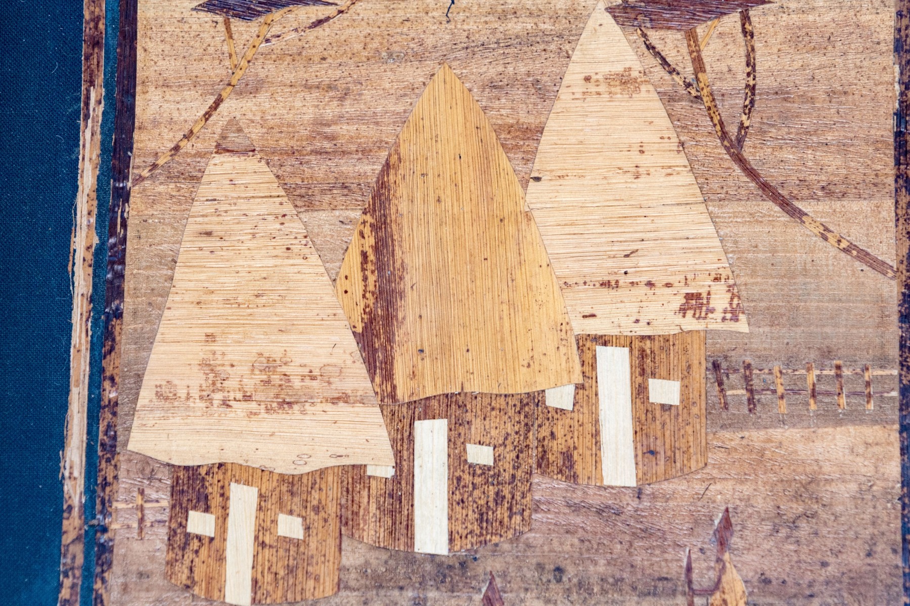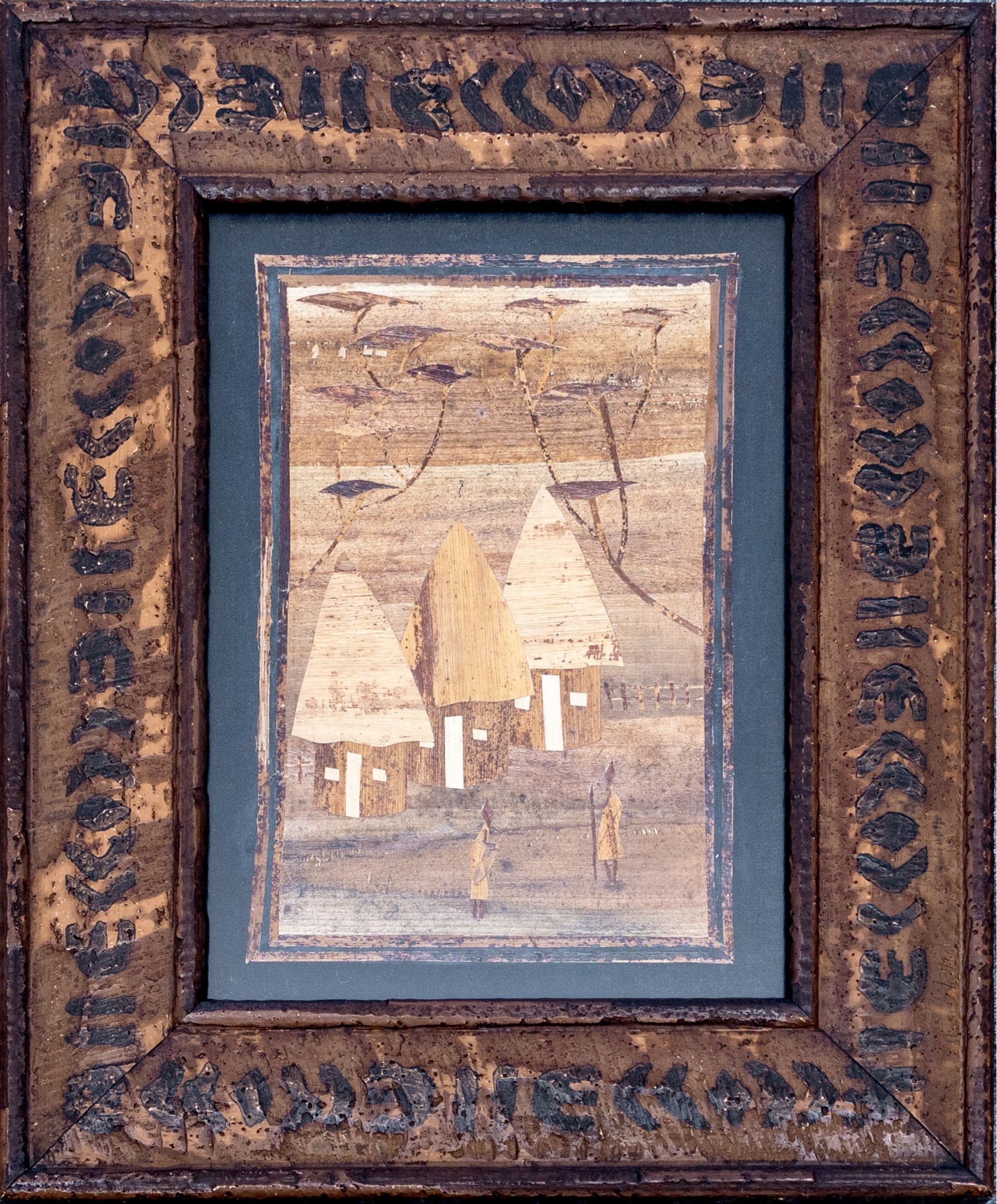 A delightful African artwork made of banana leaves of different hues, depicting a village scene with two figures outside of three houses flanked by trees. The artwork is mounted to a dark blue fabric backing.