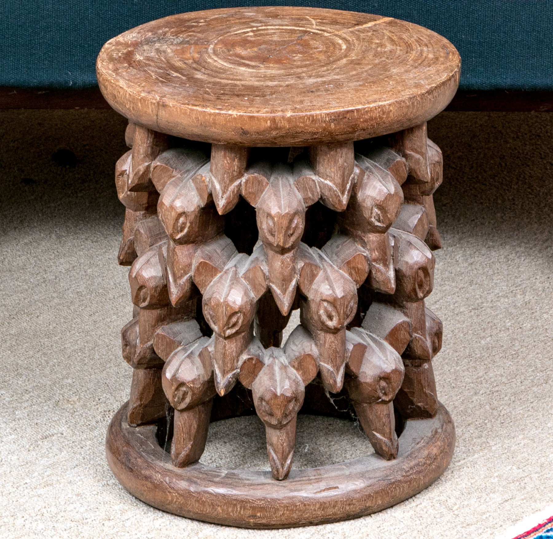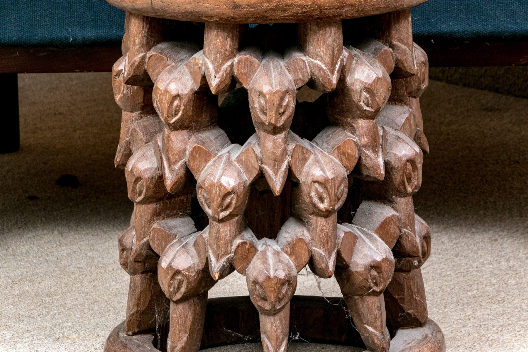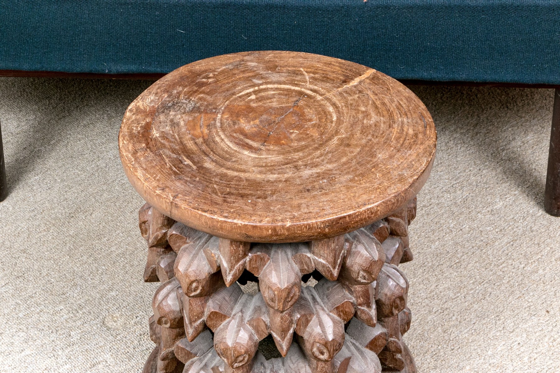 An excellent African hand-carved wood stool or side table in a honeyed brown finish. Features a finely detailed stacked elephant head column flanked by a circular top and bottom.