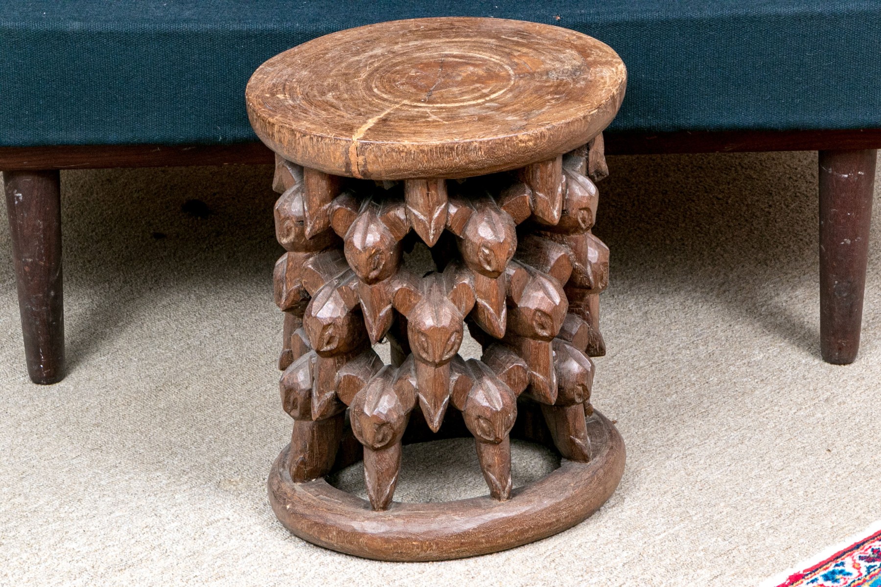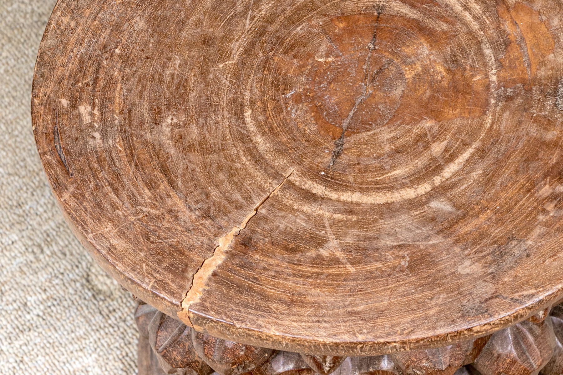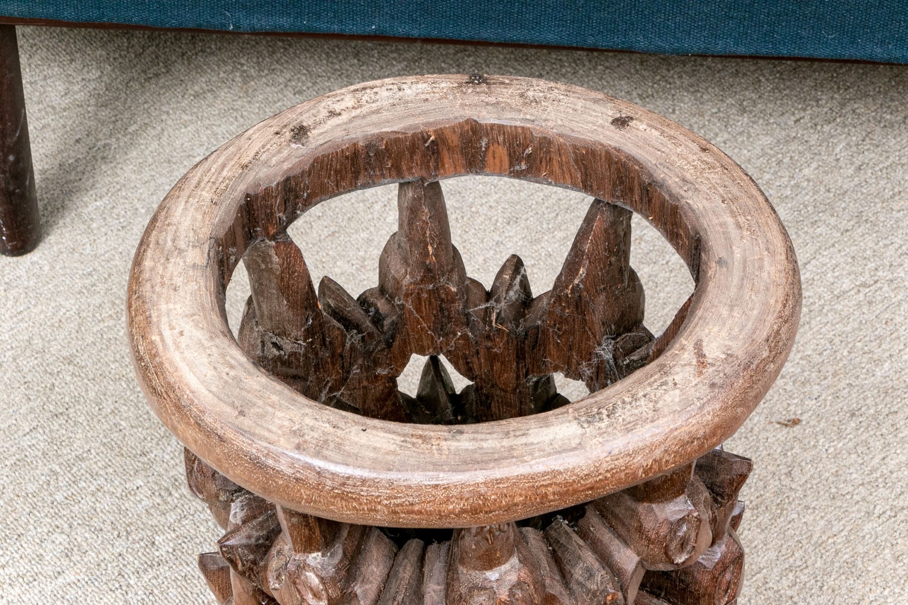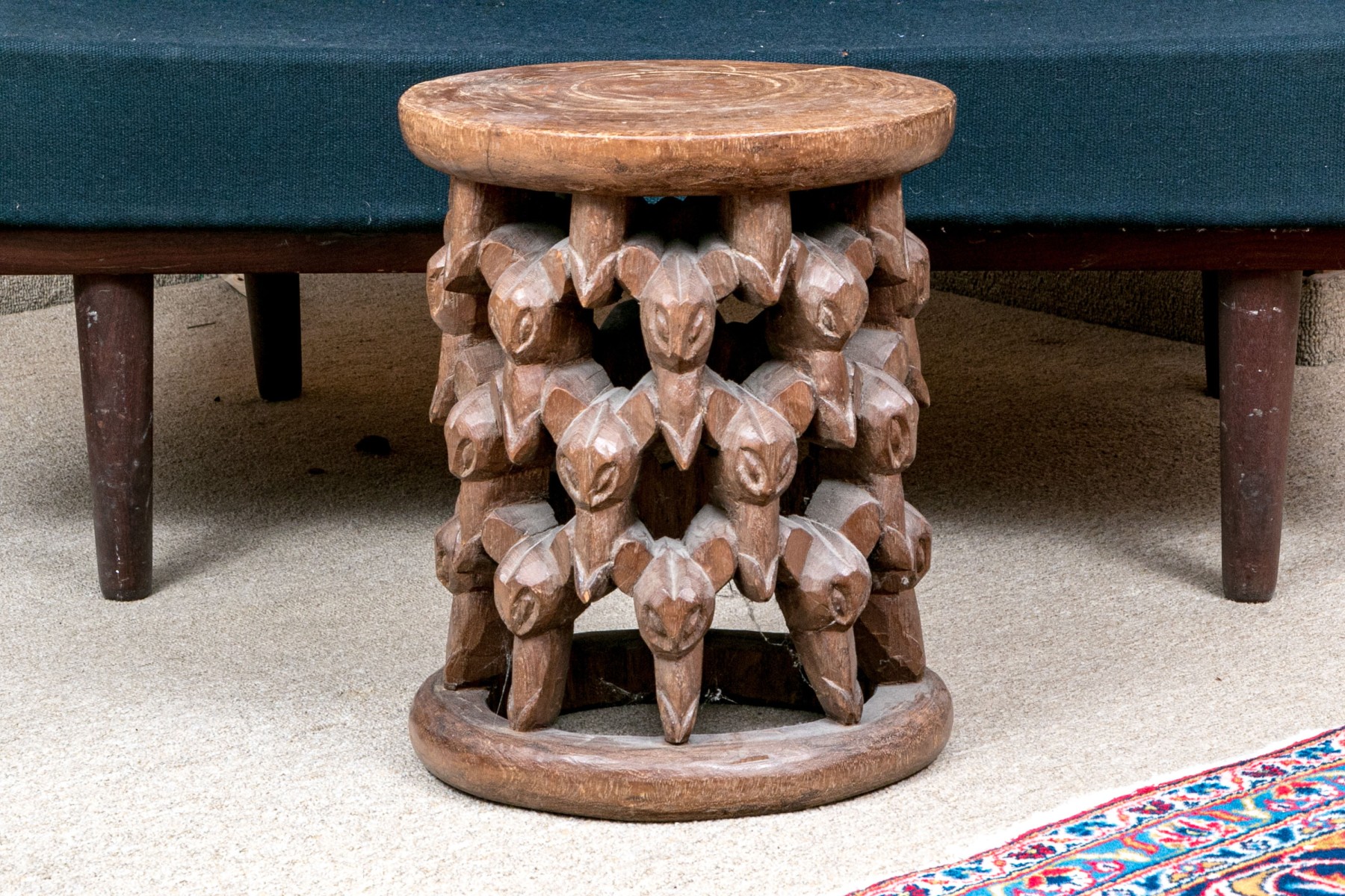 An excellent African hand-carved wood stool or side table in a honeyed brown finish. Features a finely detailed stacked elephant head column flanked by a circular top and bottom.