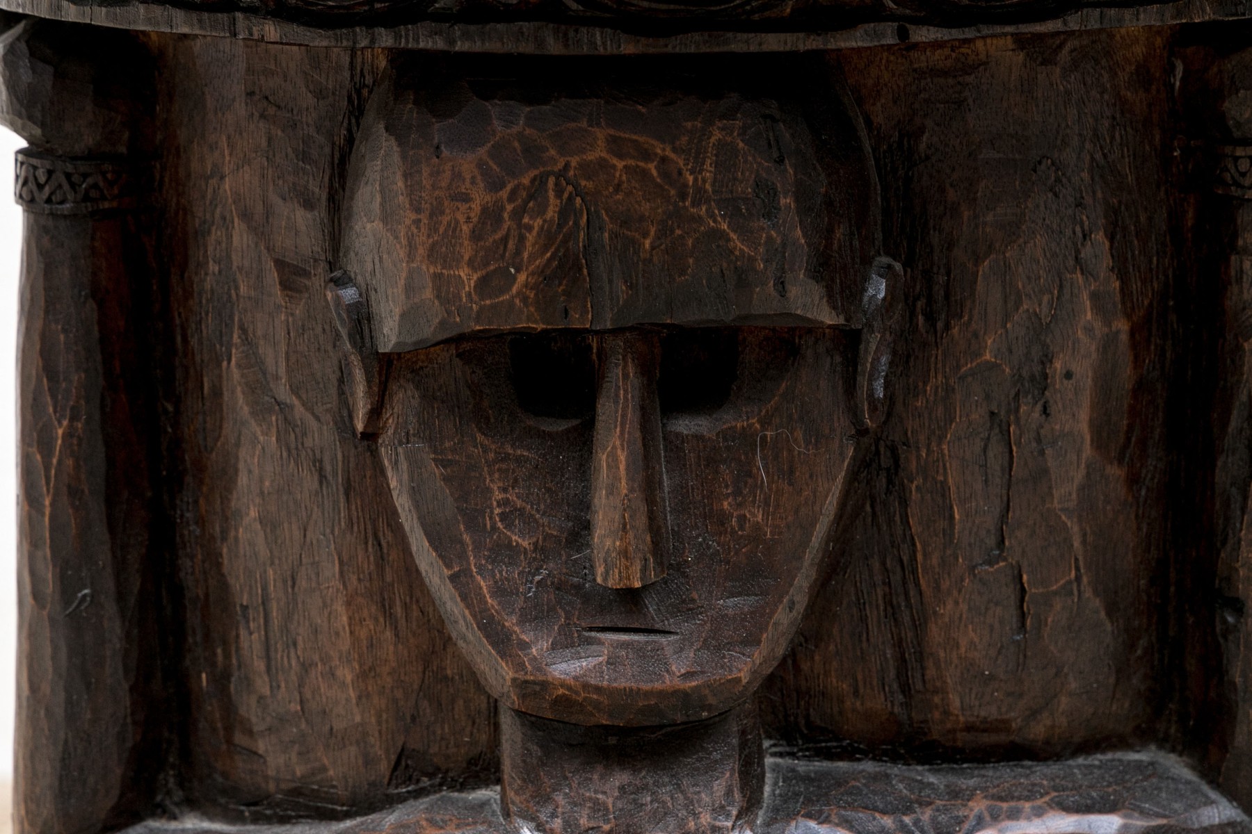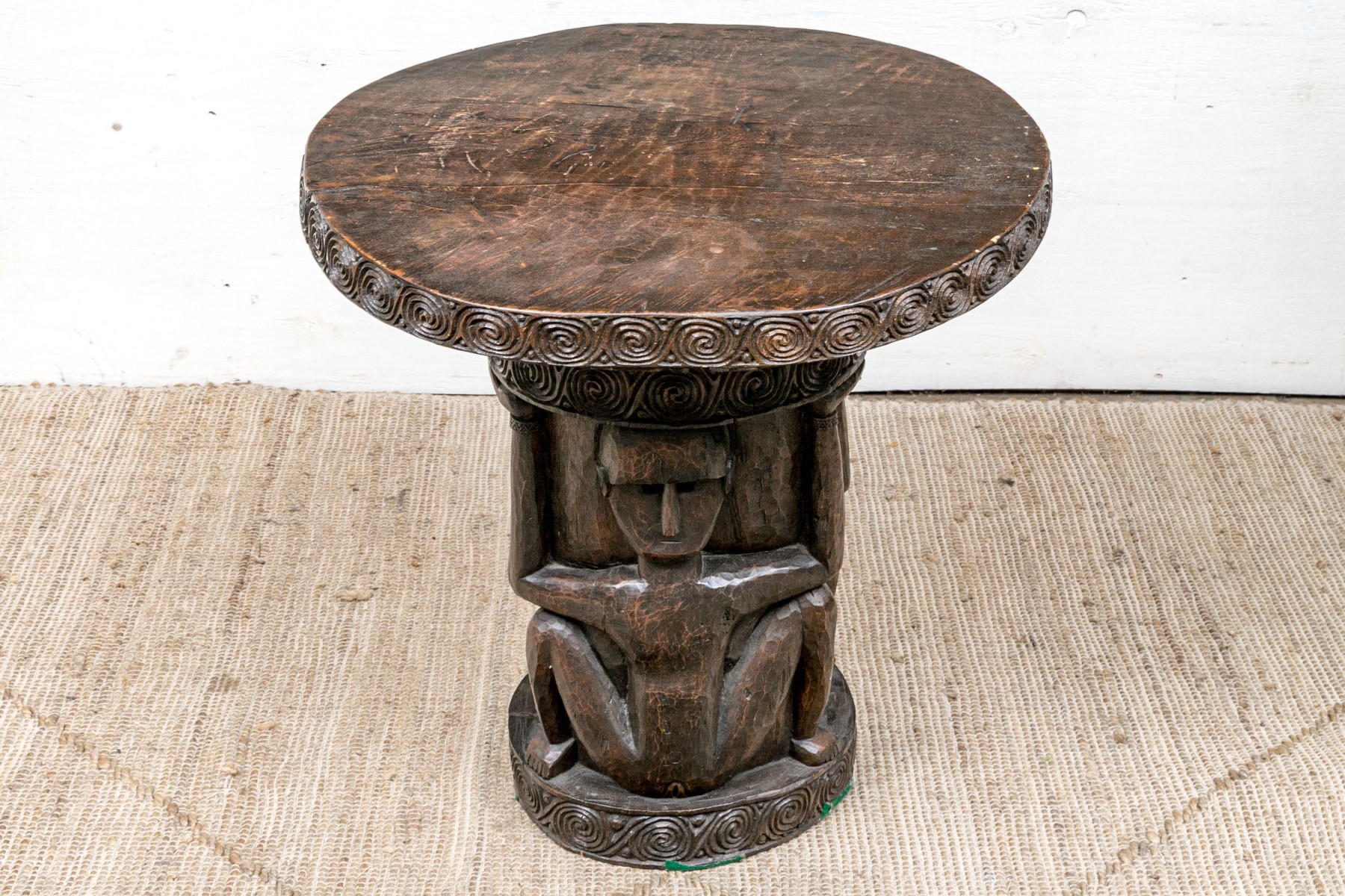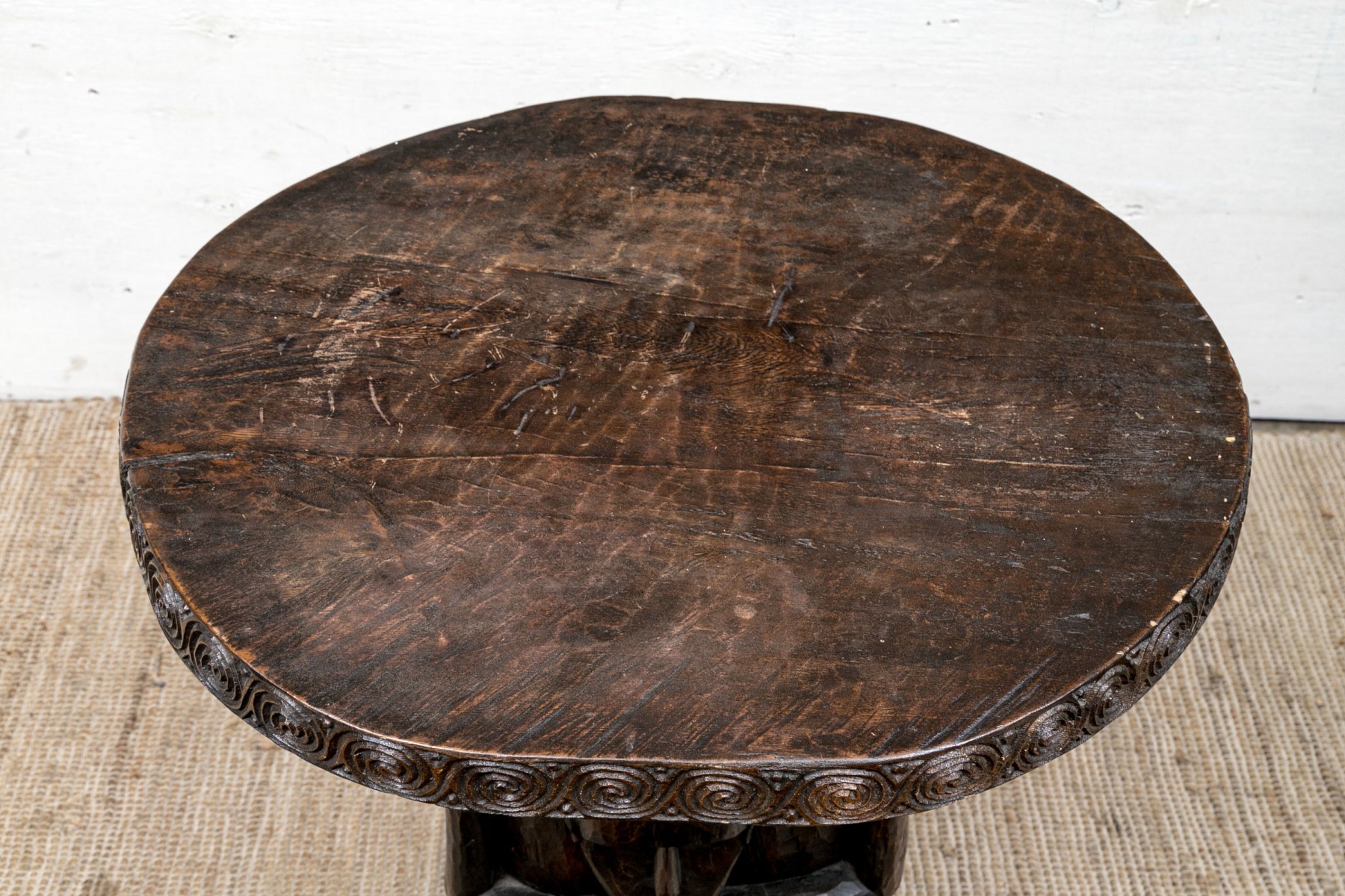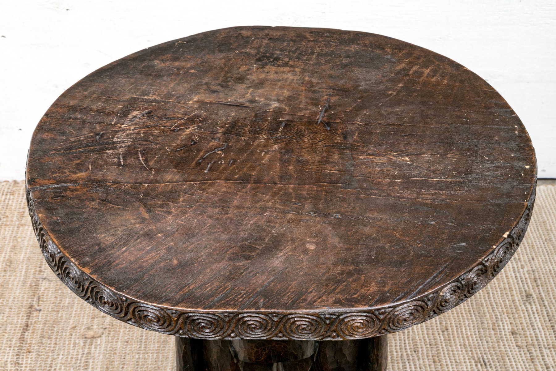 A dark stained table with round top on a heavy center circular support with two Atlas figures in high relief. Carved running swirls decorate the top edge, the frieze and the base edge. The underside of the table also carved with figures in low relief.