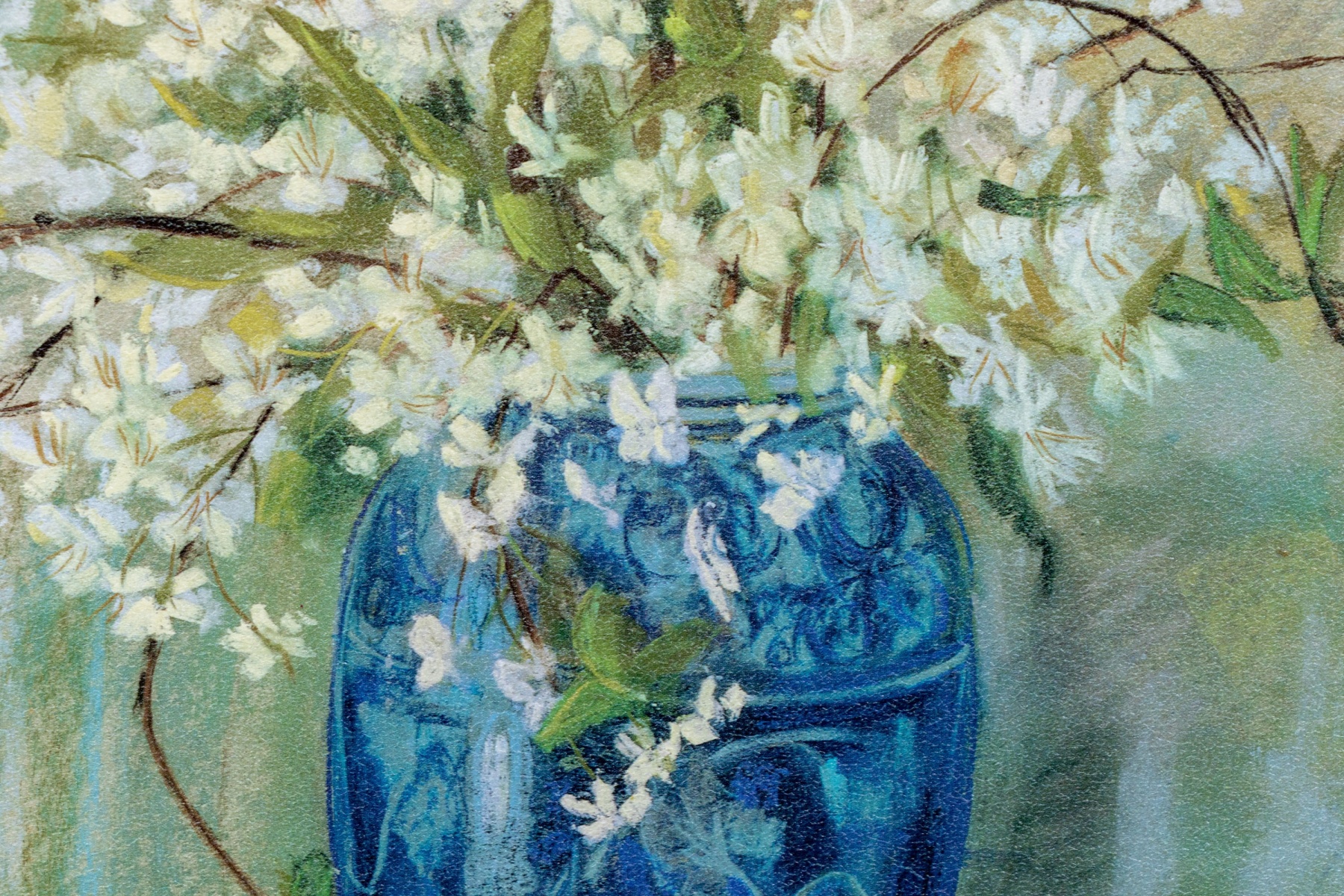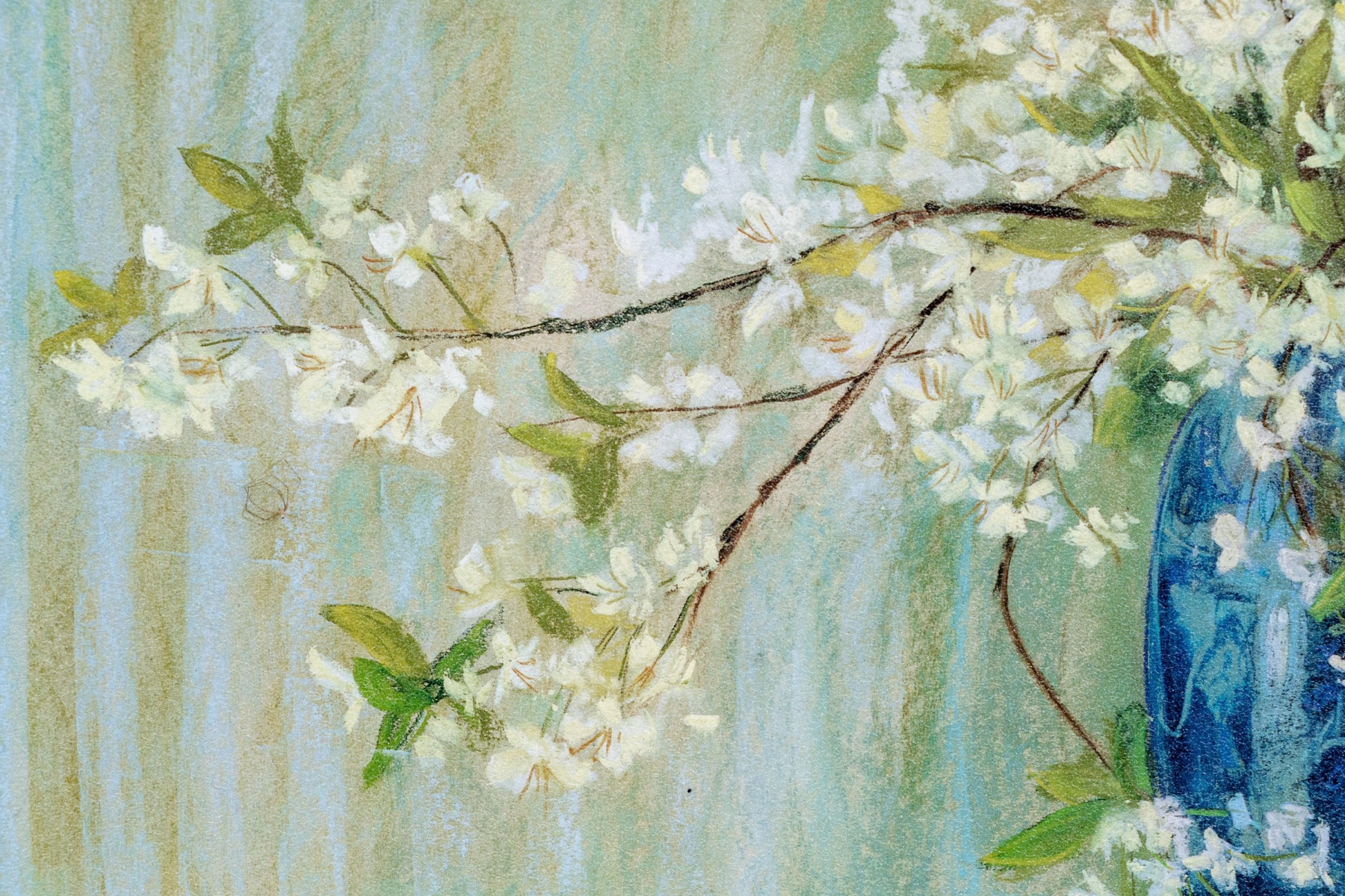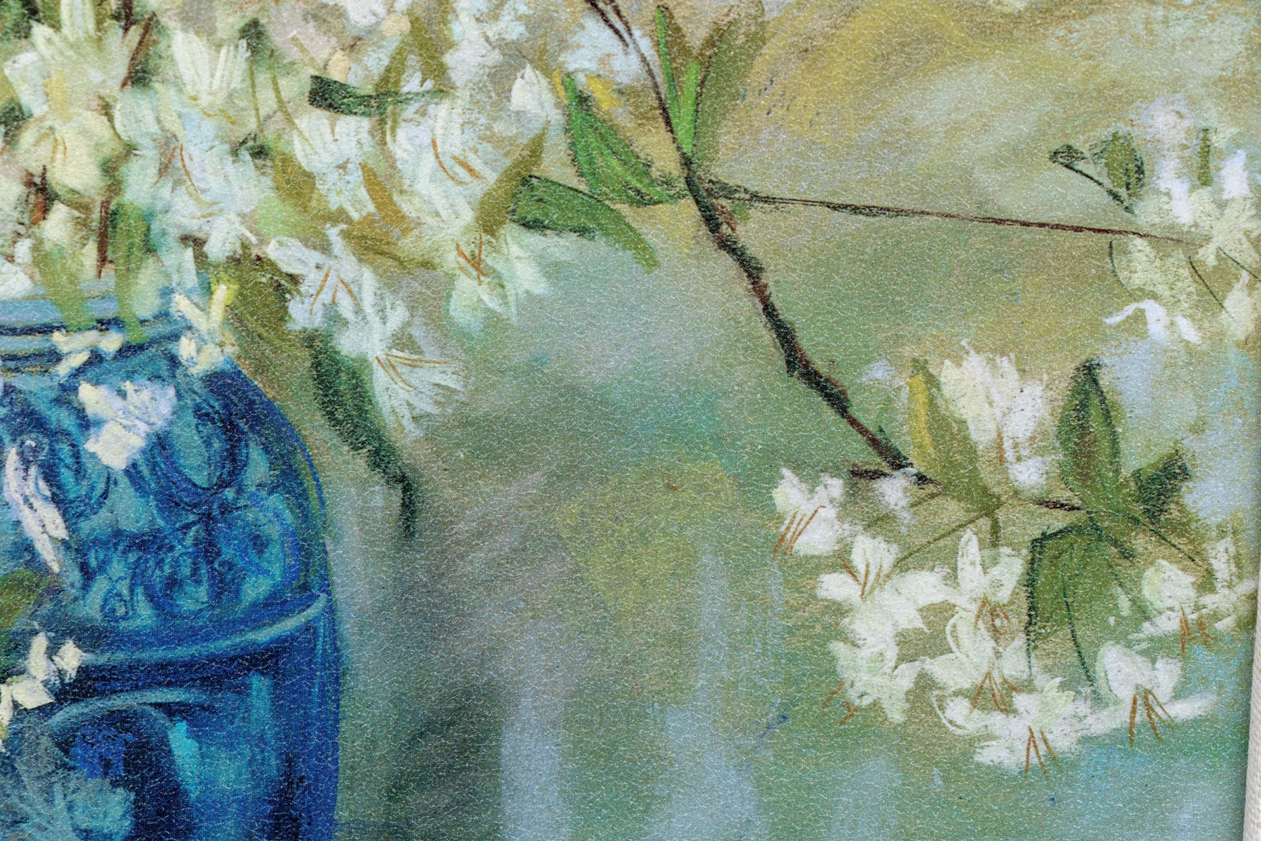 After Carol Rowan (American, 1938-2012) "Blue Vase Still Life I" high quality giclee produced for the Bombay Company depicting a lush white flower arrangement with green leaves extending up tall stems emerging from a large blue vase against a striated blue and brown ground. Plate signature lower right.