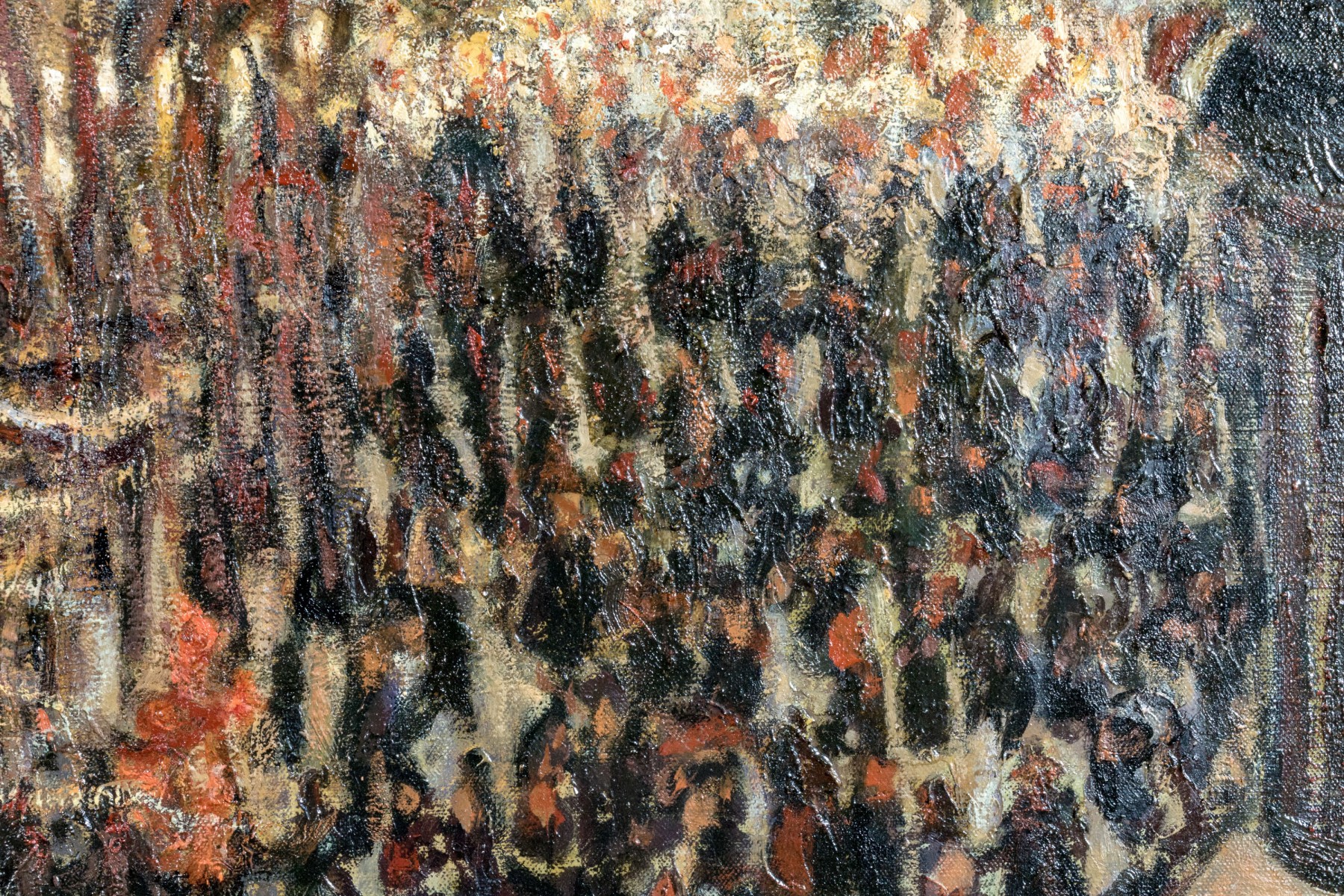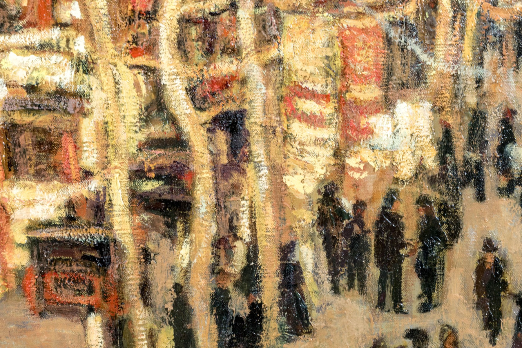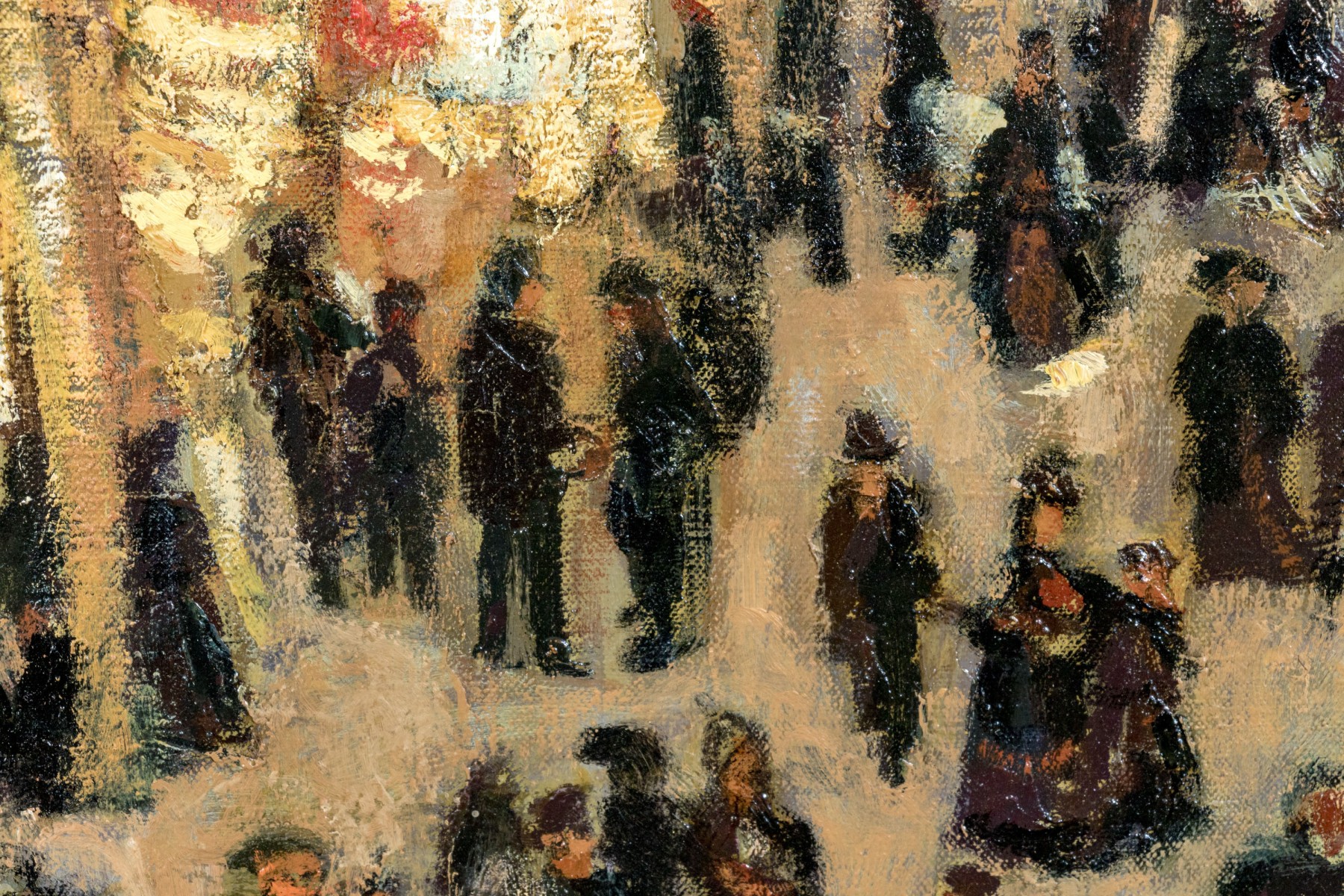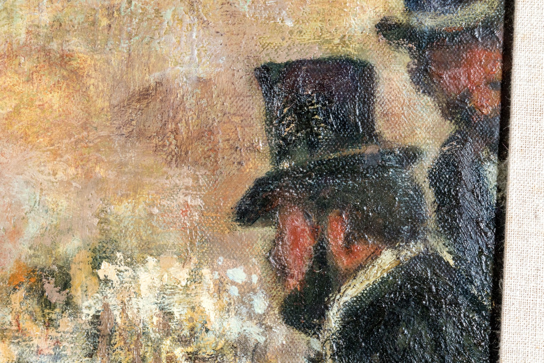 A fabulous reproduction of Claude Monet's marvelous original "Boulevard Des Capucines". The painting depicts a pair of gentlemen in black suits with top hats standing on a terrace above street level appearing to gaze down upon the hustle and bustle of urban Paris.
