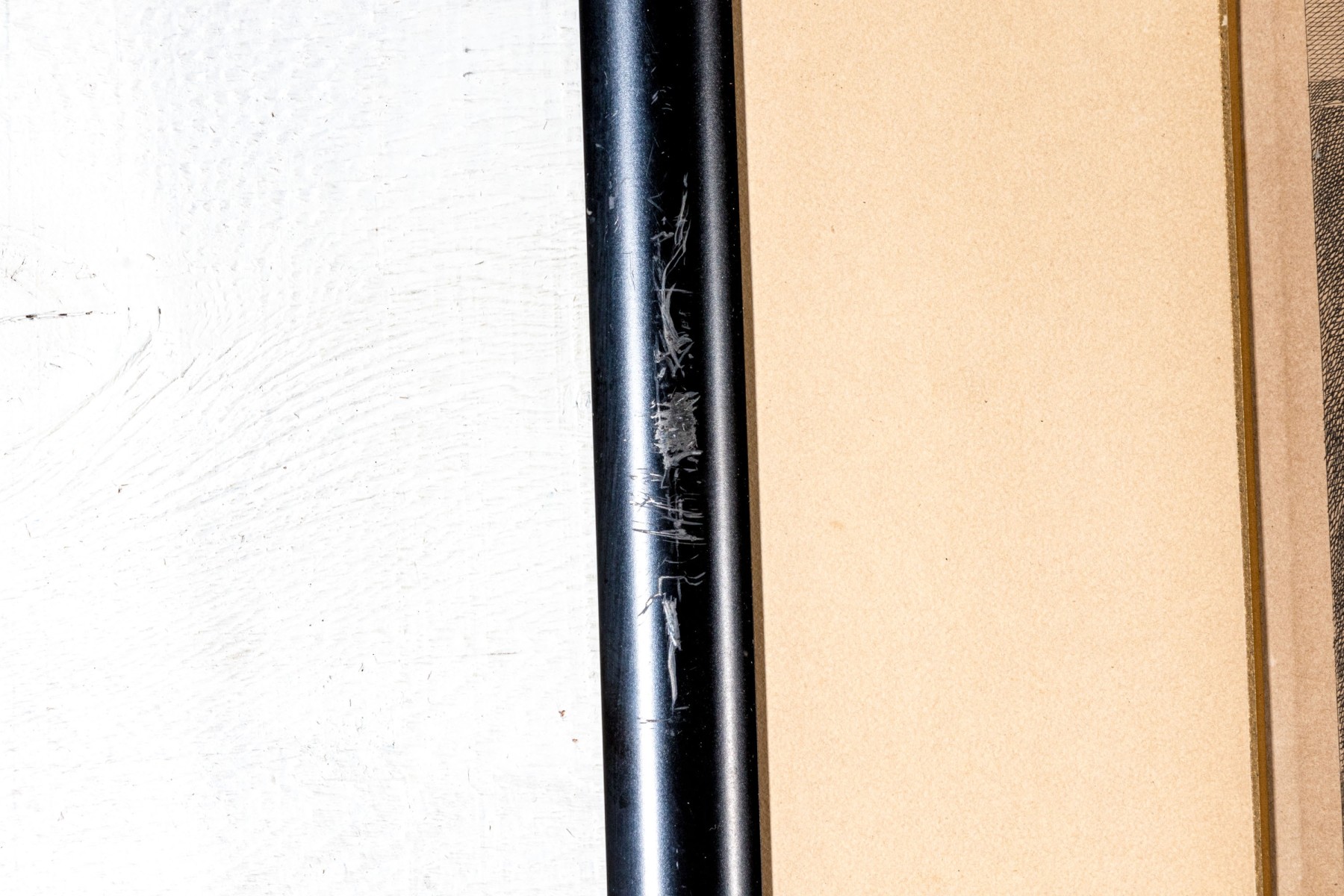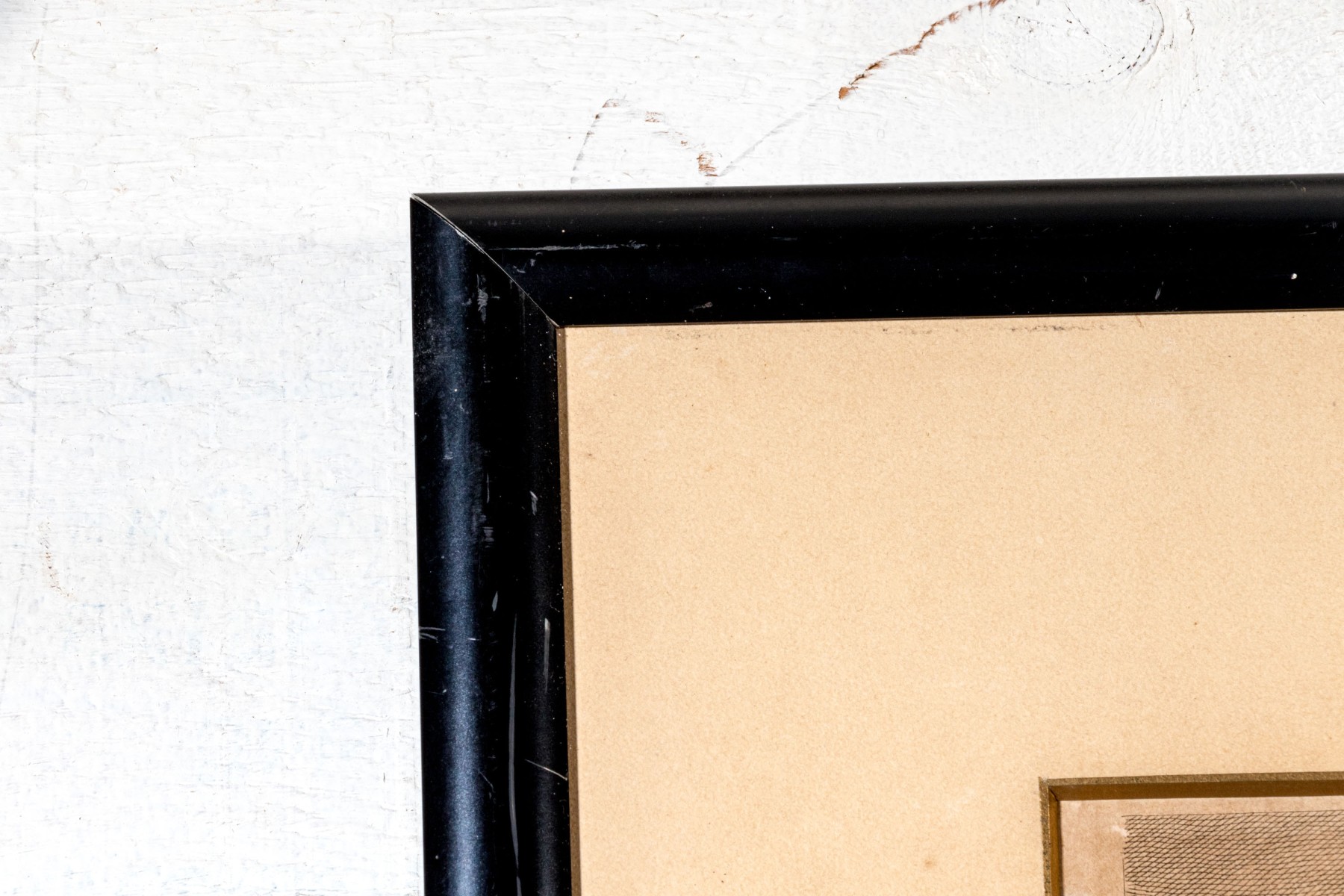 The paper yellow with age and probably acid burnt. A slight crease through the center, bit more obvious towards the bottom. A small hold in the upper left corner, Gash type face paper loss in the upper right. A hole in the bottom center and a crease in the lower right. The frame heavily scratched.