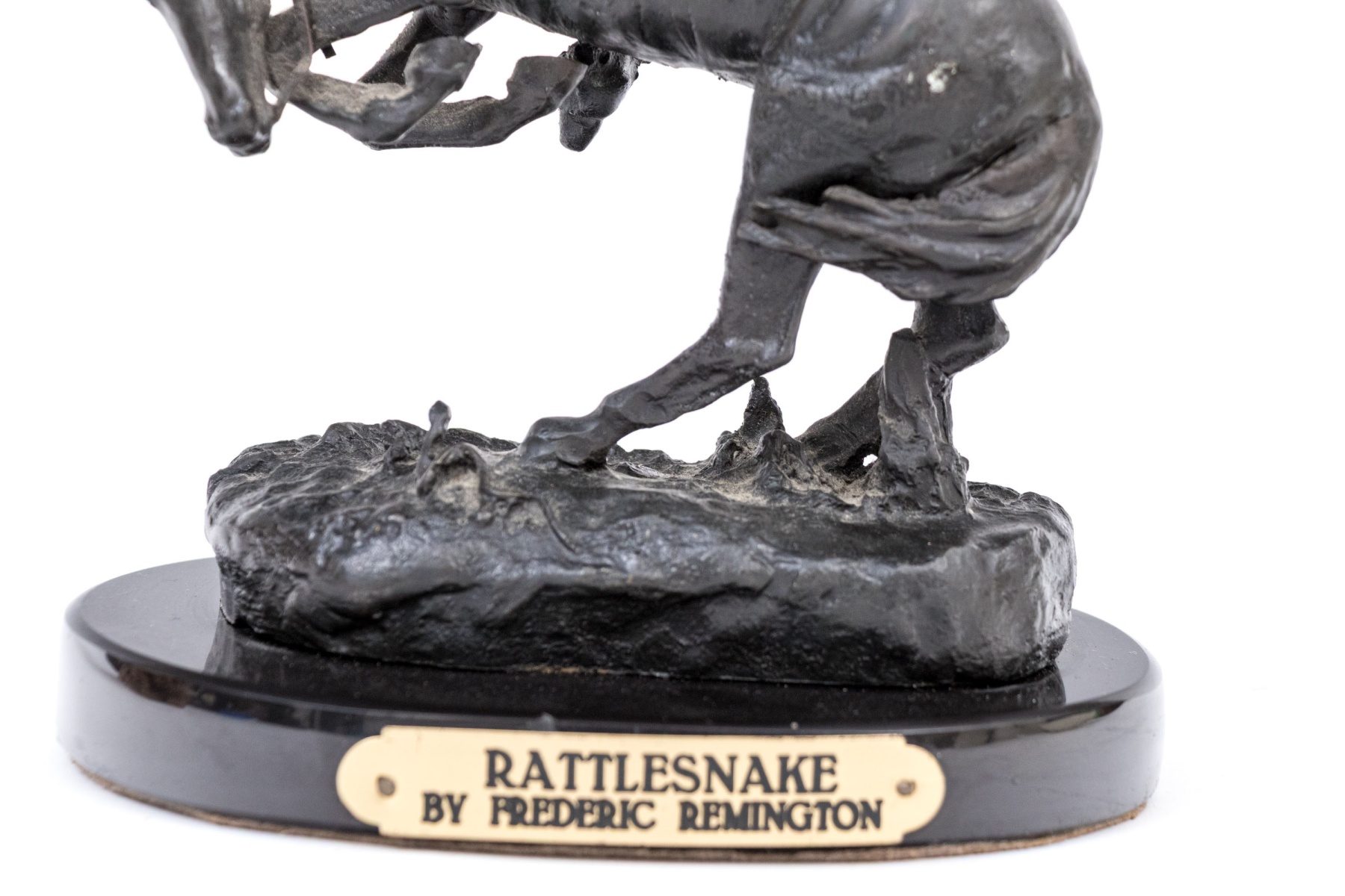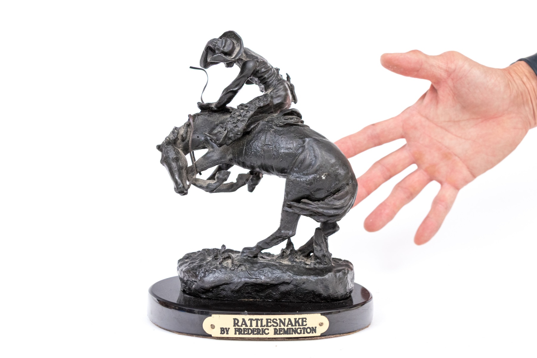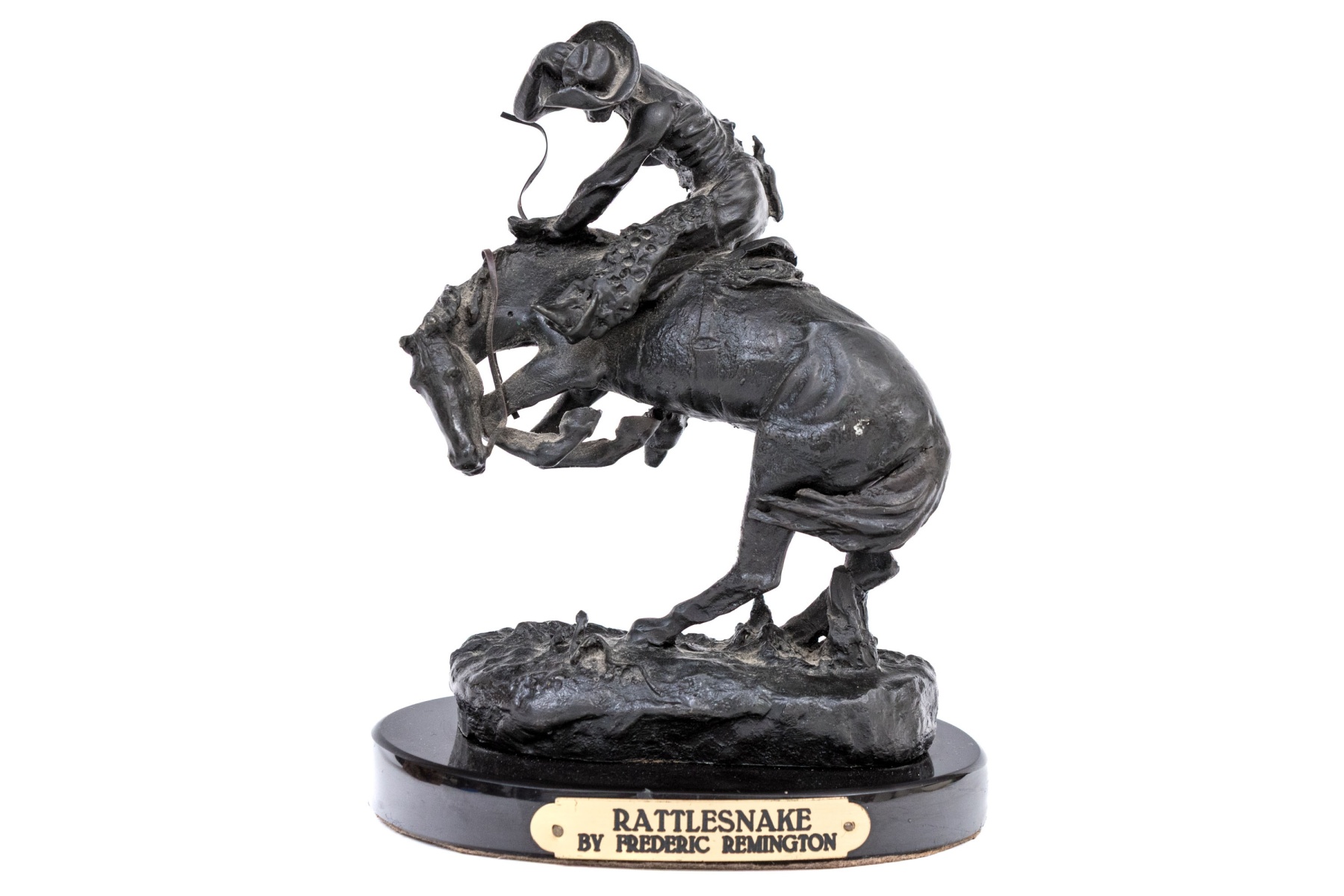 After Frederic Remington (American, 1861-1909) "Rattlesnake" cast bronze depicting a cowboy riding a horse trying to buck him off, rearing over an oval base mounted to oval stone affixed with a brass name plaque. Signed in cast to the base.