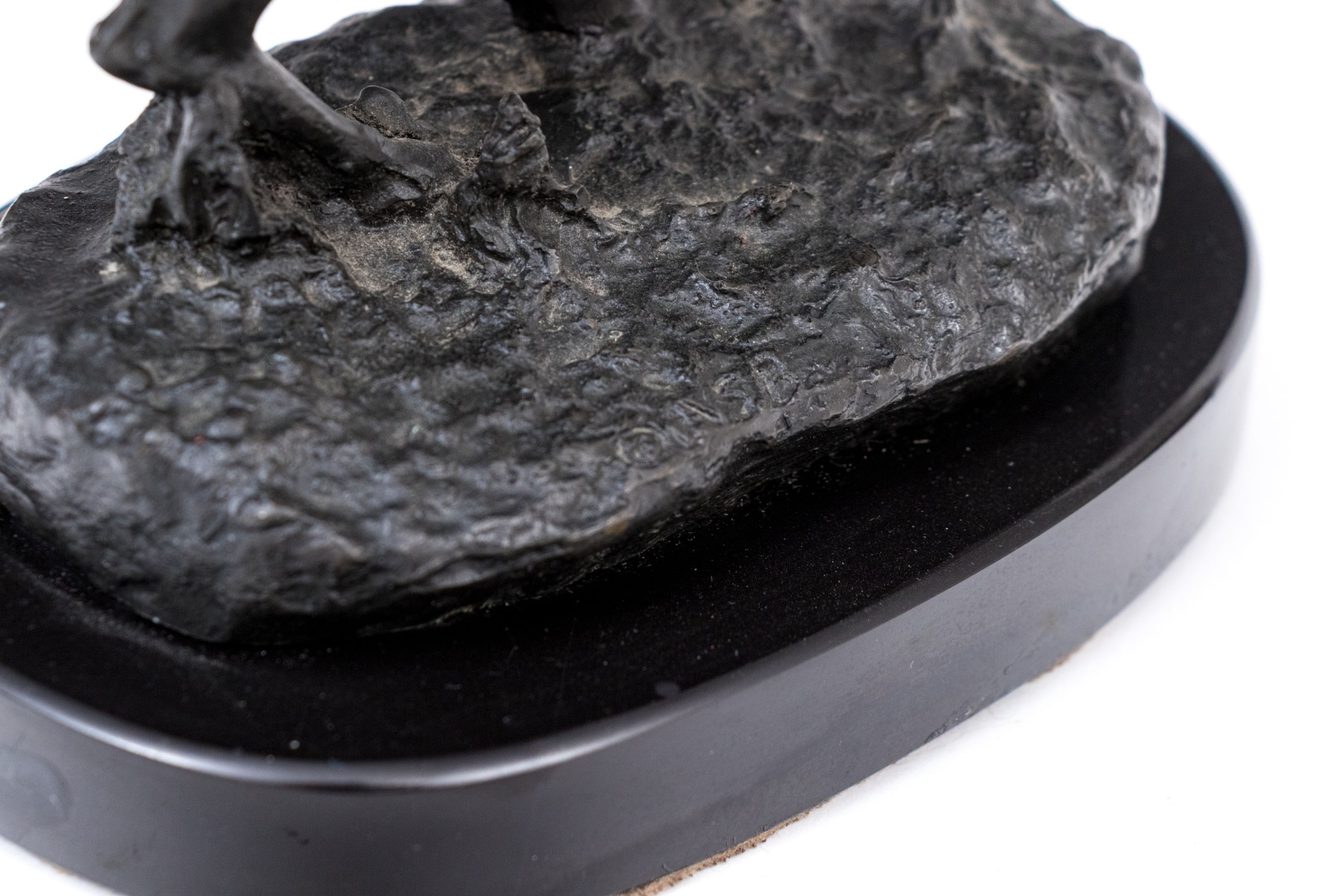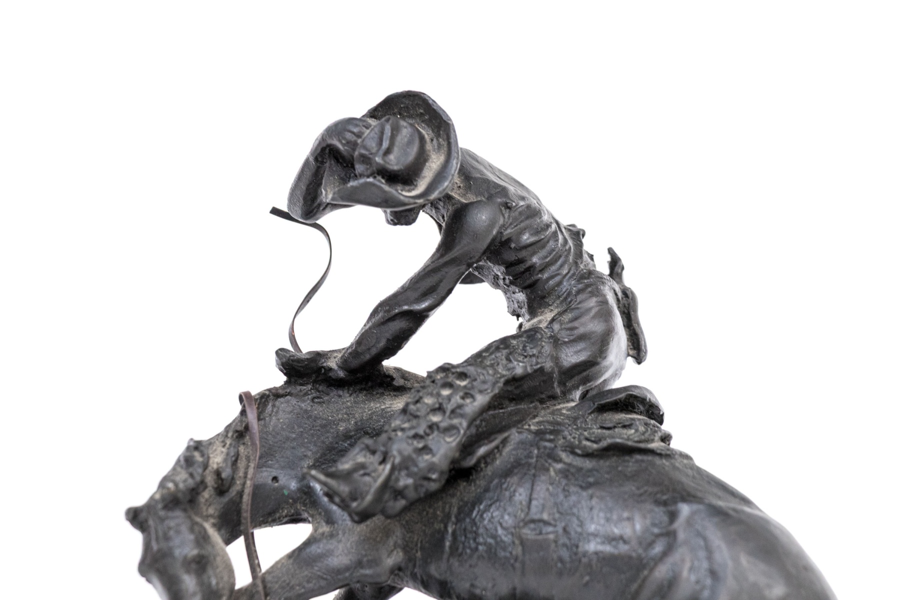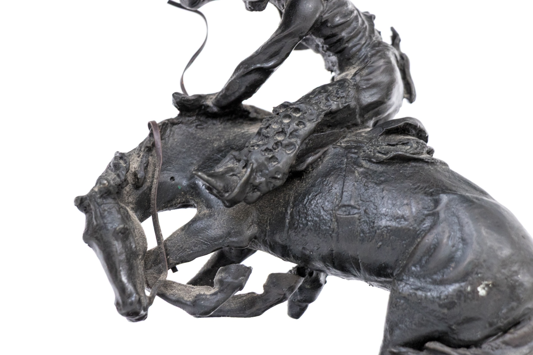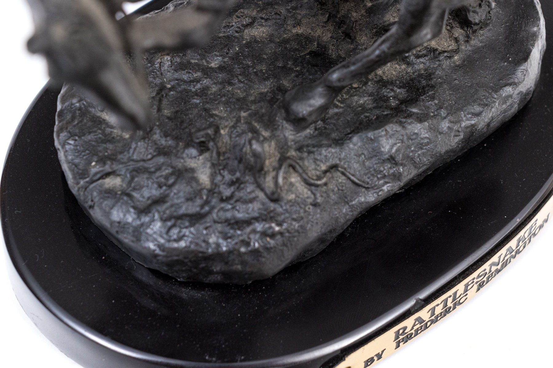 After Frederic Remington (American, 1861-1909) "Rattlesnake" cast bronze depicting a cowboy riding a horse trying to buck him off, rearing over an oval base mounted to oval stone affixed with a brass name plaque. Signed in cast to the base.