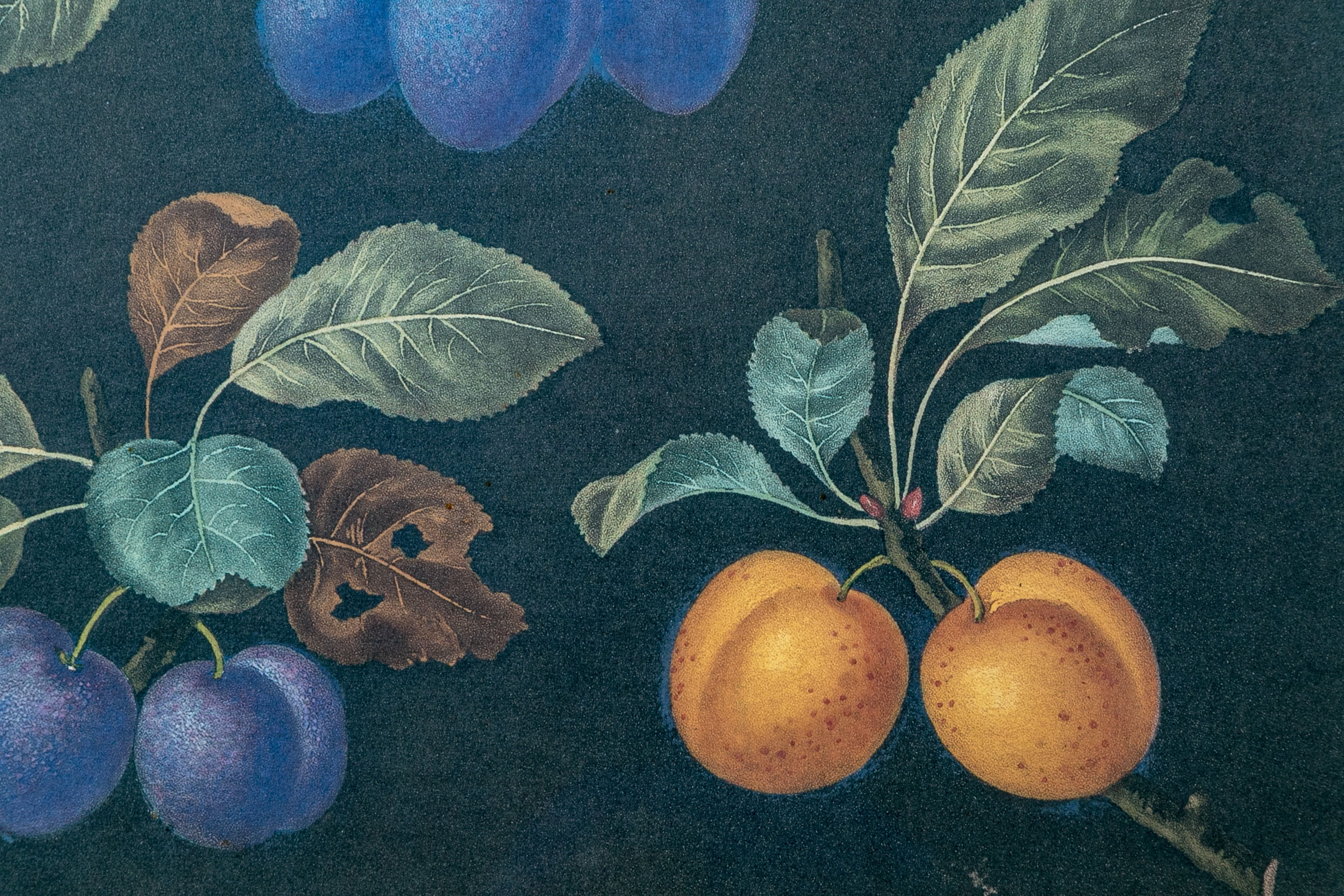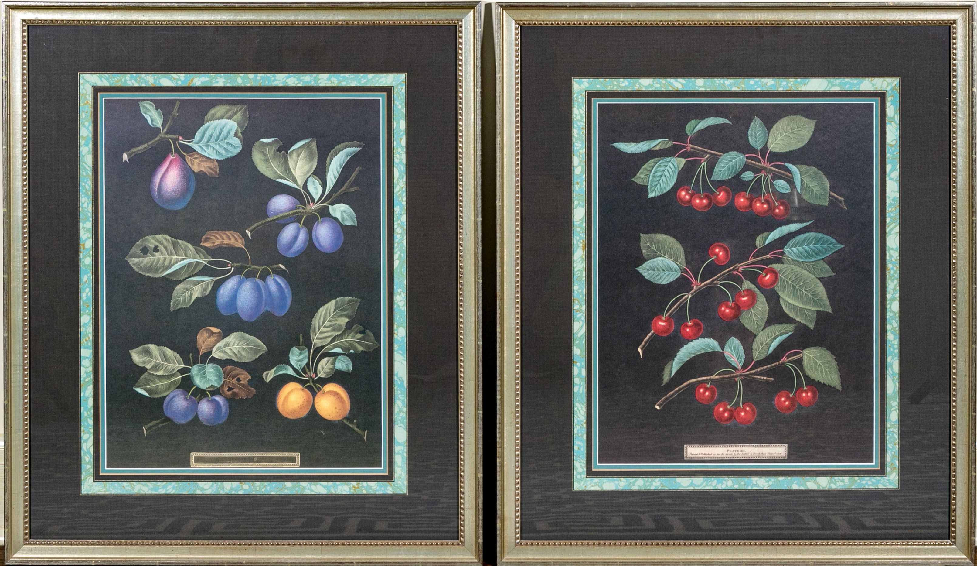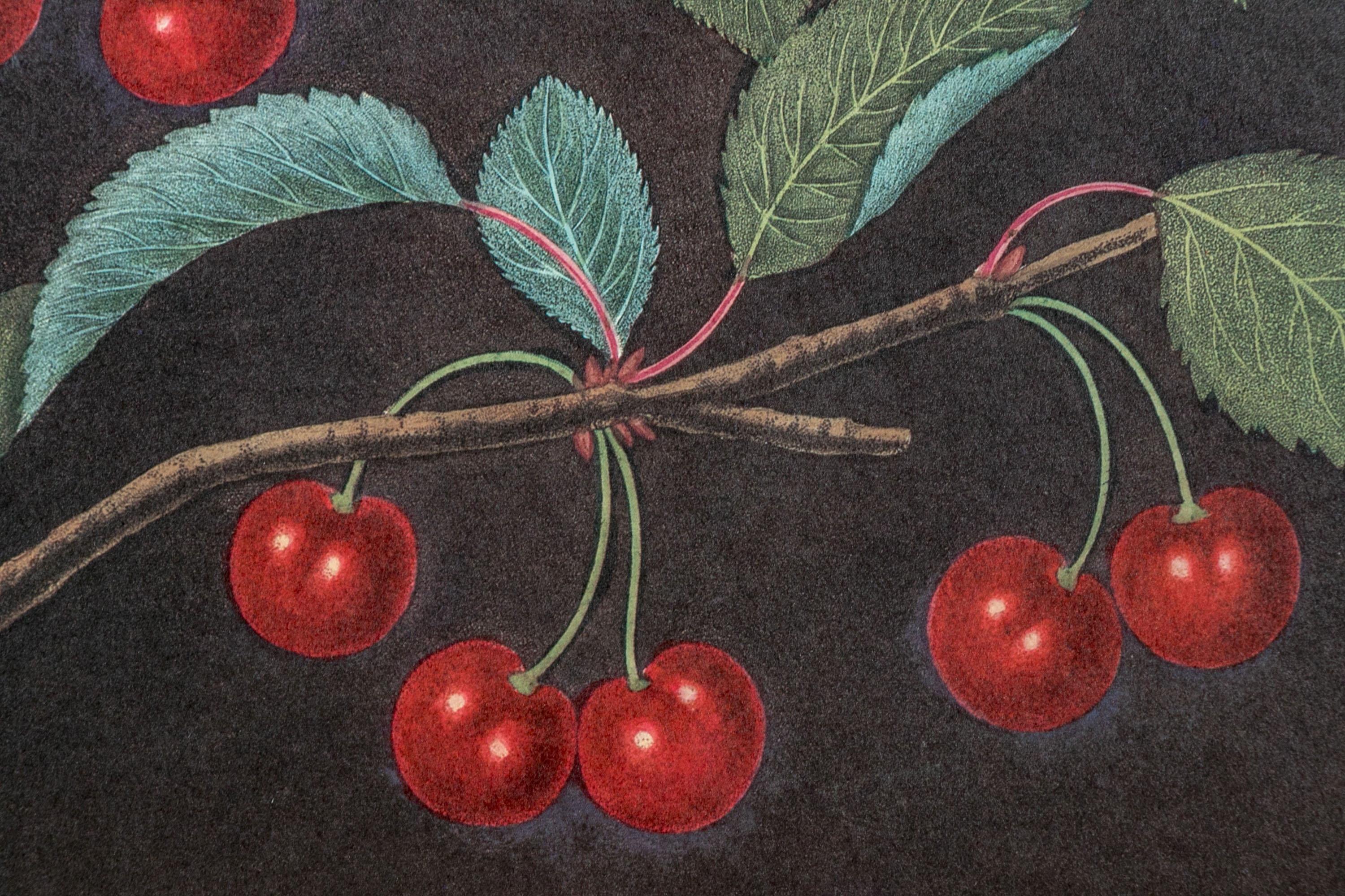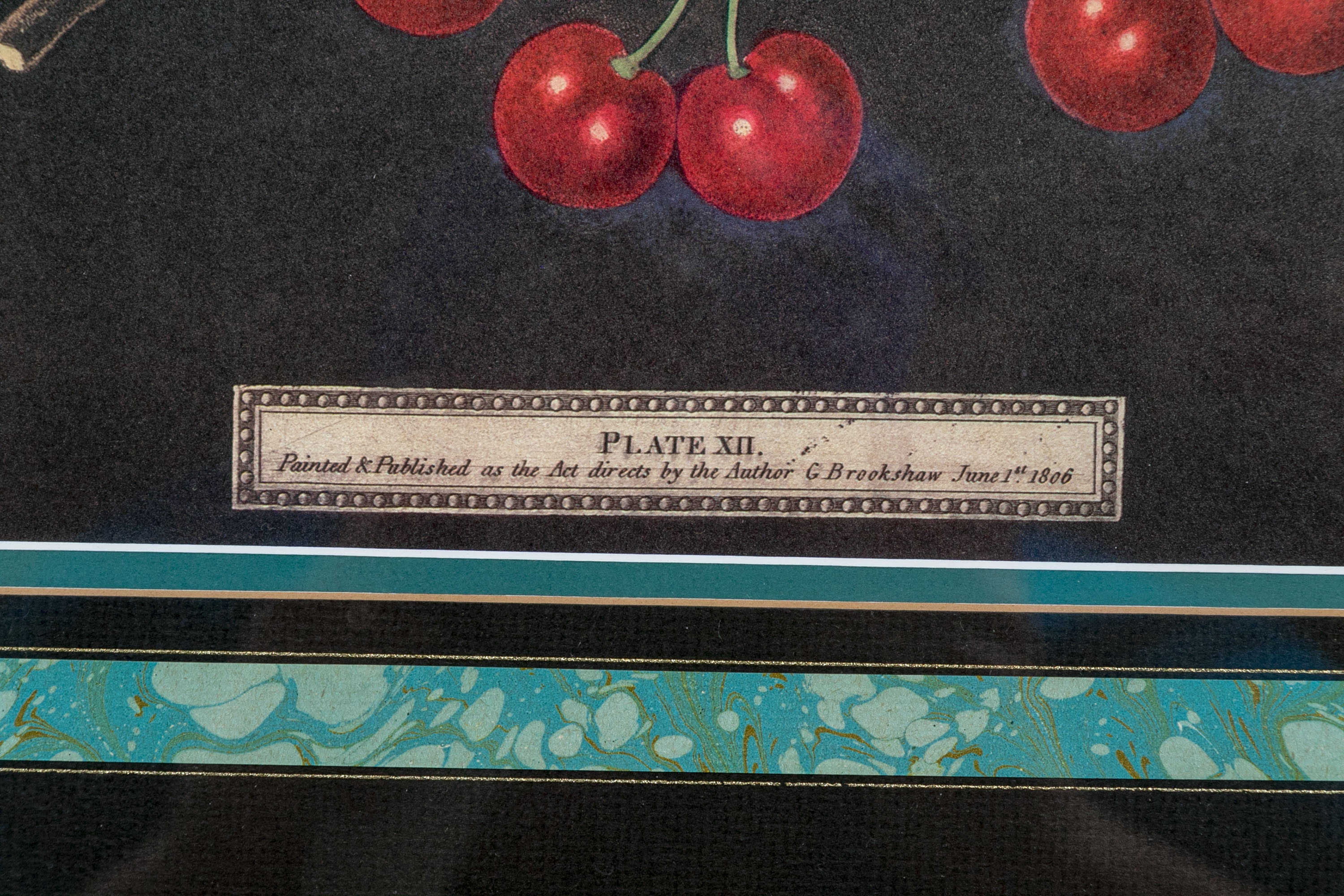 A wonderful duo of prints after George Brookshaw (British, 1751-1823) depicting drupes. The first features a group of purple plums and yellow apricots, while the second features branches of vibrant red cherries, both against dark backgrounds.