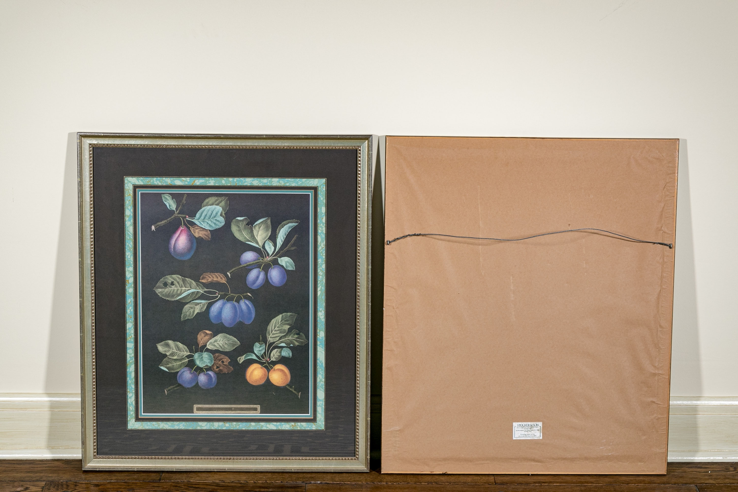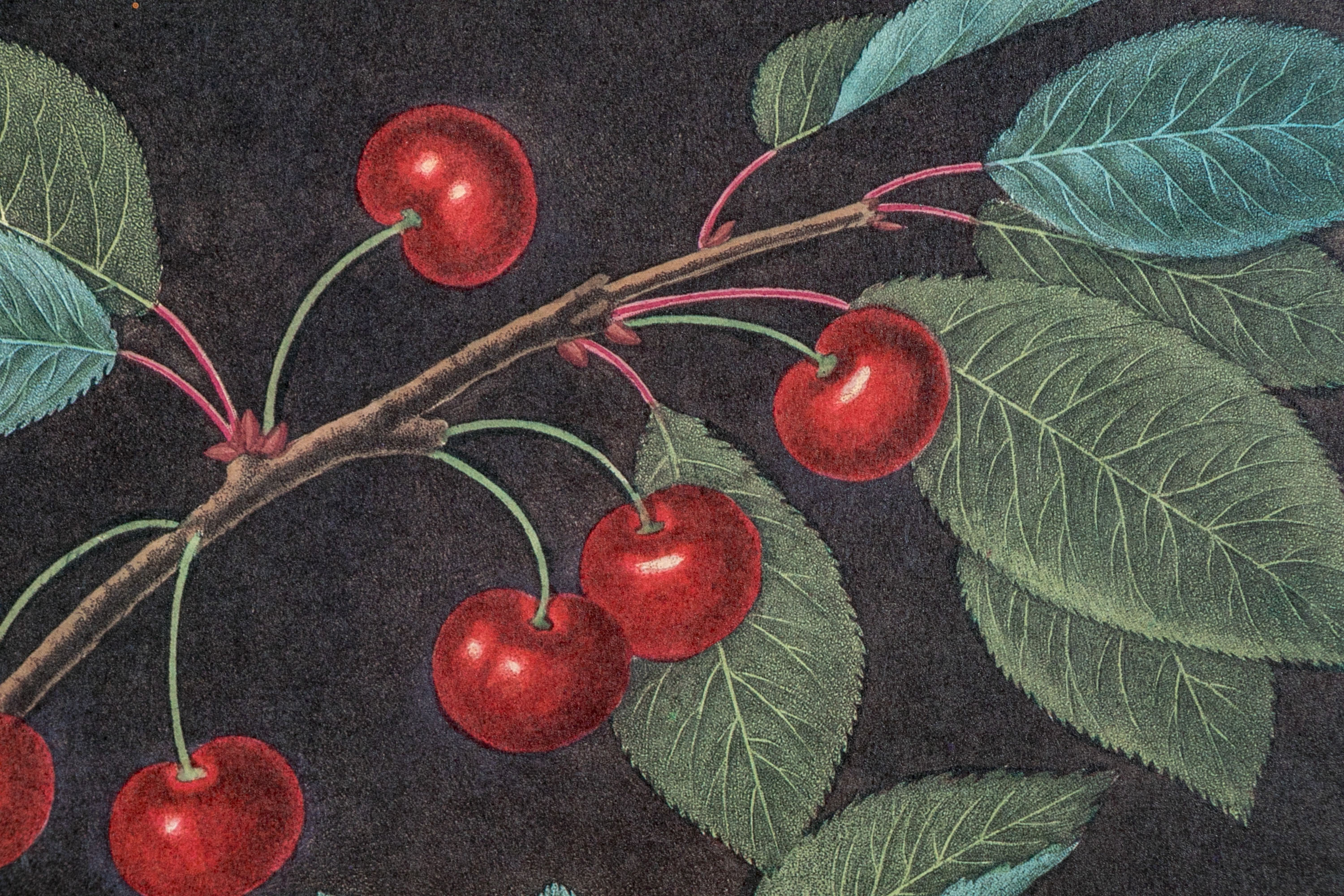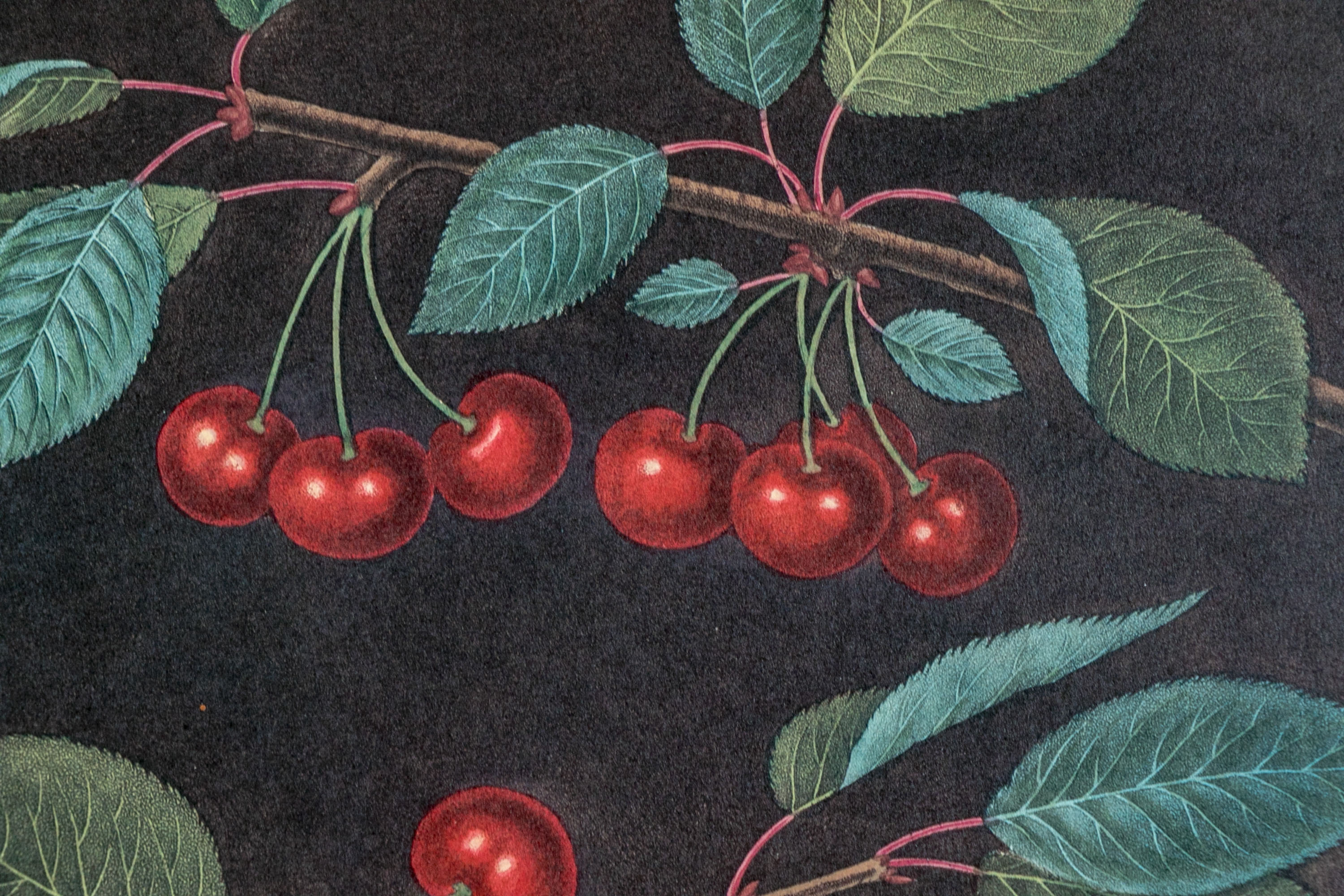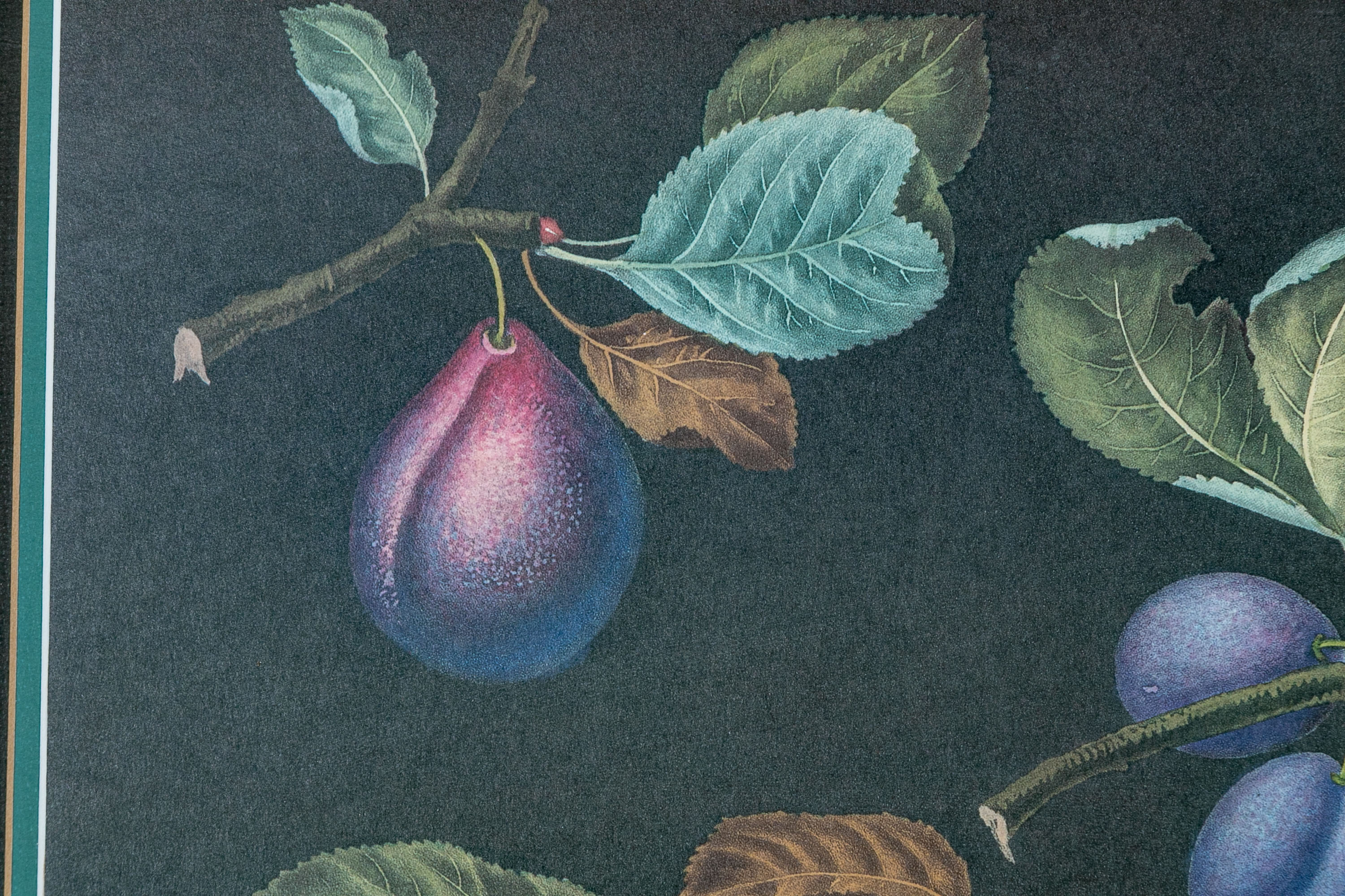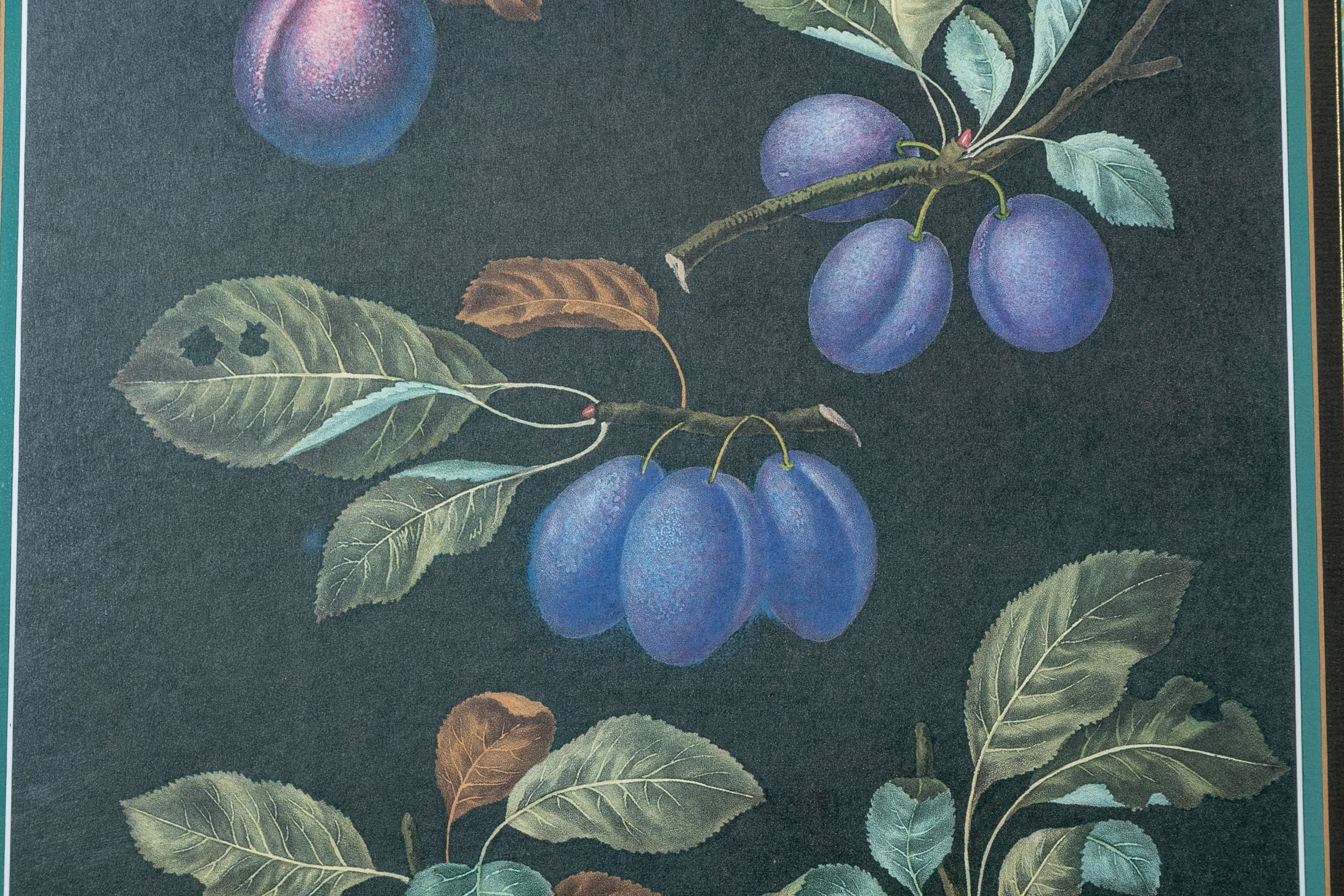 A wonderful duo of prints after George Brookshaw (British, 1751-1823) depicting drupes. The first features a group of purple plums and yellow apricots, while the second features branches of vibrant red cherries, both against dark backgrounds.