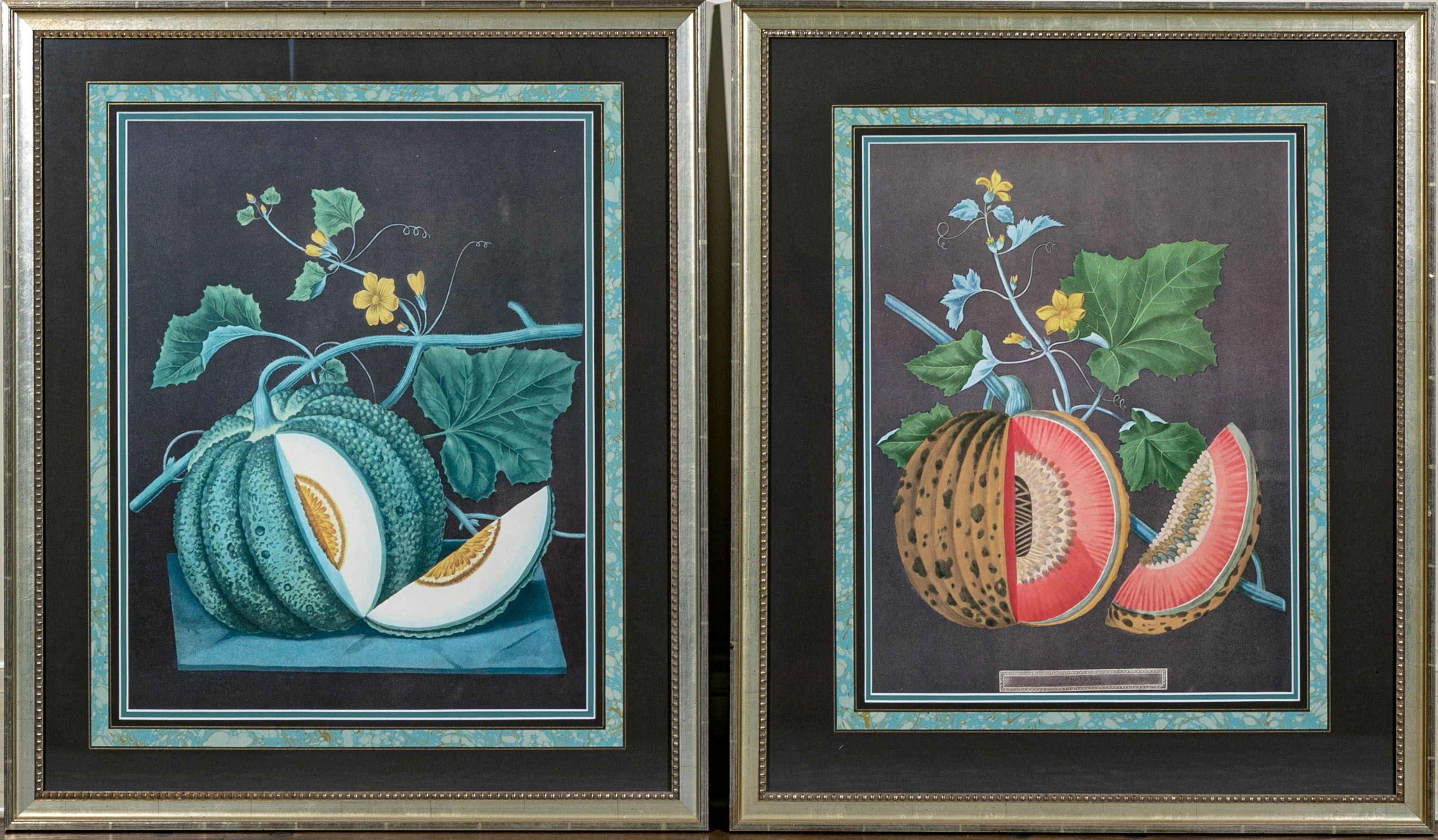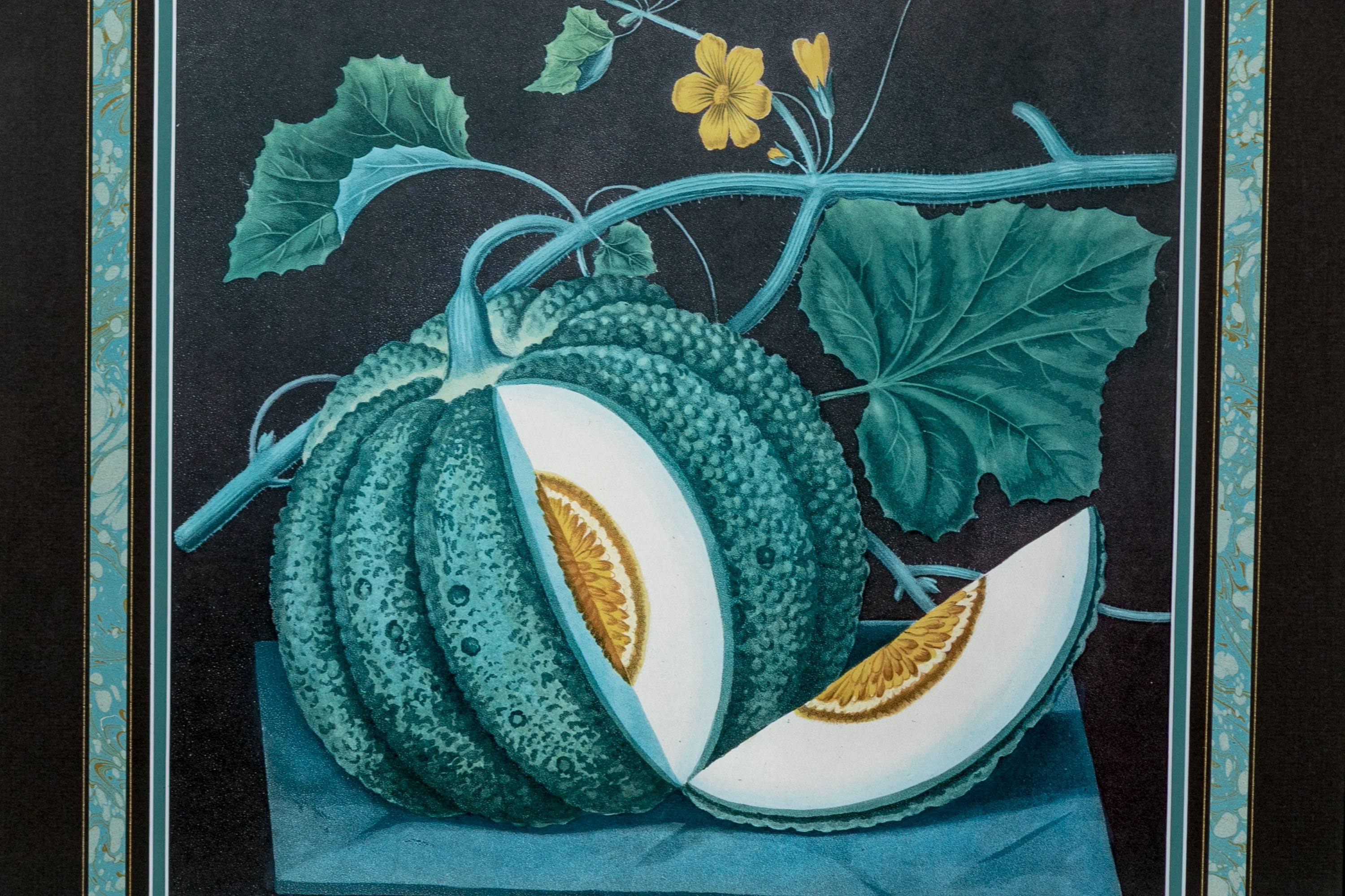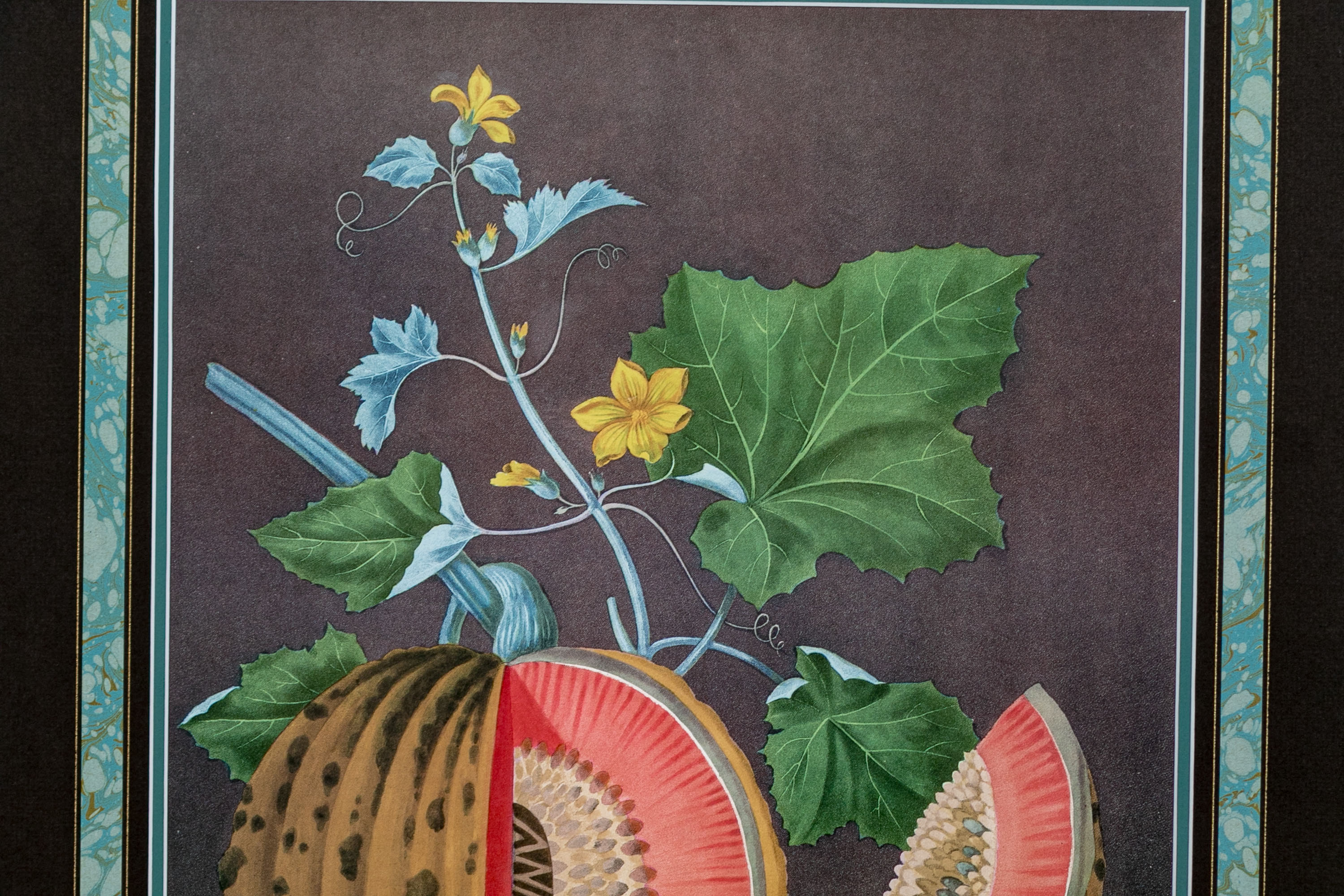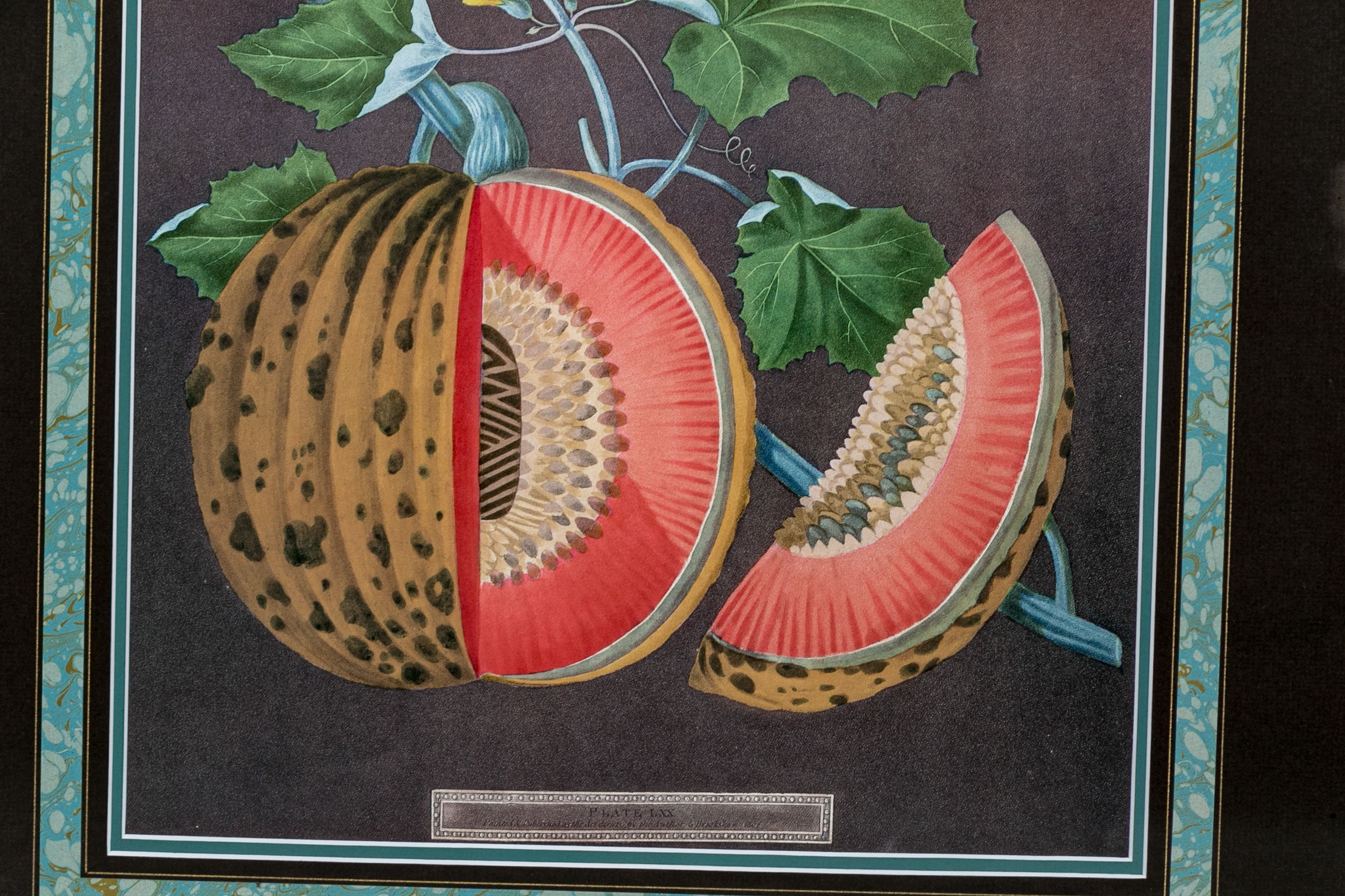 A wonderful duo of prints after George Brookshaw (British, 1751-1823) depicting melons. The first features a white-fleshed melon with bumpy green skin, while the second depicts a red-fleshed melon with spotted yellow-brown skin, both against dark backgrounds.