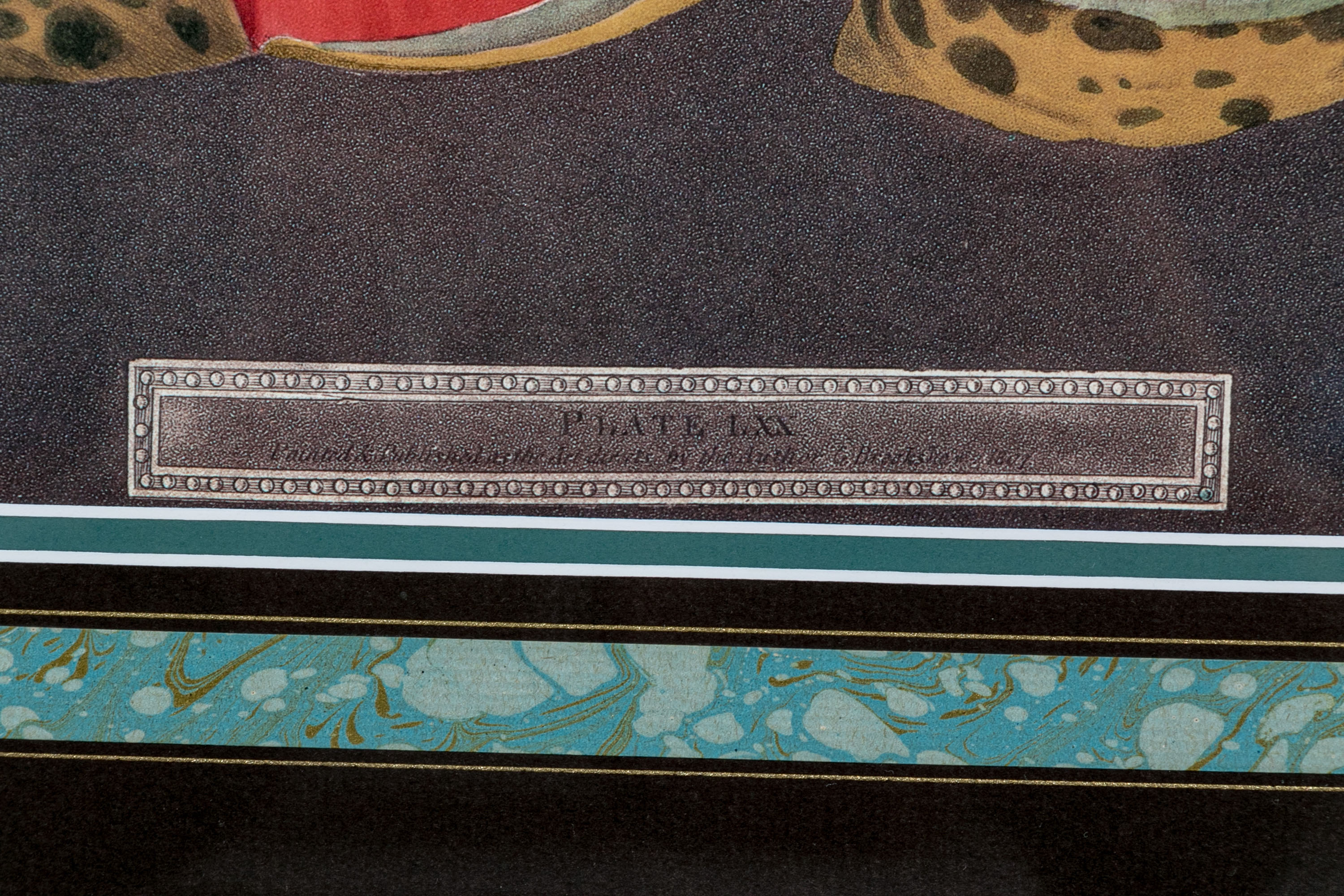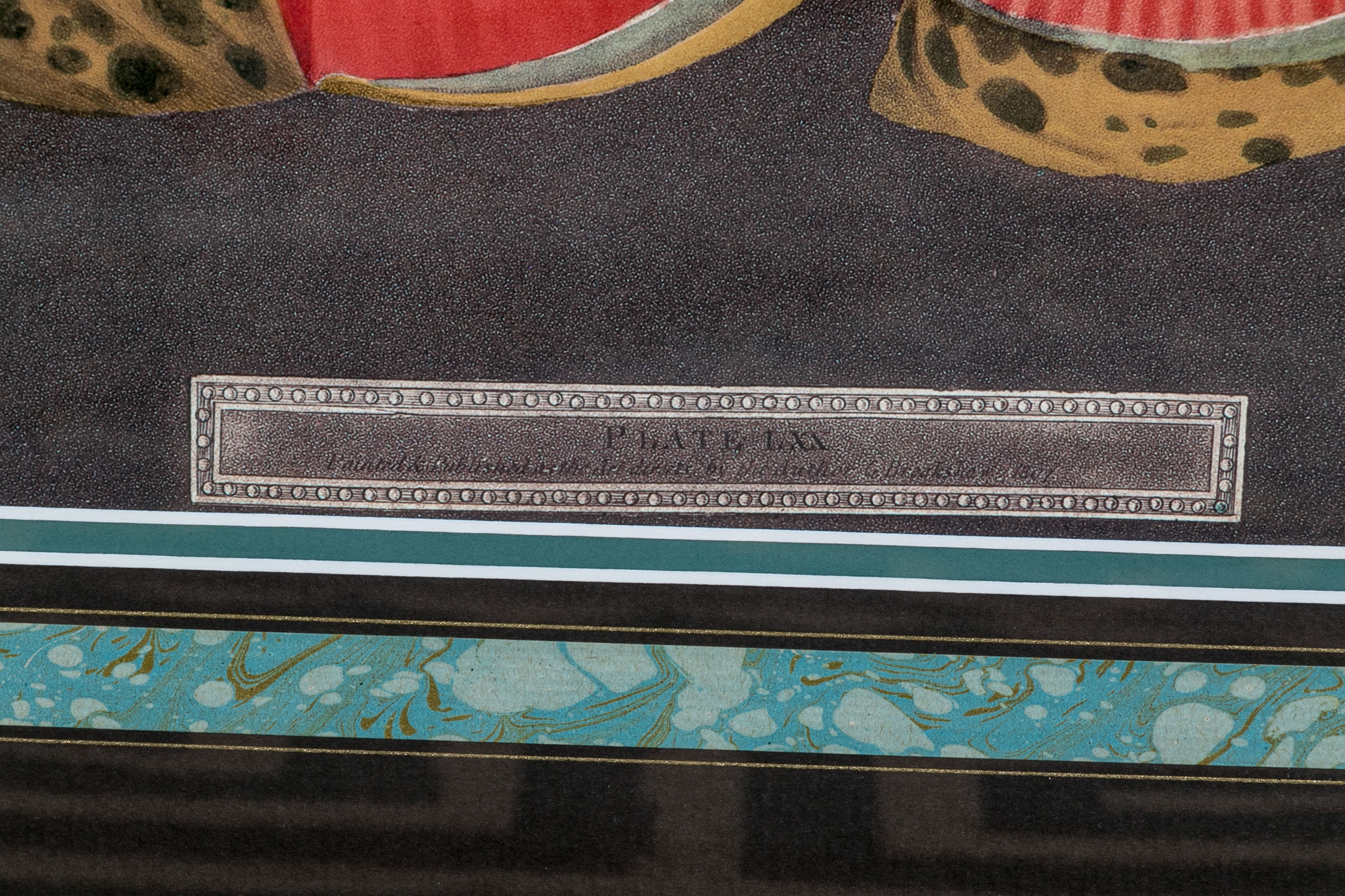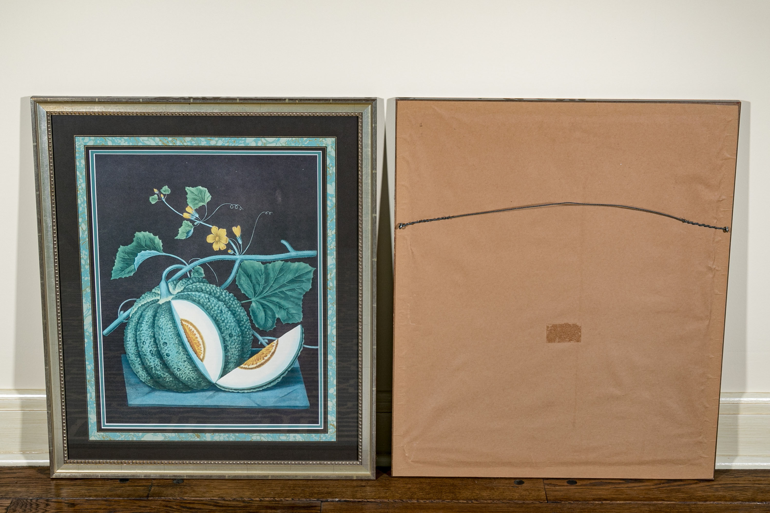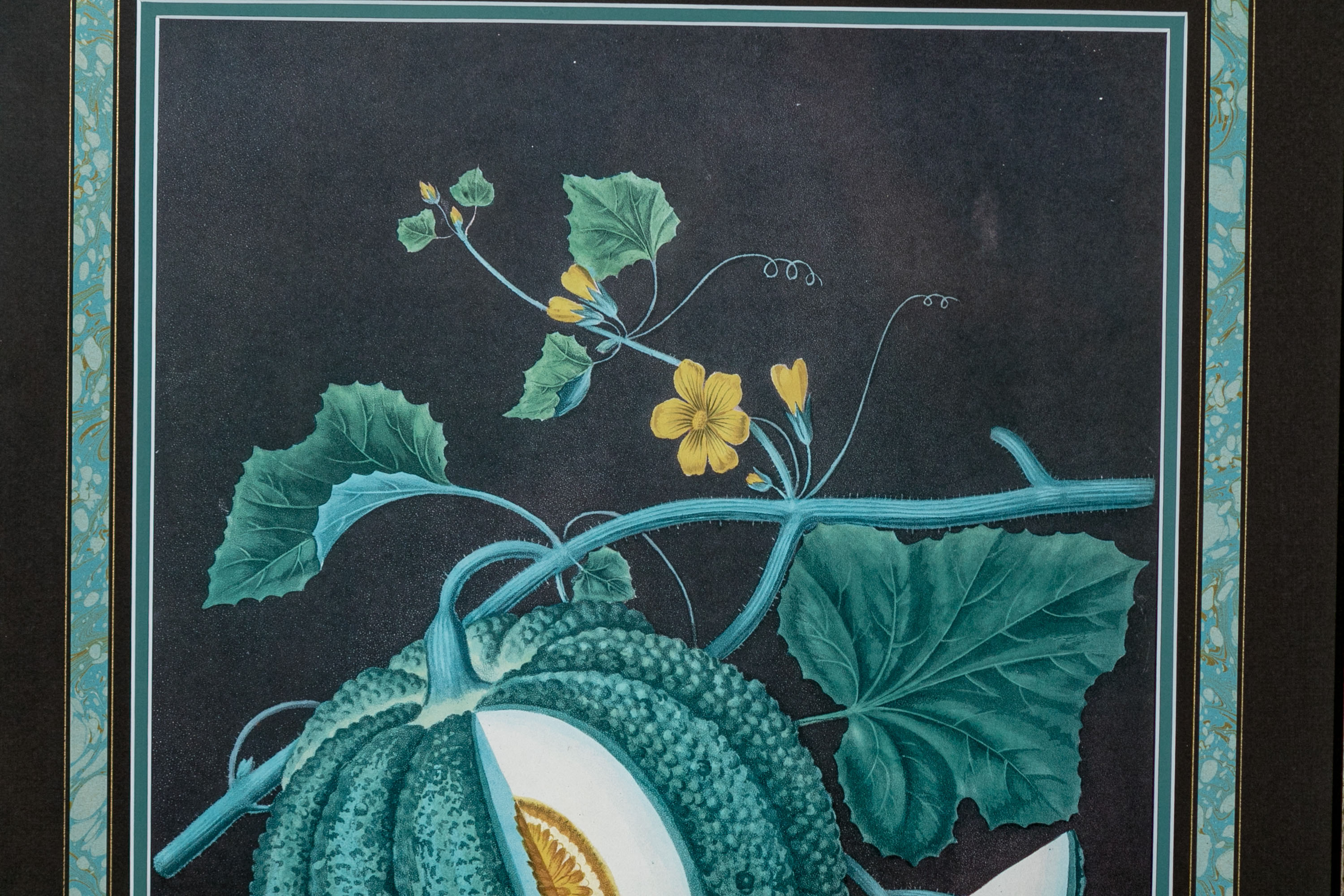 A wonderful duo of prints after George Brookshaw (British, 1751-1823) depicting melons. The first features a white-fleshed melon with bumpy green skin, while the second depicts a red-fleshed melon with spotted yellow-brown skin, both against dark backgrounds.