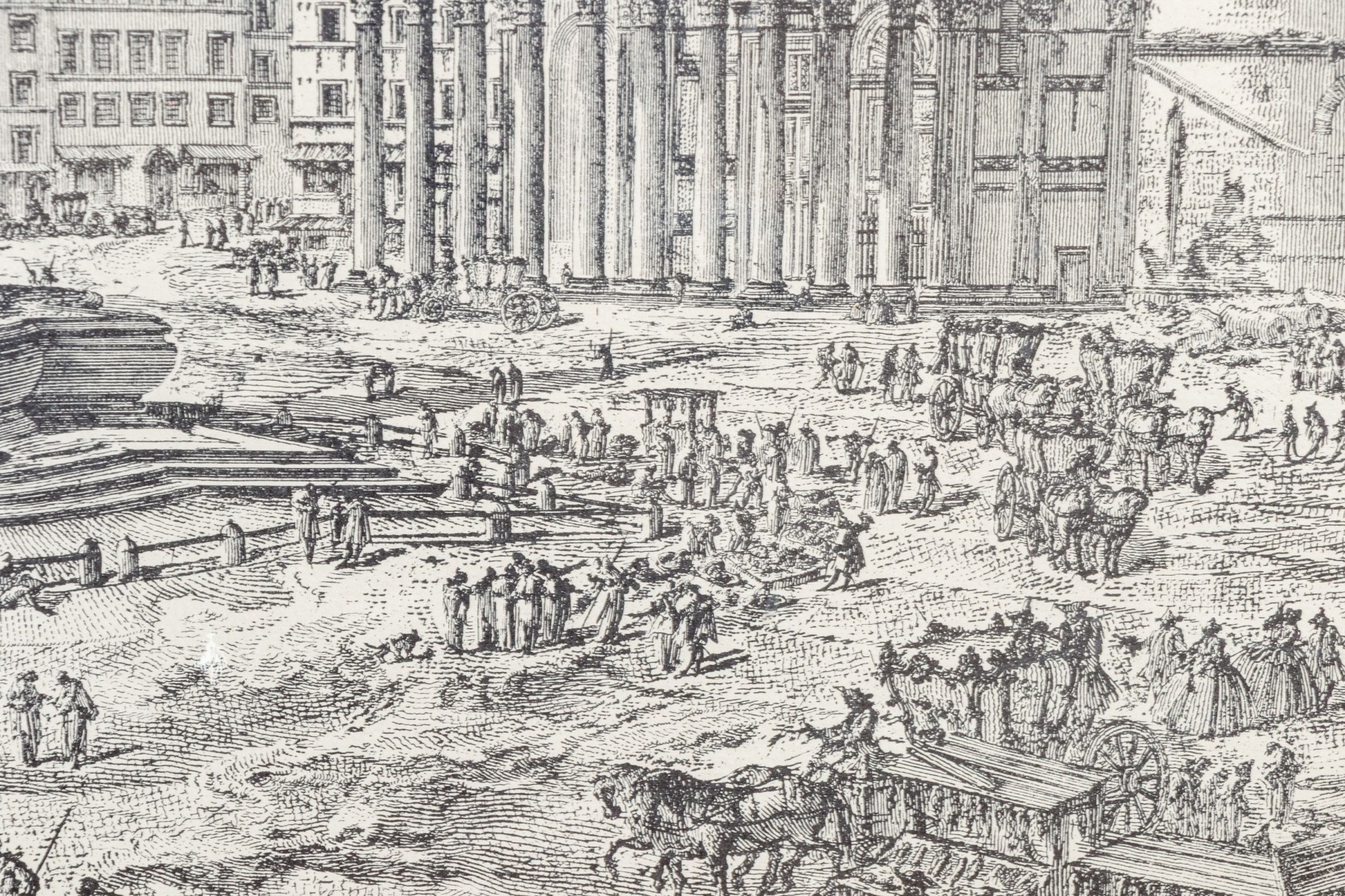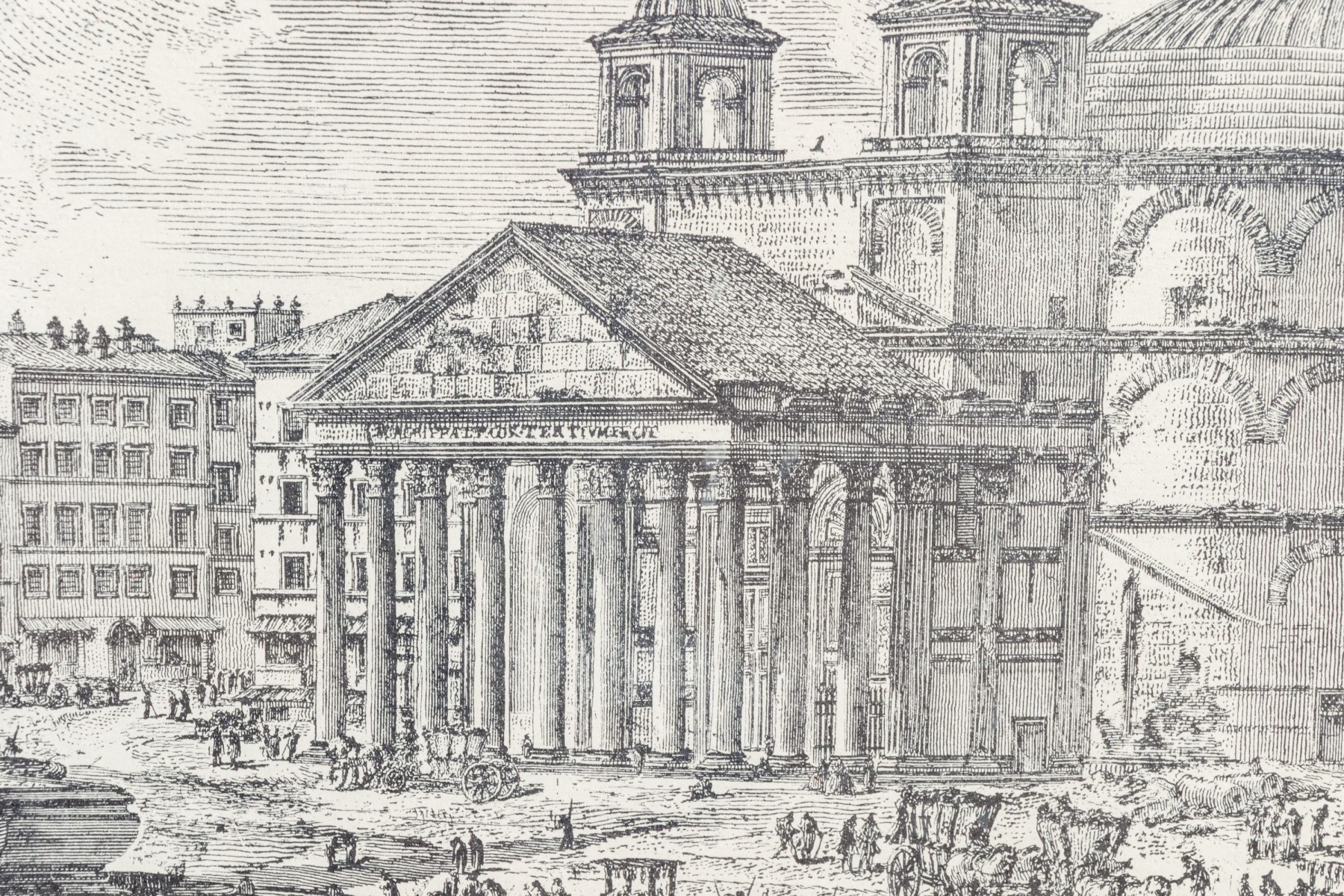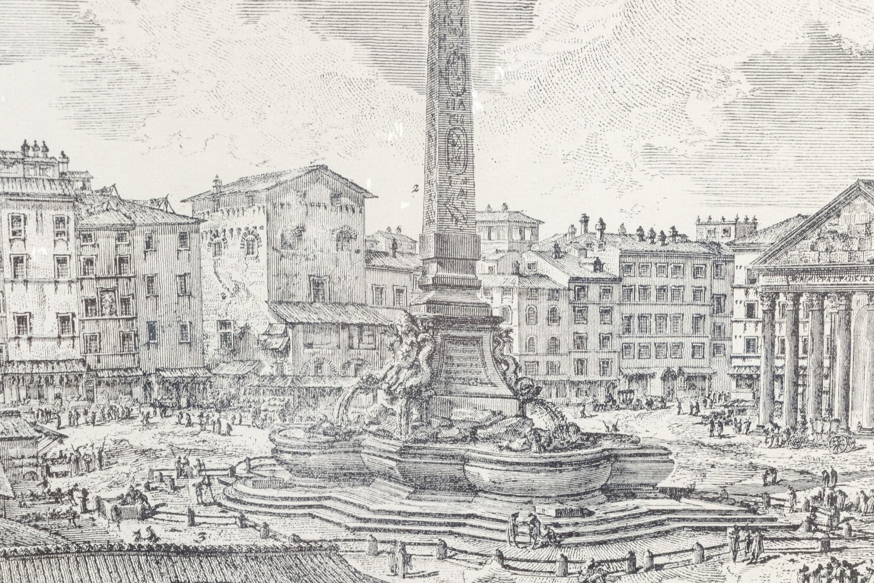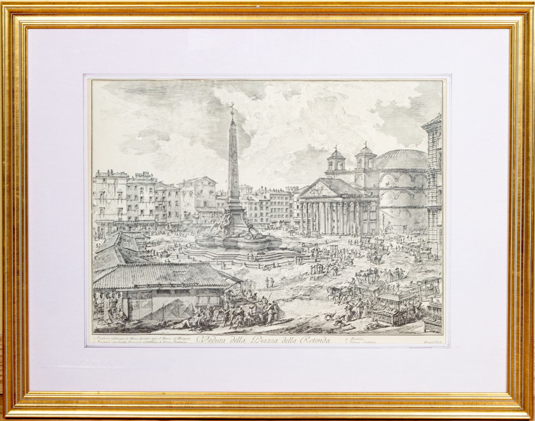 After Giovanni Battista Piranesi (Italian, 1720-1778) "Veduta della Piazza della Rotonda" etching depicting the titled Piazza with a view of the Pantheon and Obelisk. Nicely rendered with great detail throughout the architecture.