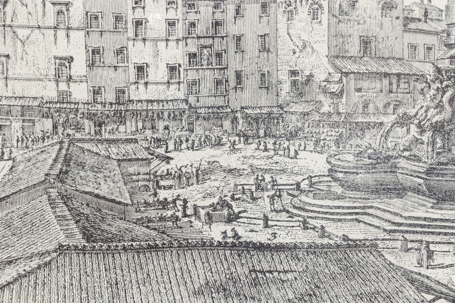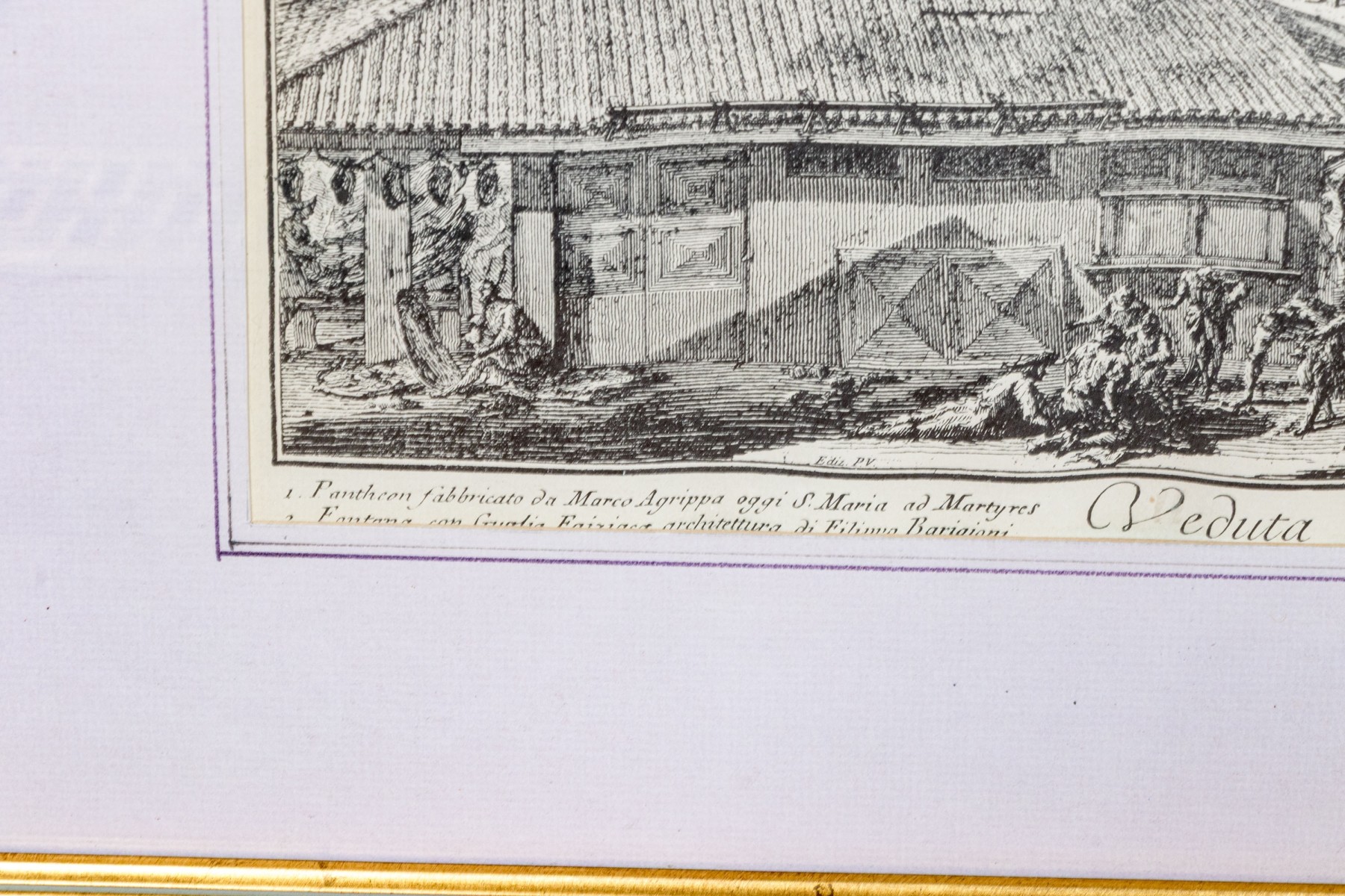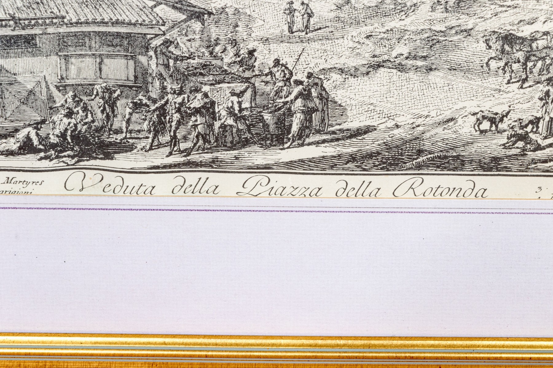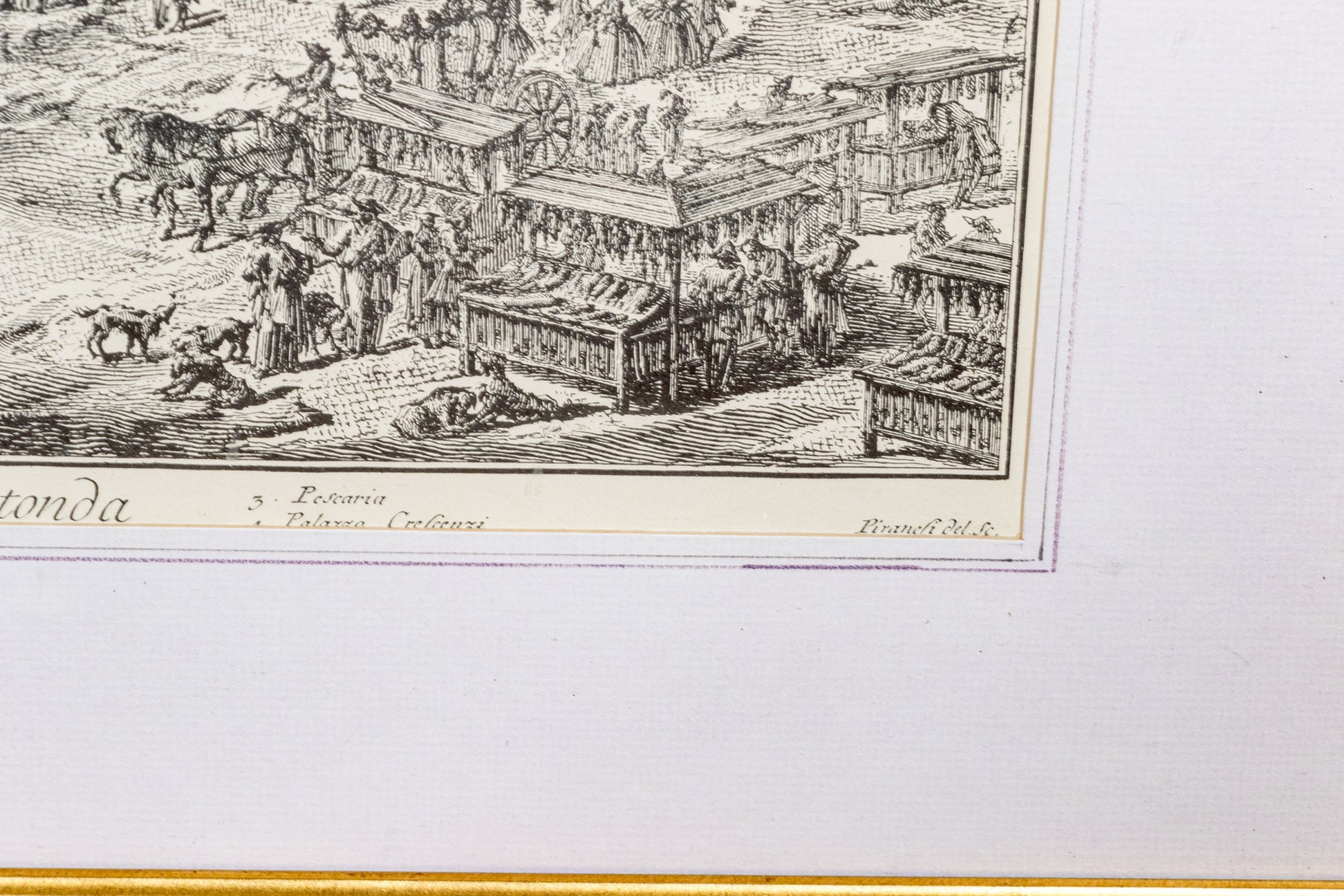 After Giovanni Battista Piranesi (Italian, 1720-1778) "Veduta della Piazza della Rotonda" etching depicting the titled Piazza with a view of the Pantheon and Obelisk. Nicely rendered with great detail throughout the architecture.