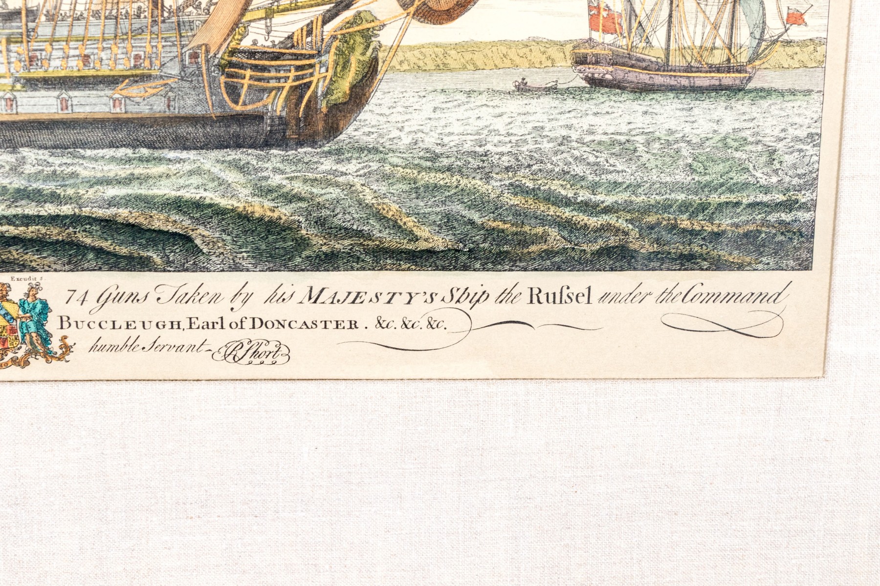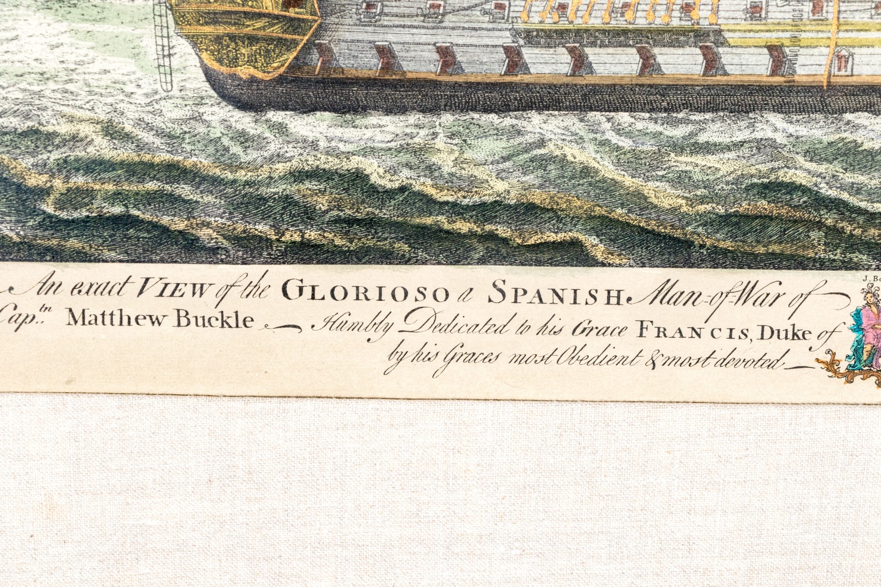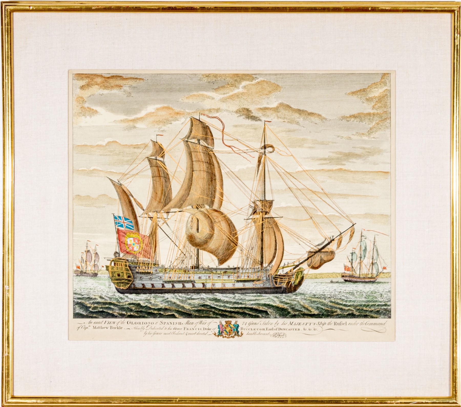 Name in plate above the center text. An exact view of the Glorioso Spanish Man-Of-War having had its guns taken by His Majesty's ship Rufsel. Presented in a linen mat in a gilt frame with glass.