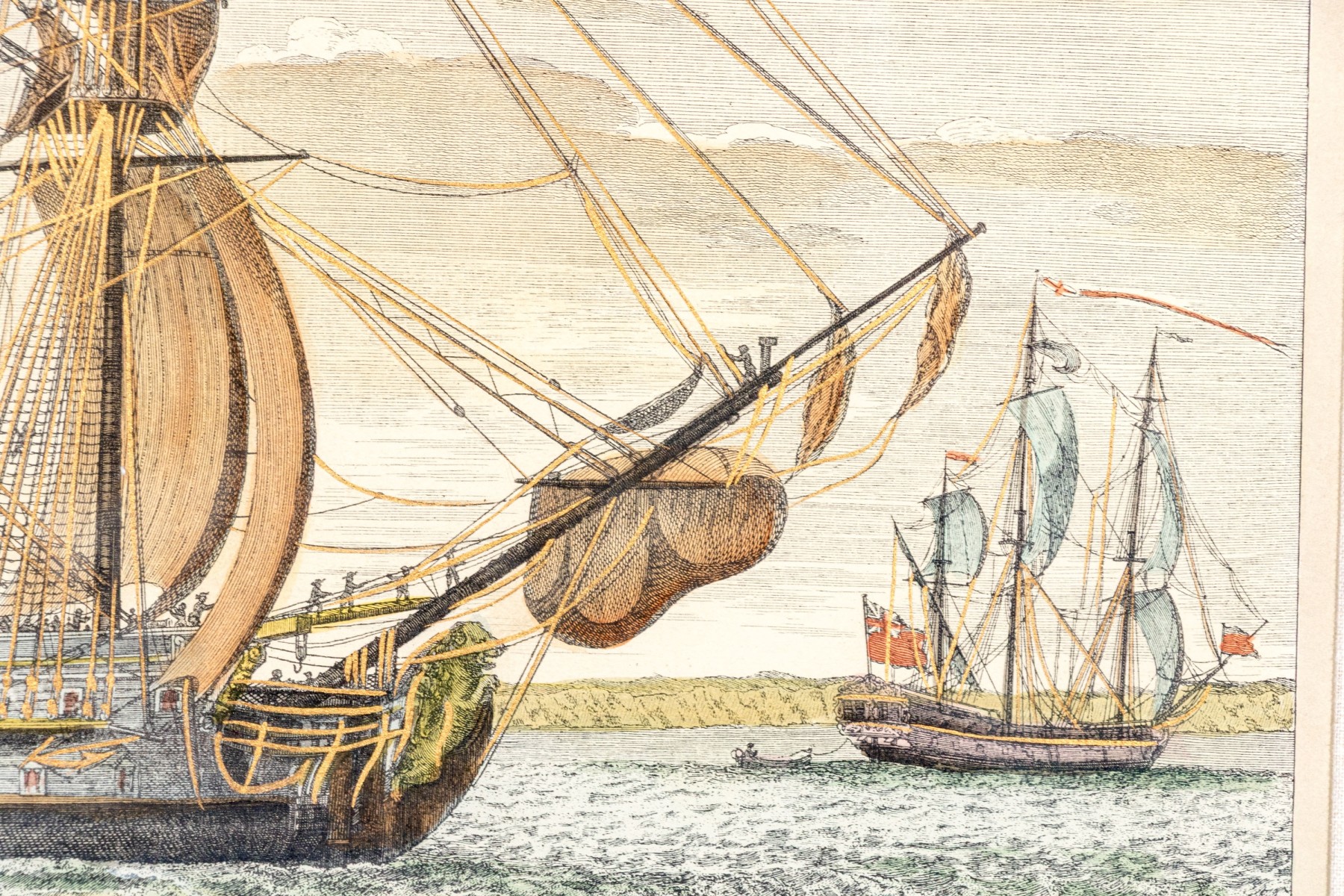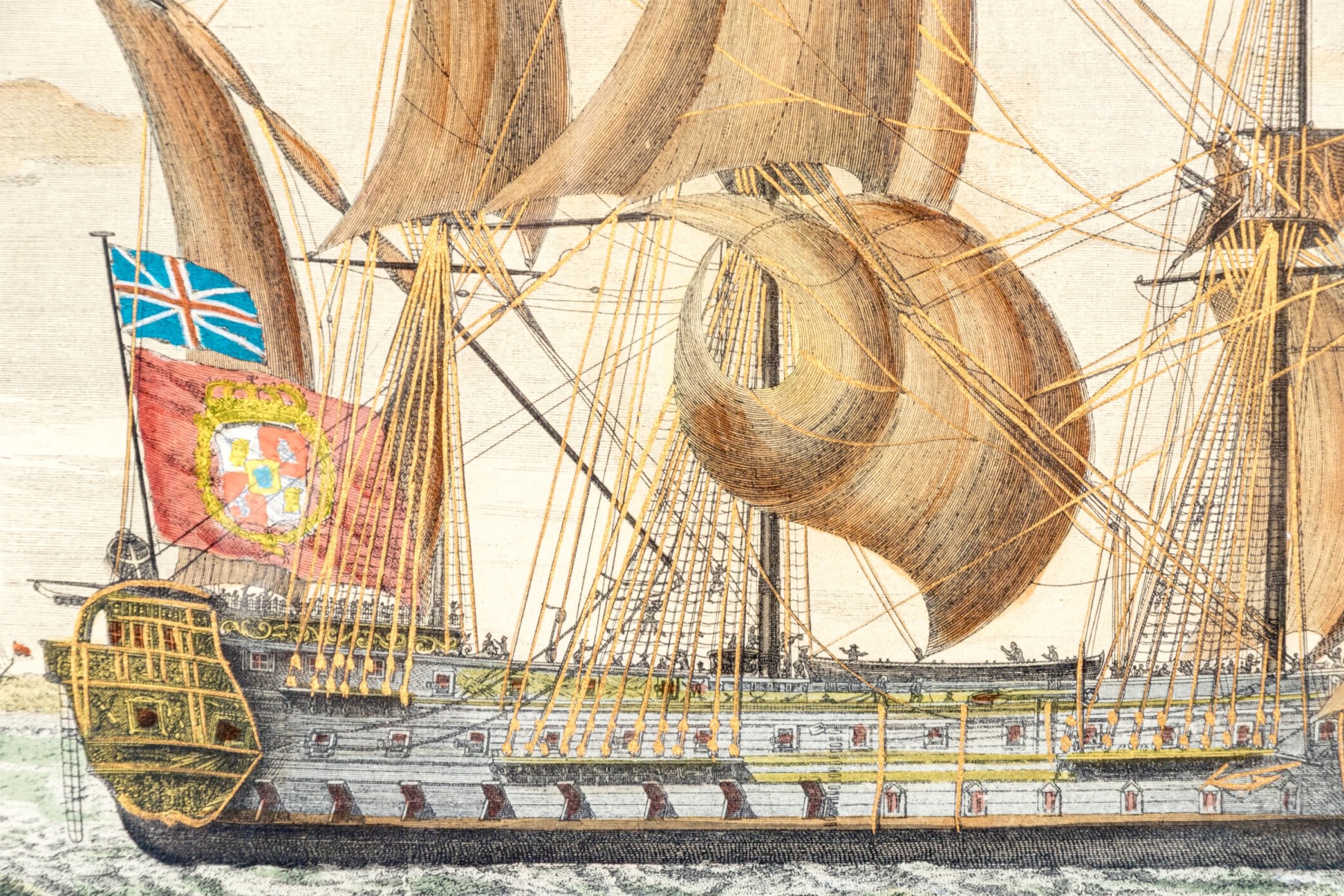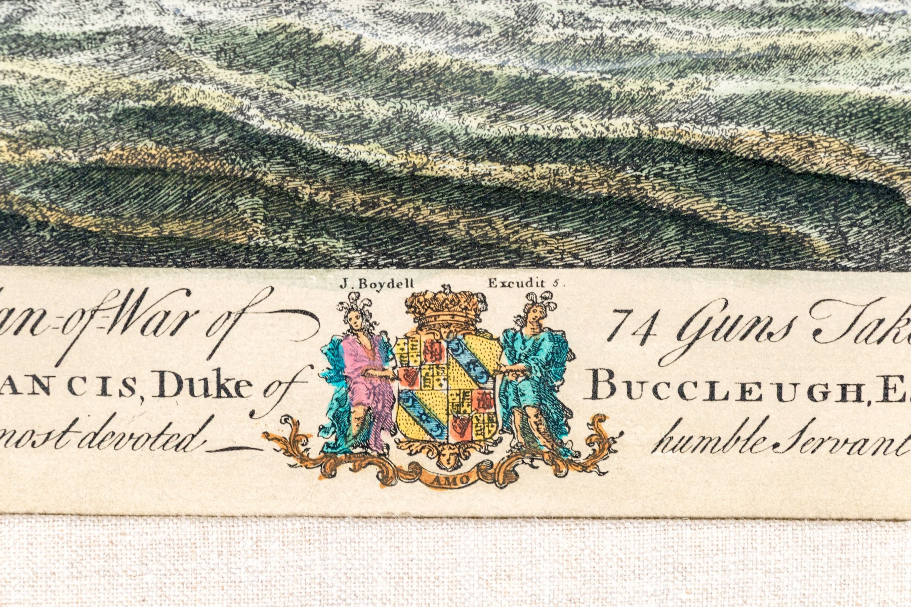 Name in plate above the center text. An exact view of the Glorioso Spanish Man-Of-War having had its guns taken by His Majesty's ship Rufsel. Presented in a linen mat in a gilt frame with glass.
