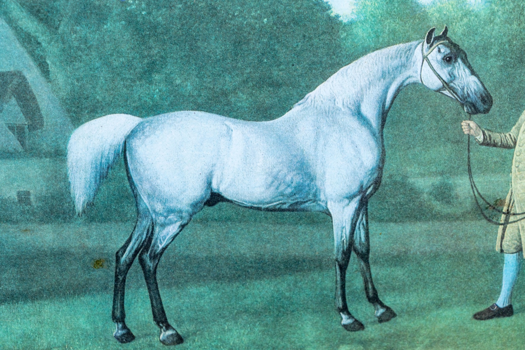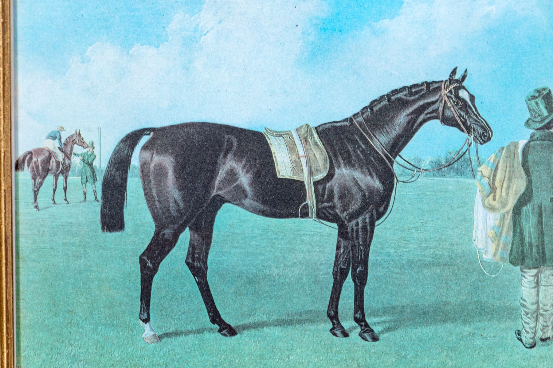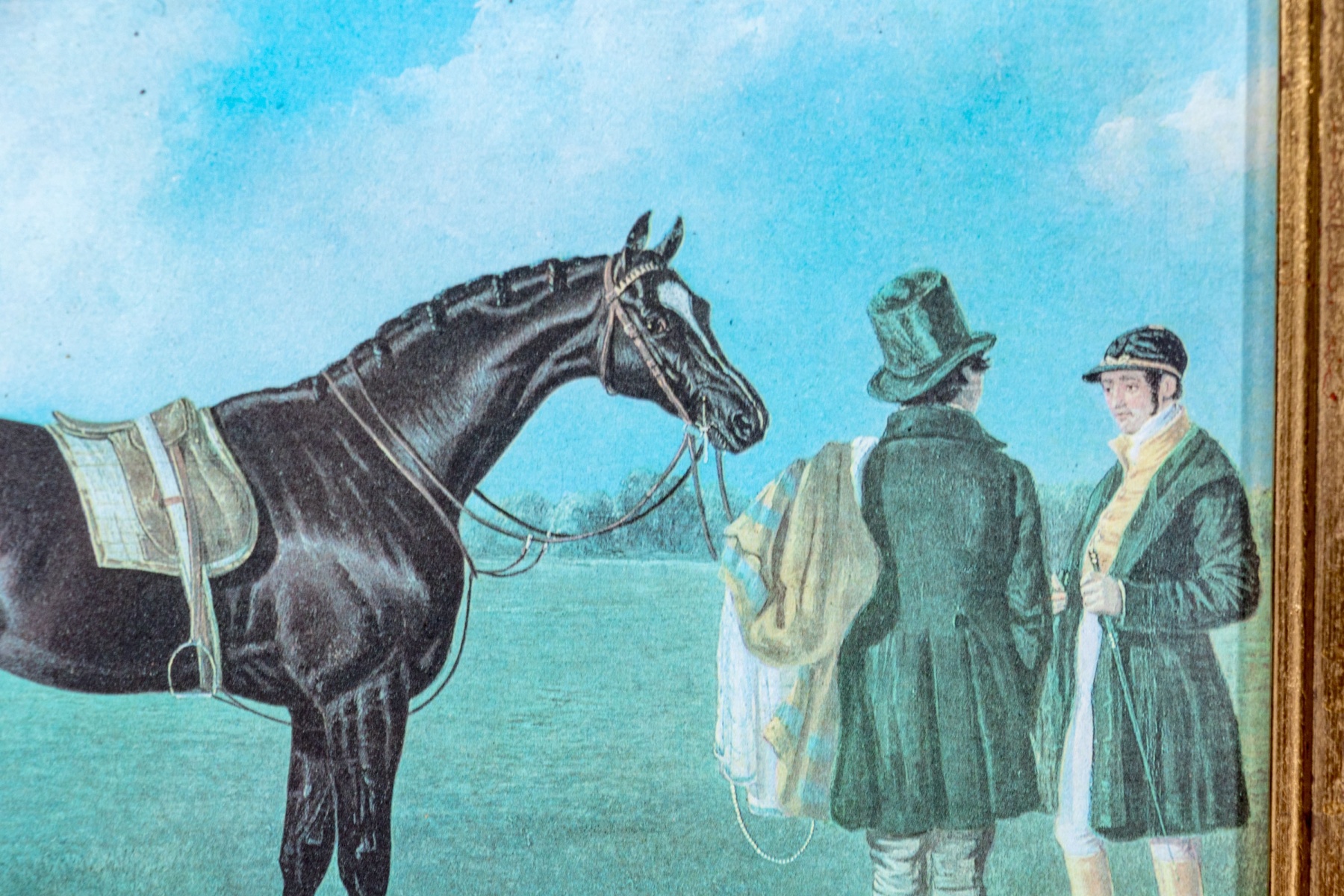 After John Frederick Herring Sr. (English, 1795-1865) "Touchstone" and after George Townley Stubbs (British, 1756-1815) "Gimcrack" prints depicting the titled horses rendered in impressive detail. Touchstone the black horse stands with well manicured hair and tail looking over at two men while another horse rides in the distance. Gimcrack the white horse is led by a man across a yard in front of a house.