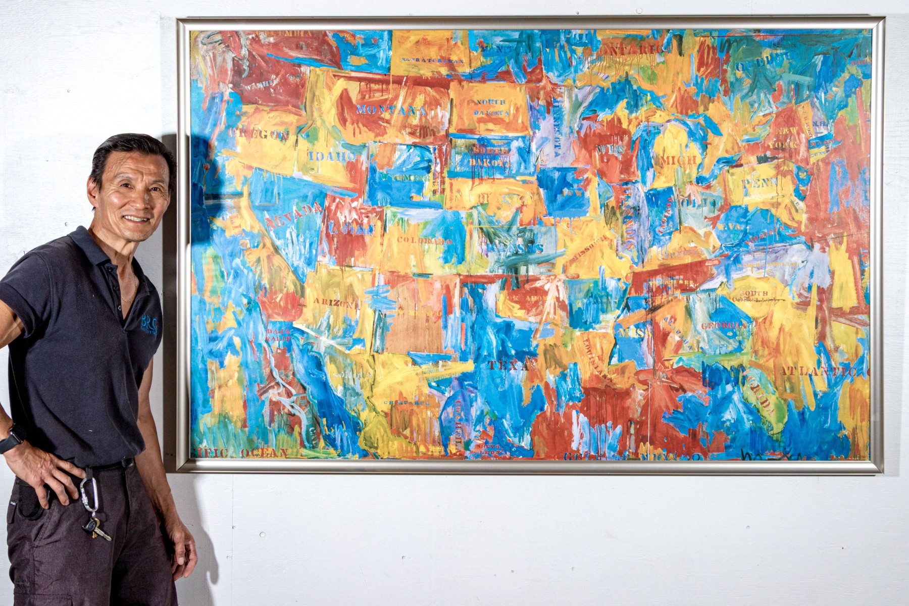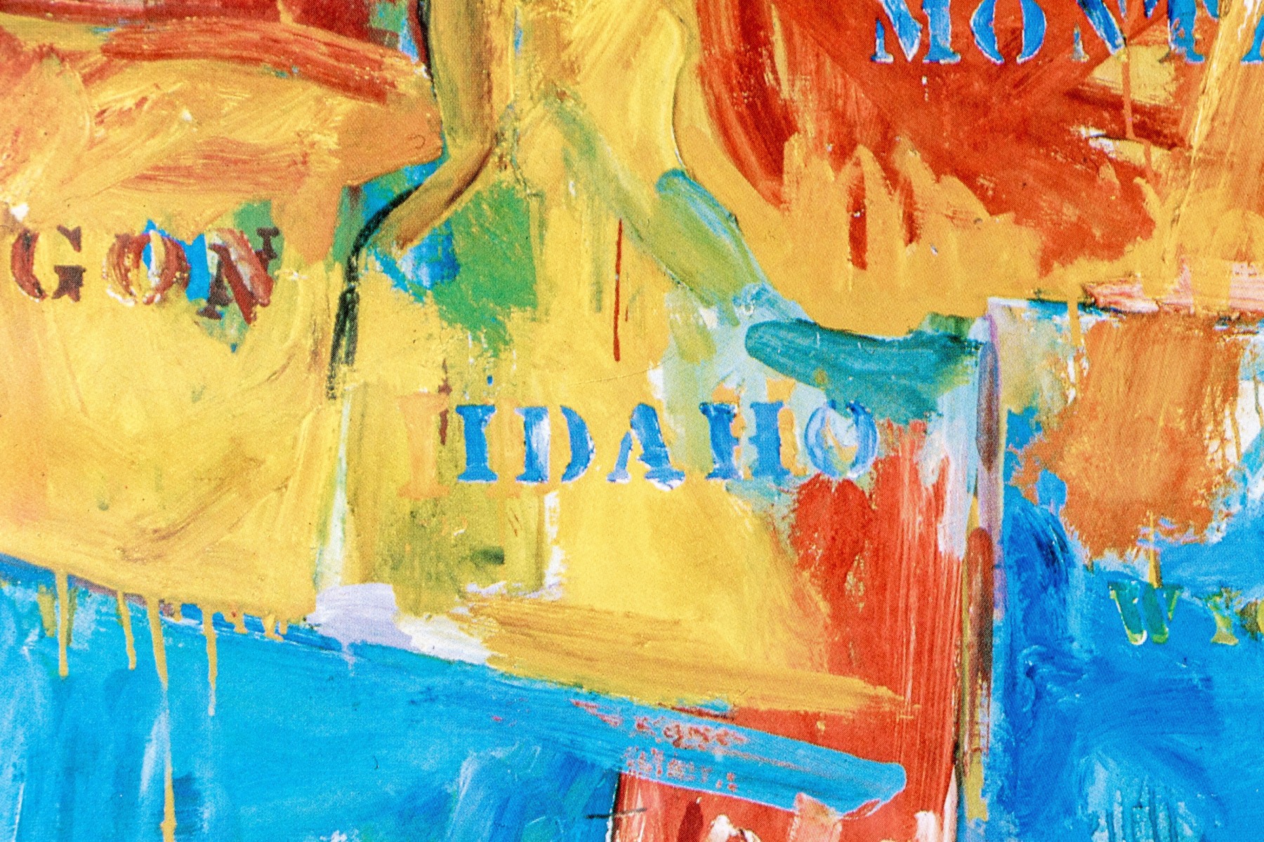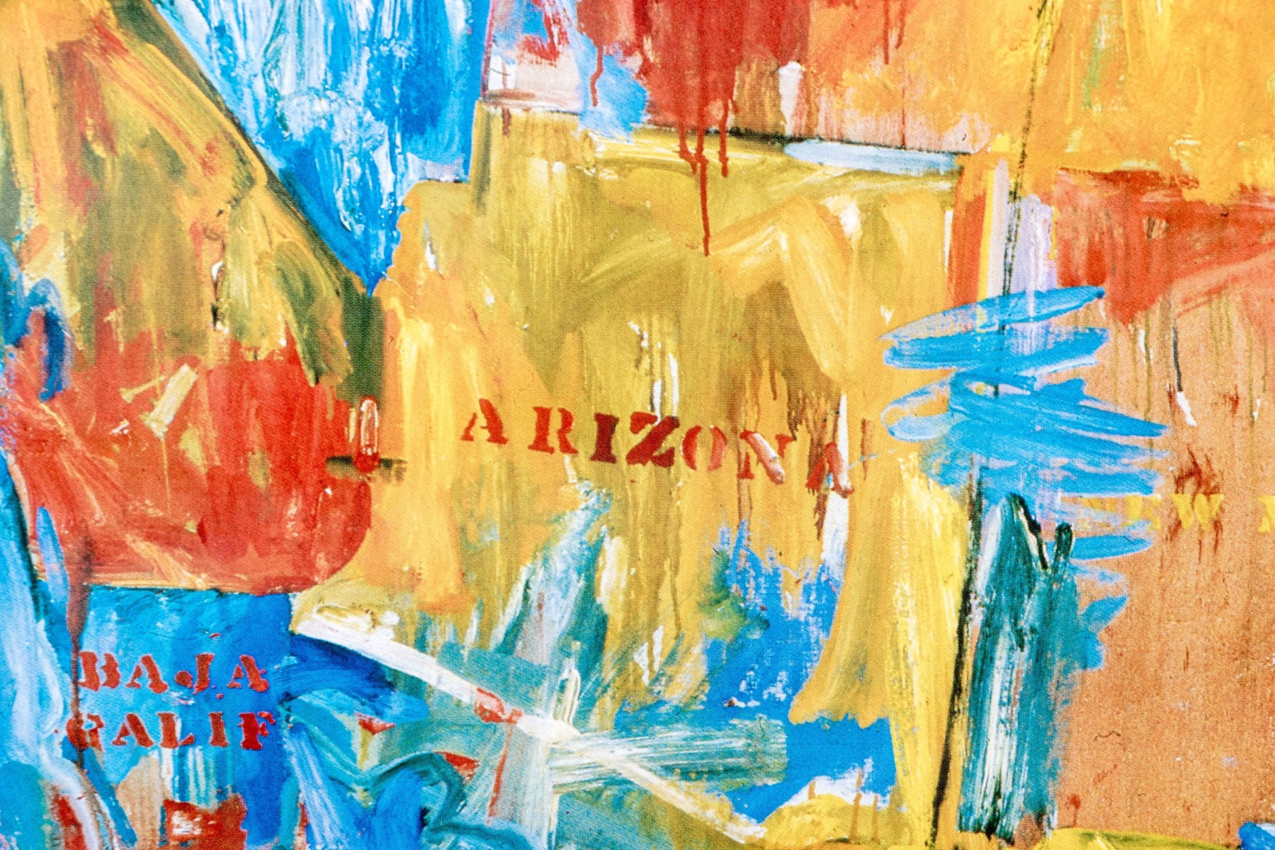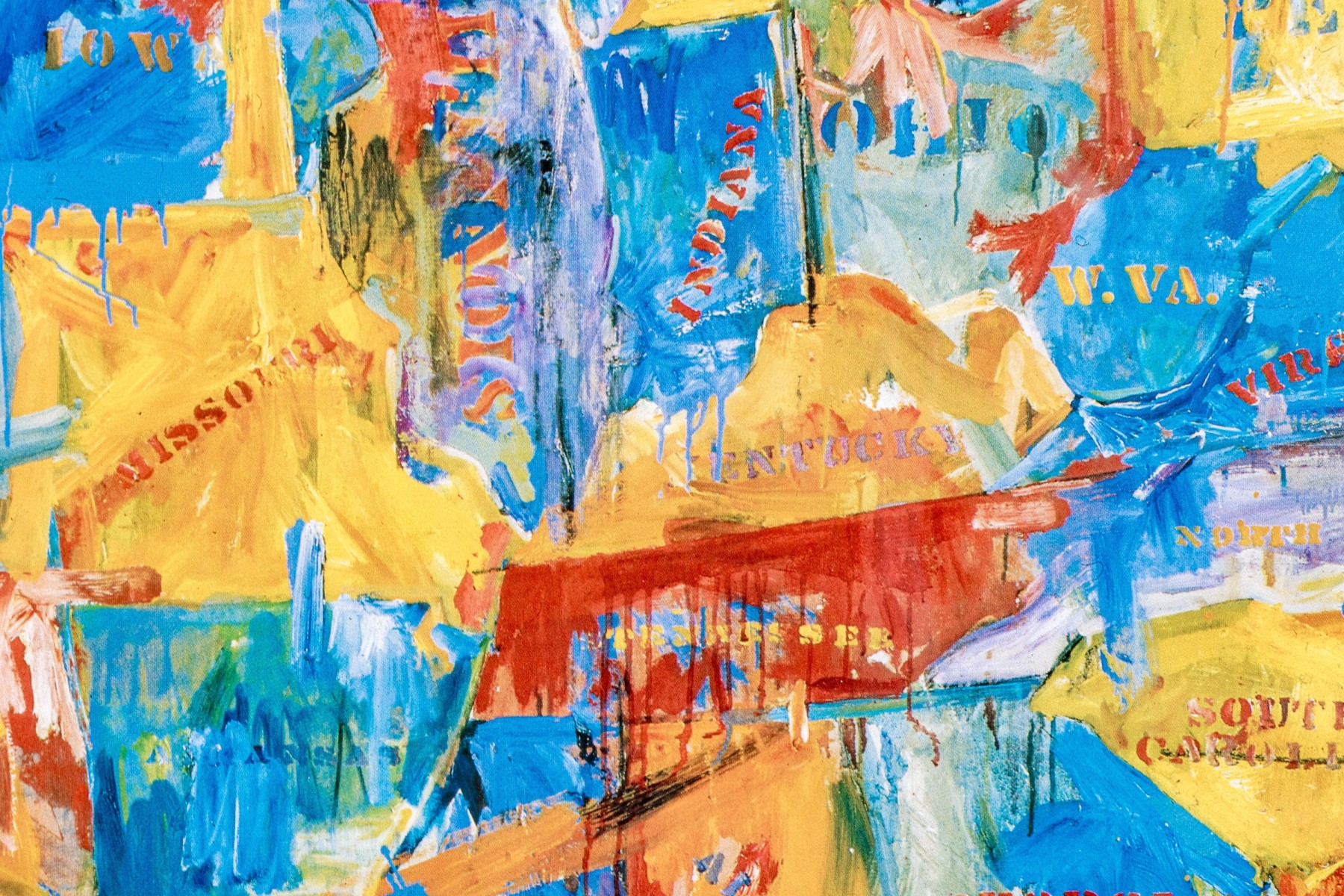 The color print after the artist's 1961 oil on canvas in the Museum of Modern Art New York. Titled "Map", it is an abstract cartographic image of the US. Presented in a silver tone metal frame with glass.