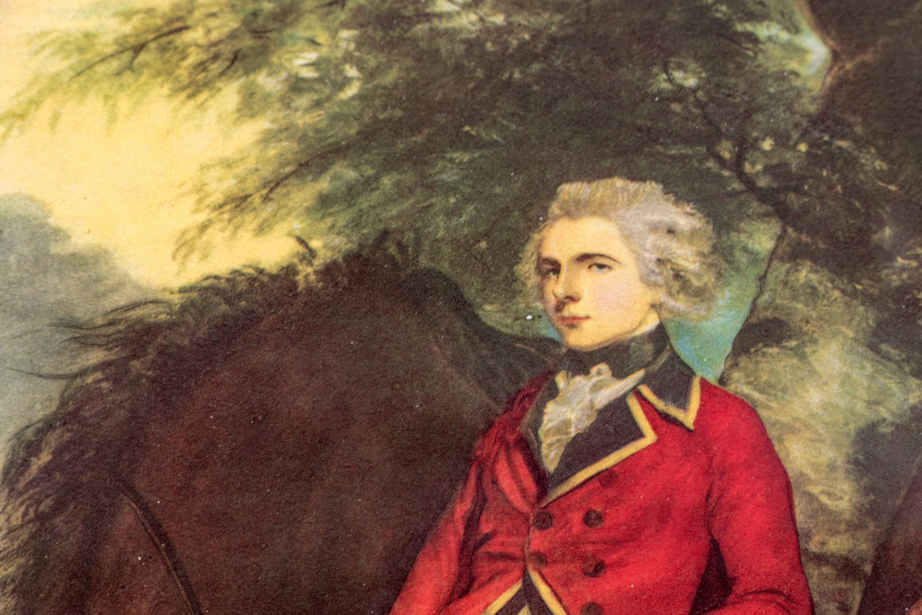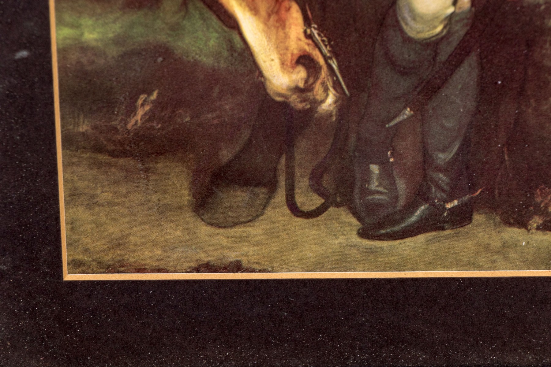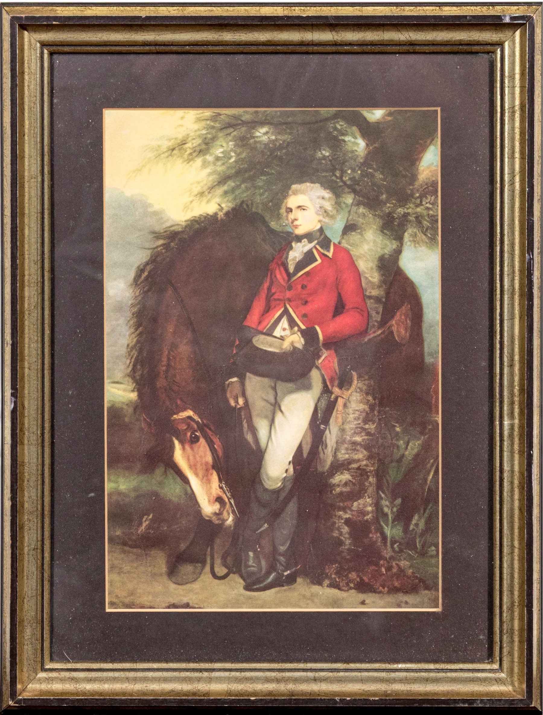 After Joshua Reynolds (English, 1723-1792) "Captain George K.H. Coussmaker, Grenadier Guards (1759-1801)" print depicted the titled captain in red uniform leaning against a tree while a brown horse inspects his boots.
