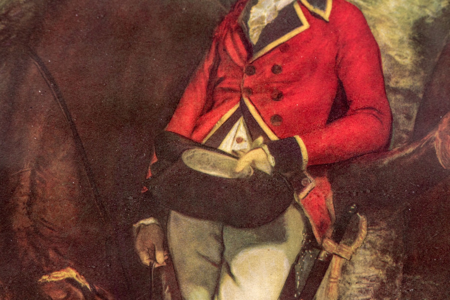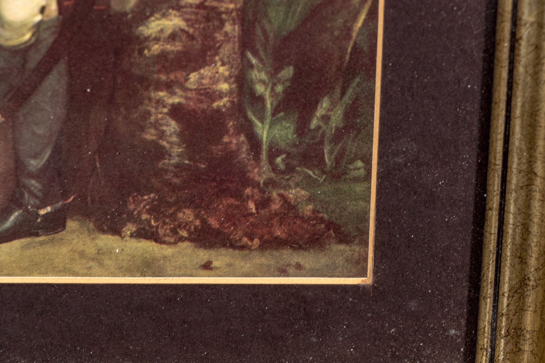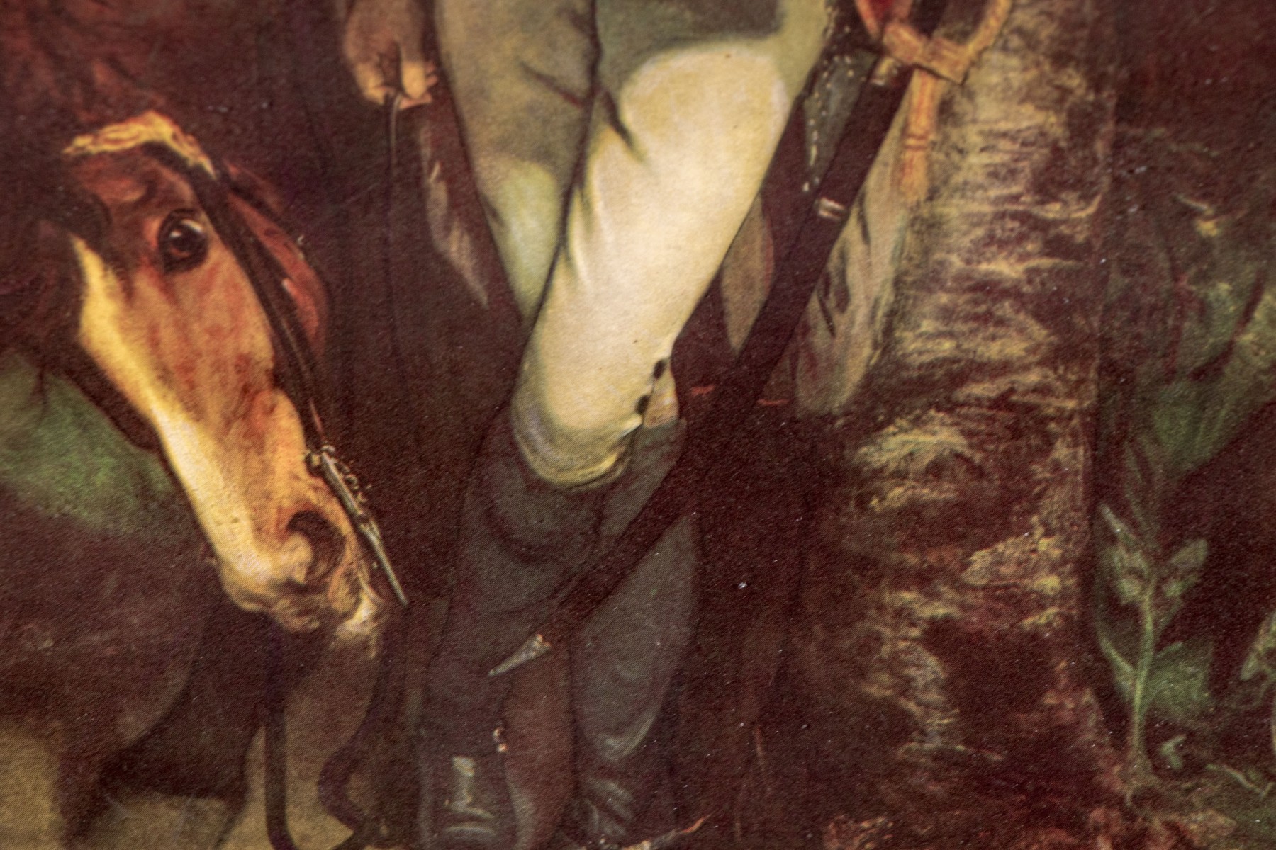 After Joshua Reynolds (English, 1723-1792) "Captain George K.H. Coussmaker, Grenadier Guards (1759-1801)" print depicted the titled captain in red uniform leaning against a tree while a brown horse inspects his boots.