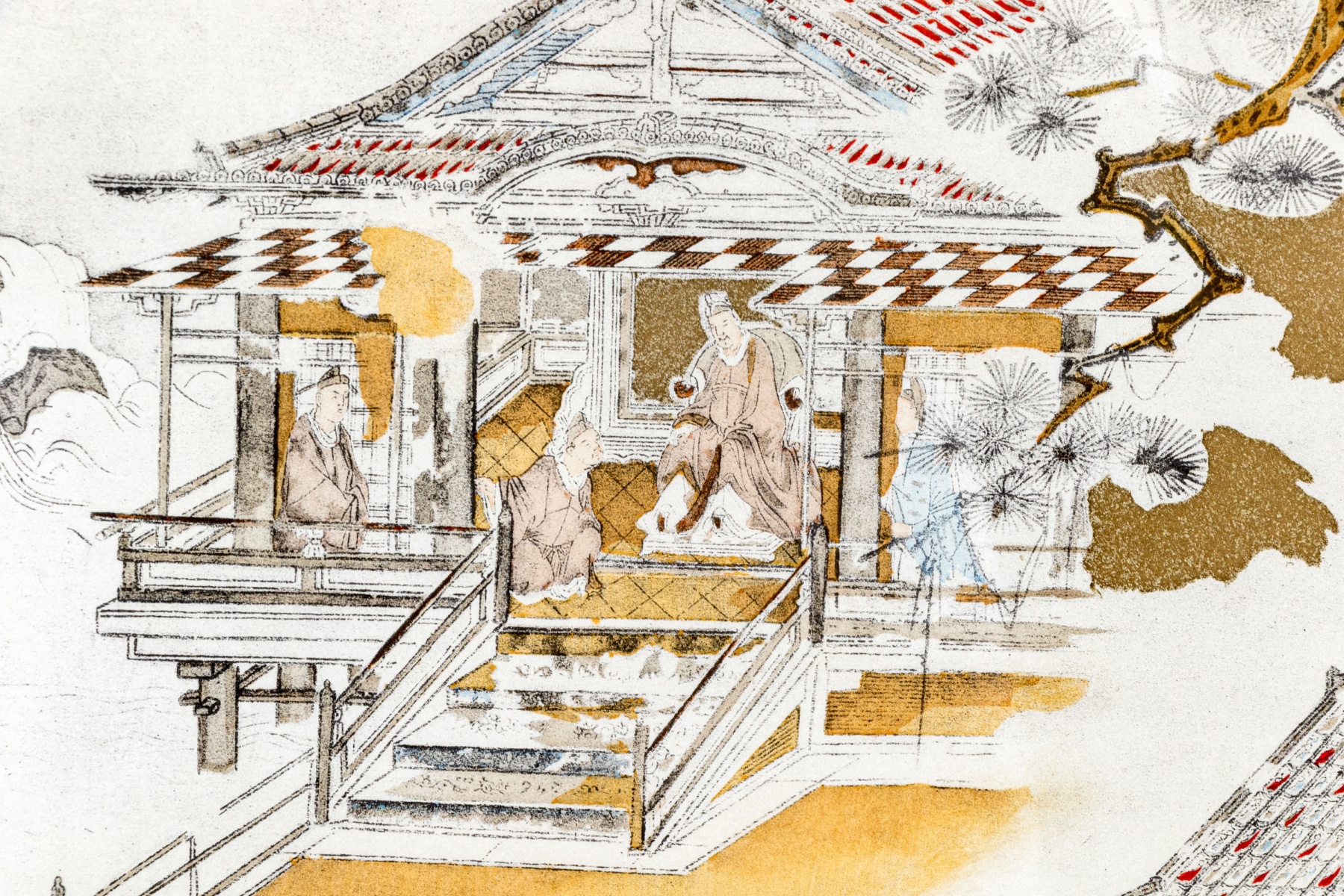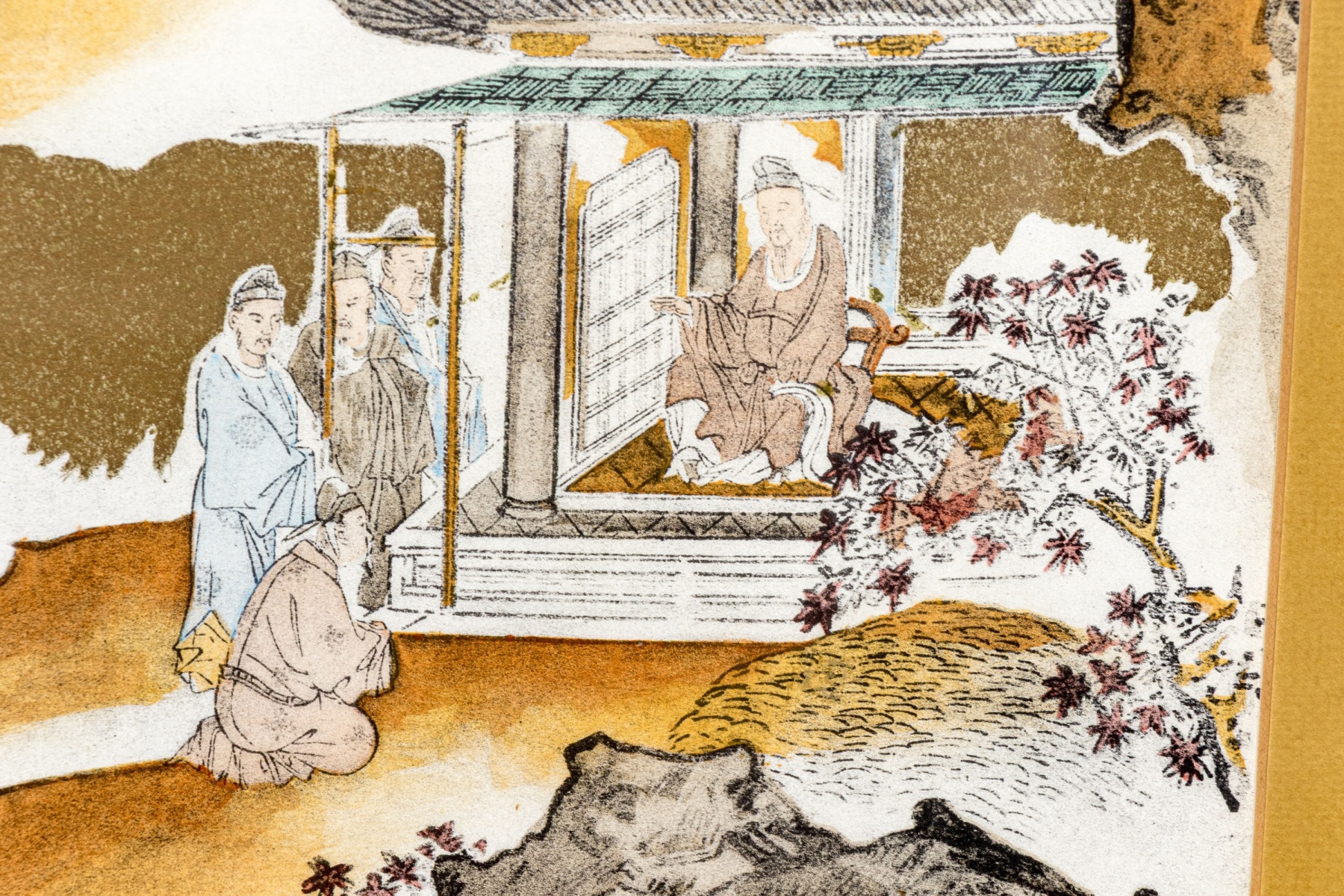 After Kanō Tan'yū (Japanese, 1602-1674) "Summer Palace" lithograph depicting a sprawling series of traditional architecture and figures walkin along bridges between courtyards in beautiful detail and rich color with gilt embellishment.