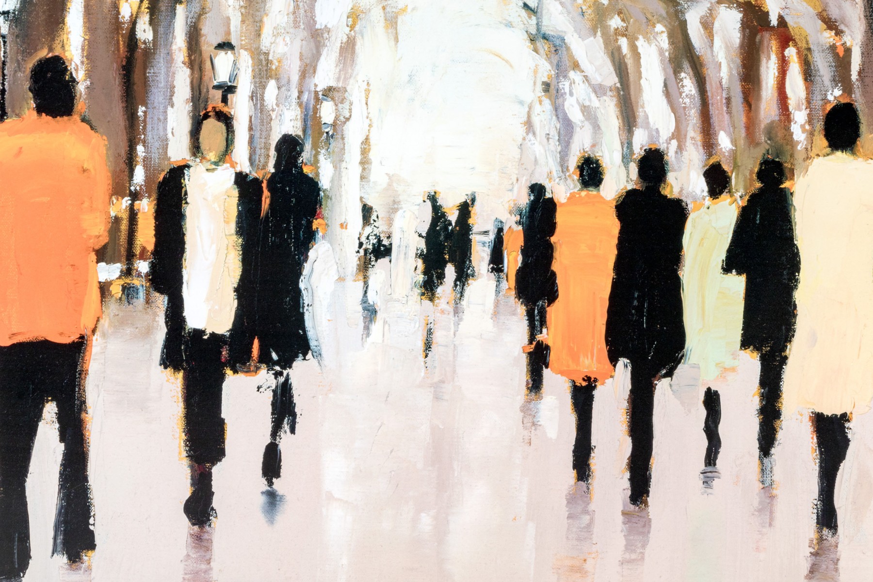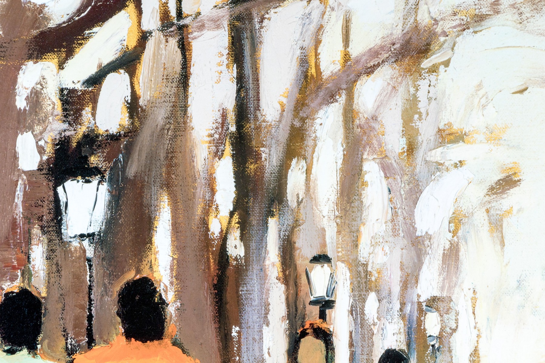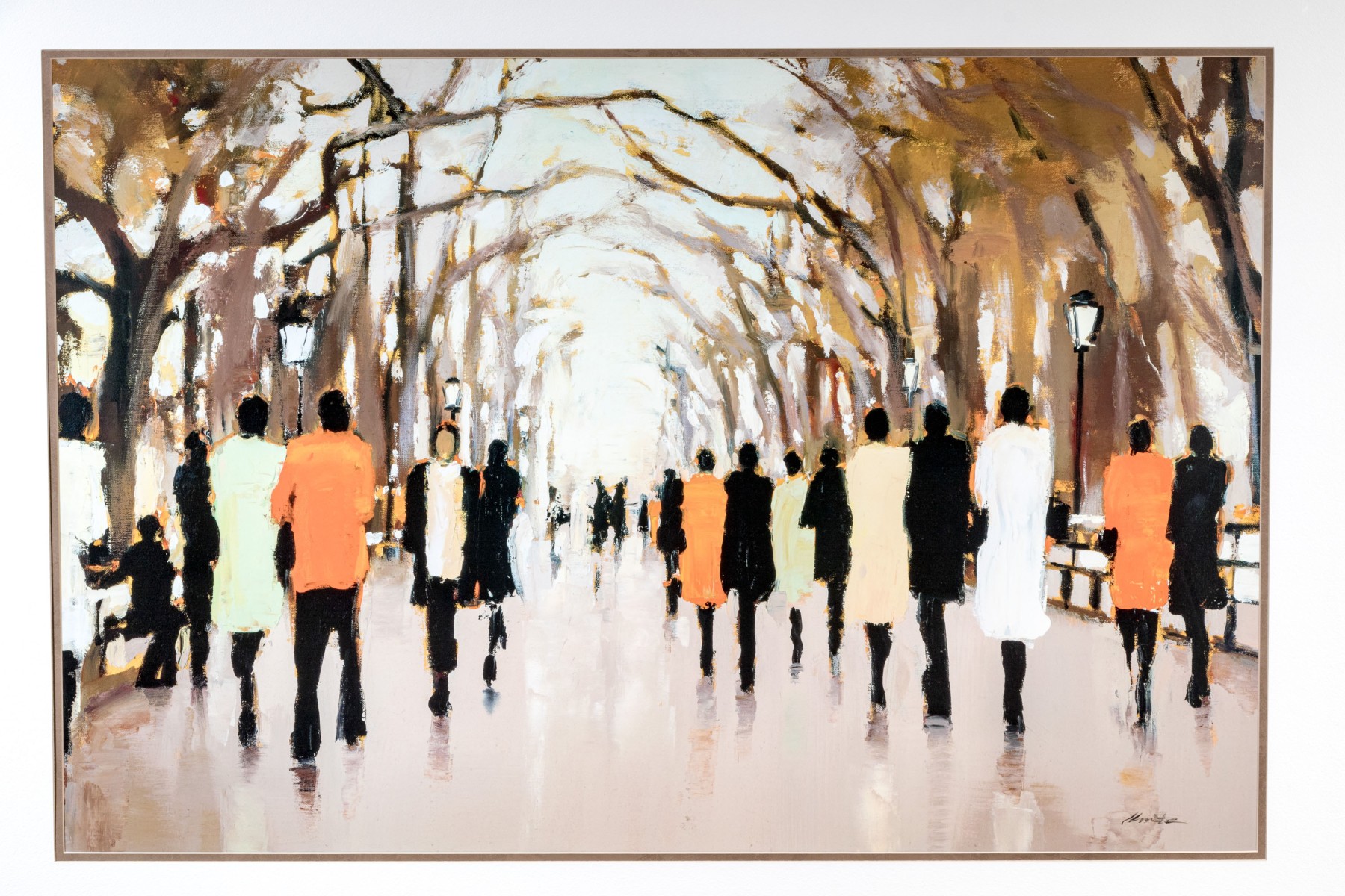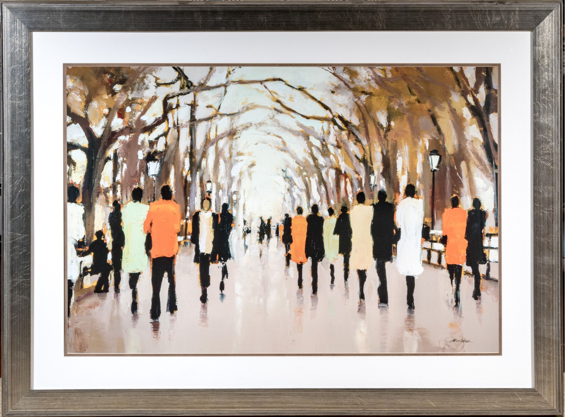 A wonderfully framed art print depicting an Impressionistic, a la plein air style work depicting figures coming and going. Presented handsomely matted, within a silver finished frame and glazed with plexi.