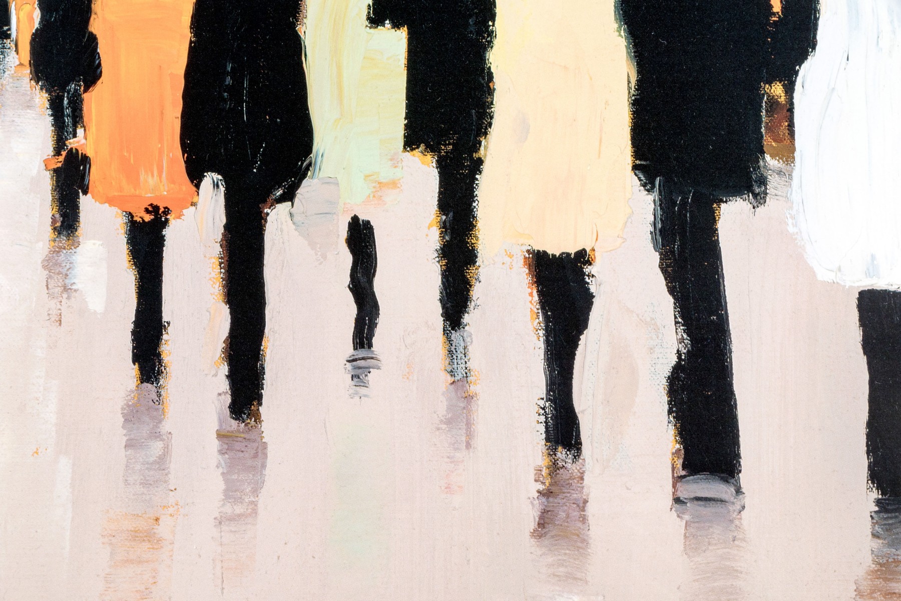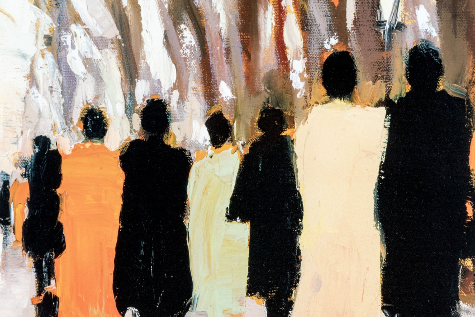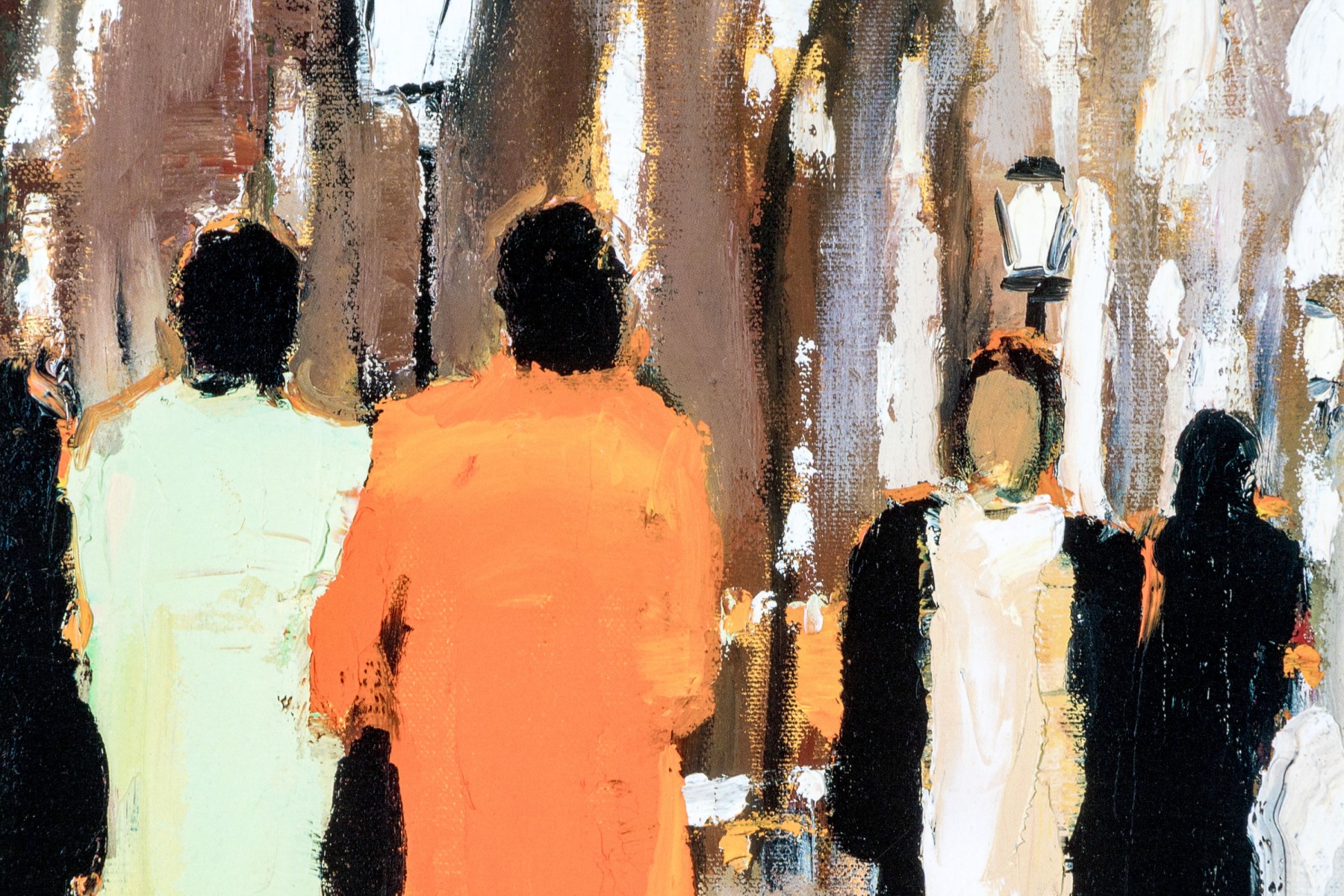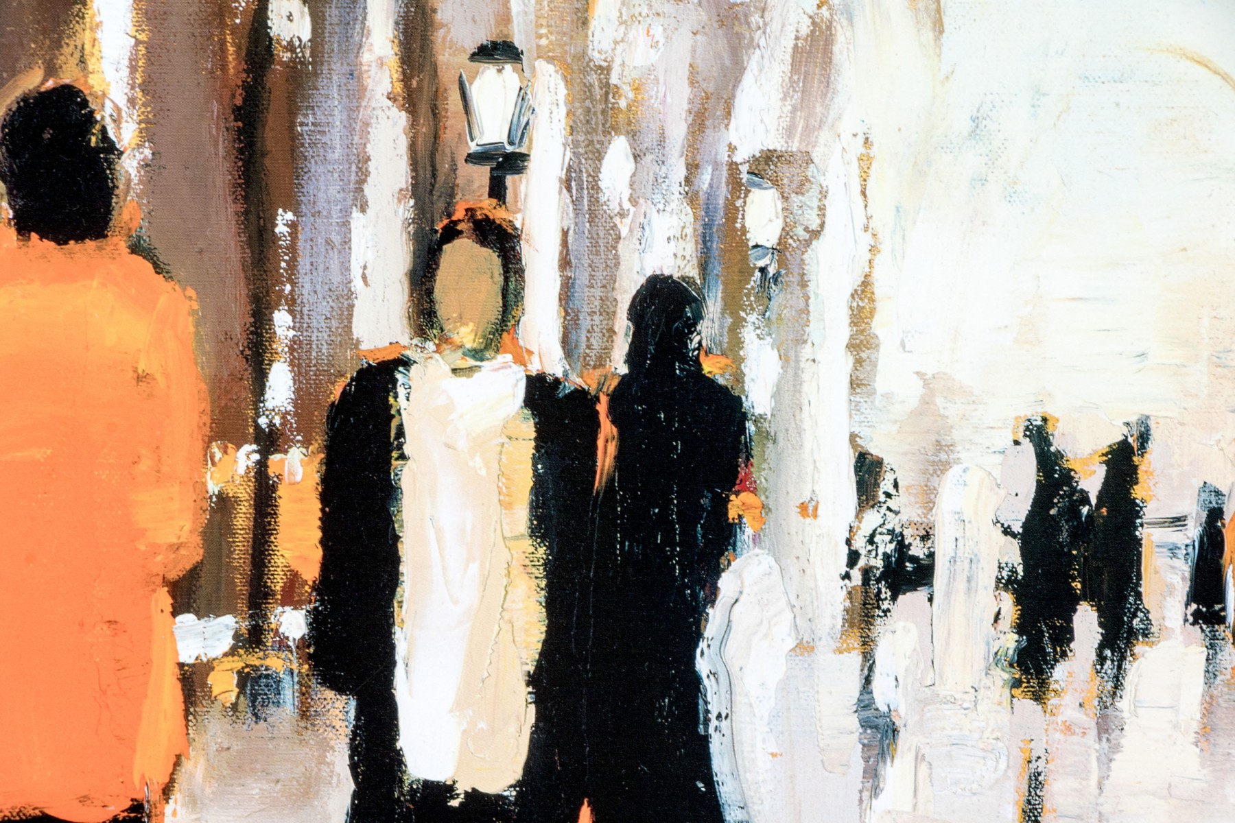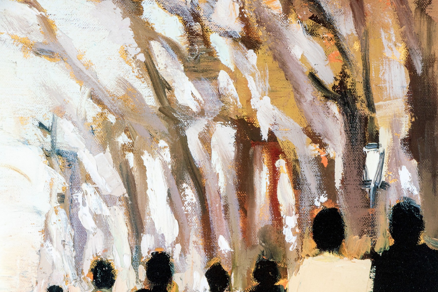A wonderfully framed art print depicting an Impressionistic, a la plein air style work depicting figures coming and going. Presented handsomely matted, within a silver finished frame and glazed with plexi.