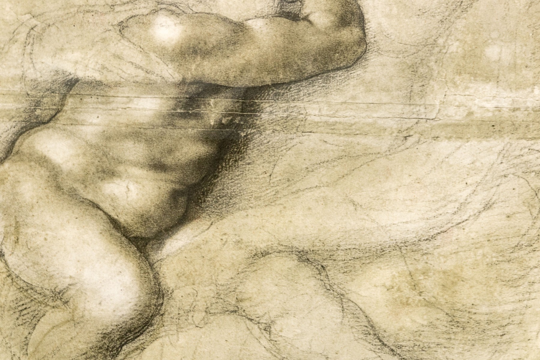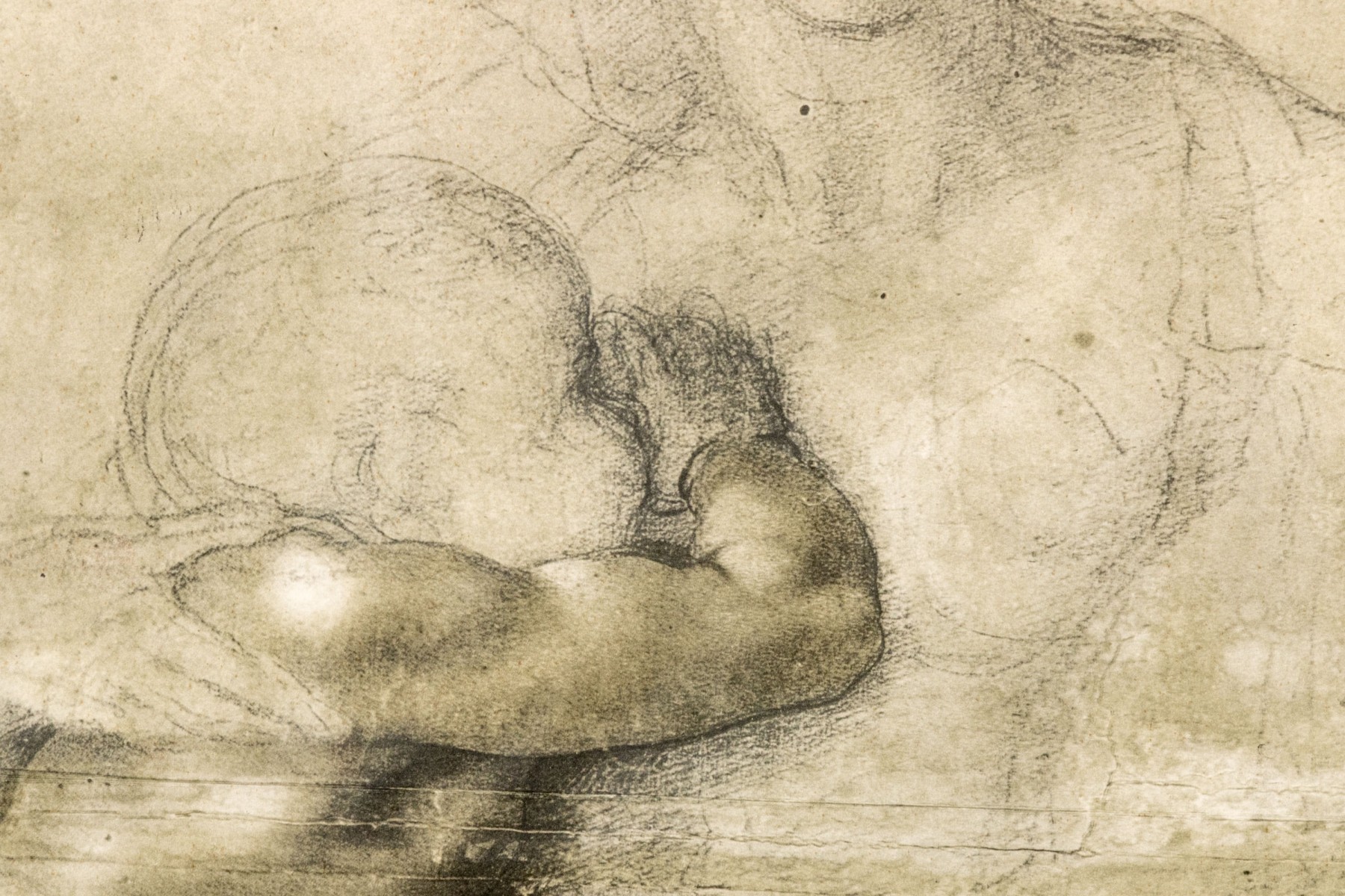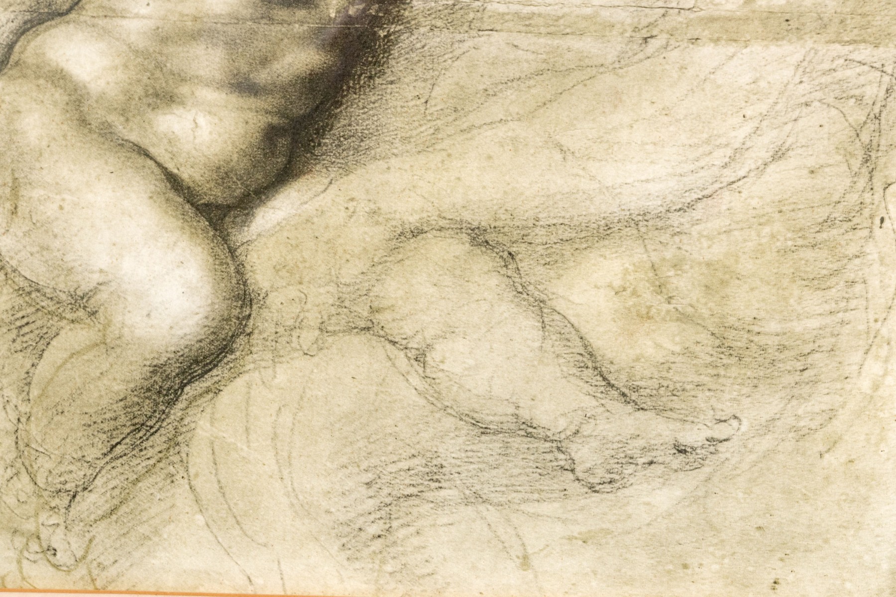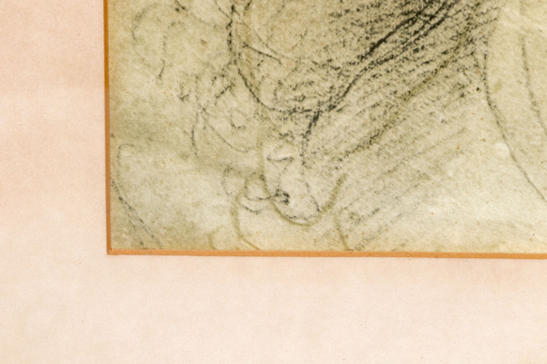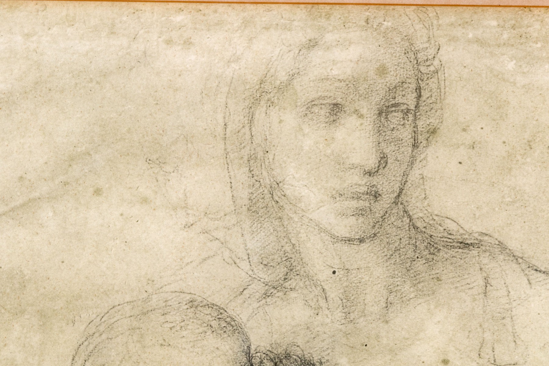 After Michelangelo di Lodovico Buonarroti Simoni (Italian, 1475-1564) "Madonna and Child, 1524" depicting Mary supporting infant Jesus on her lap. The loose sketch style creates a soft, delicate aesthetic, with a keen eye for tone and shadow on Jesus's form drawing the eye.
