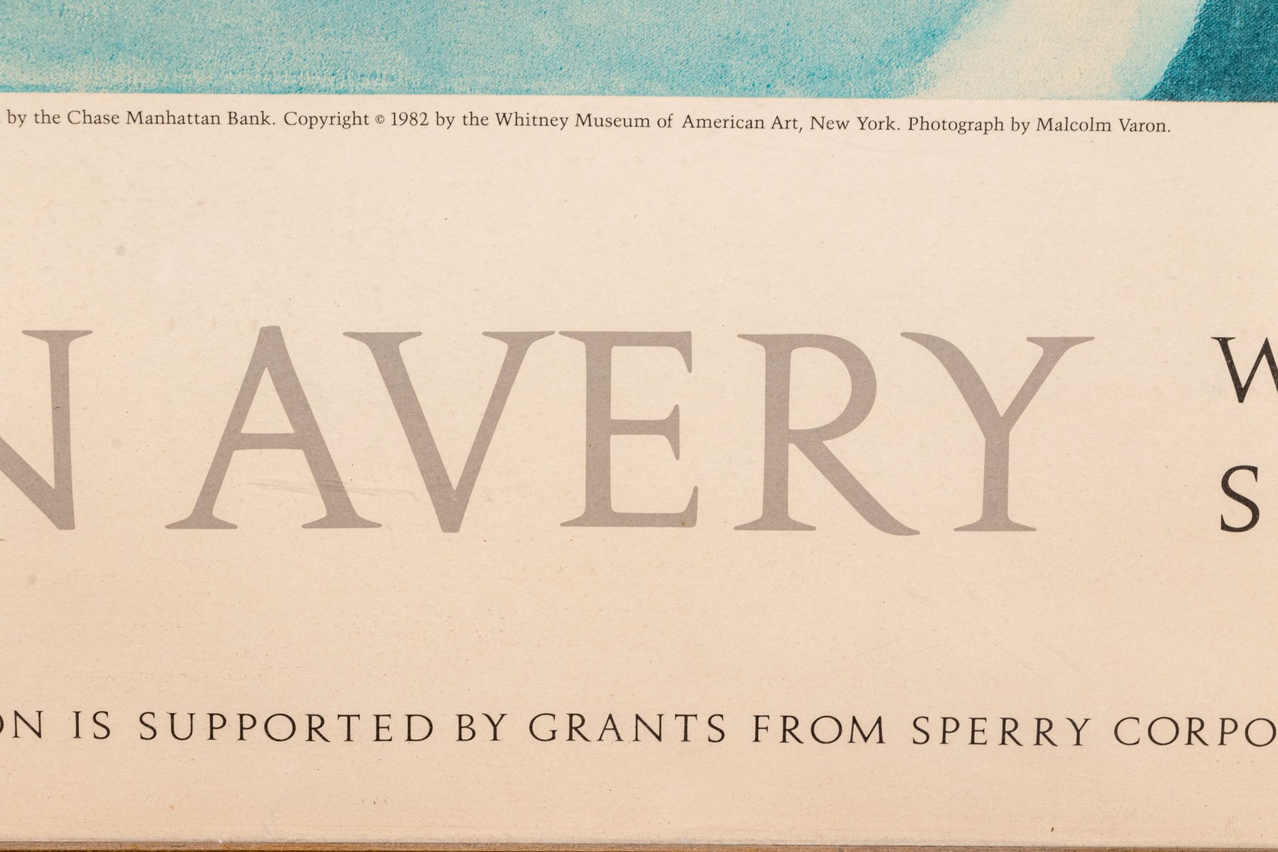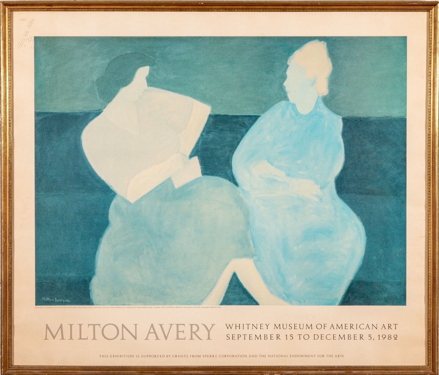 After Milton Avery (American, 1885-1965) Whitney Museum Of American Art exhibition poster for "Milton Avery" which ran from September 15th to December 5th, 1982. The poster features Avery's "Conversation," 1956, depicting two women in blue chatting while sitting on a teal blue couch.