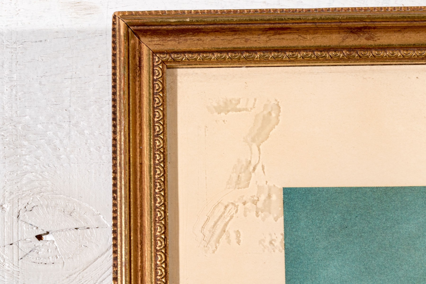 Some marks on the glass upper left and scrapes to the frame. Slight rippling to the paper.