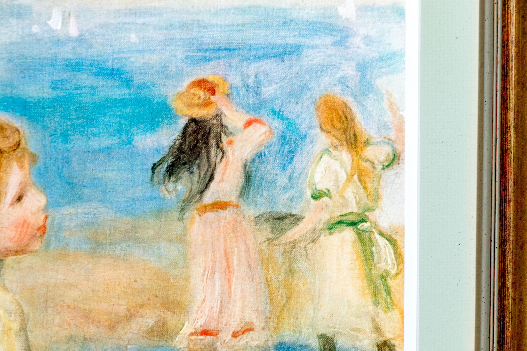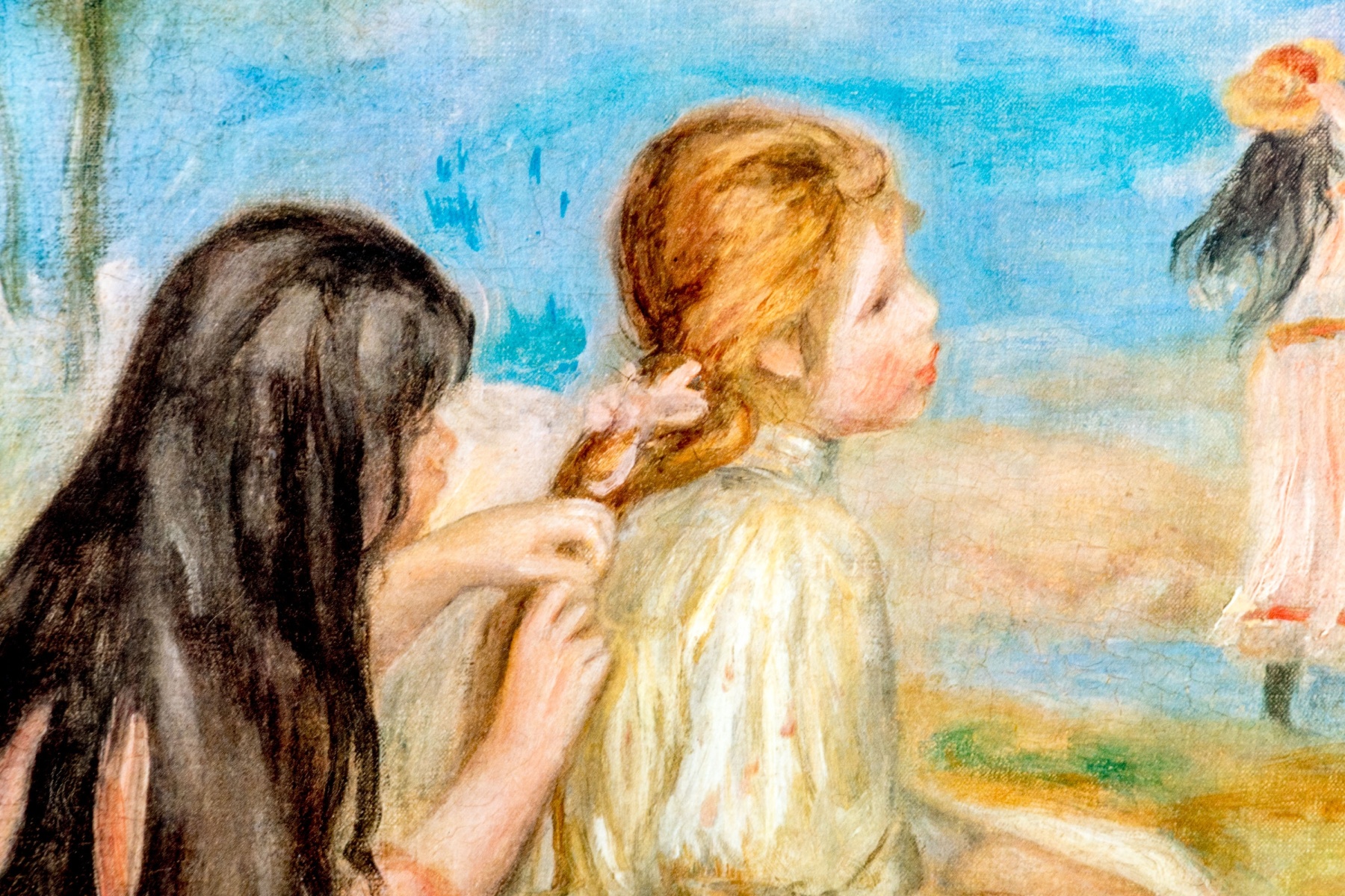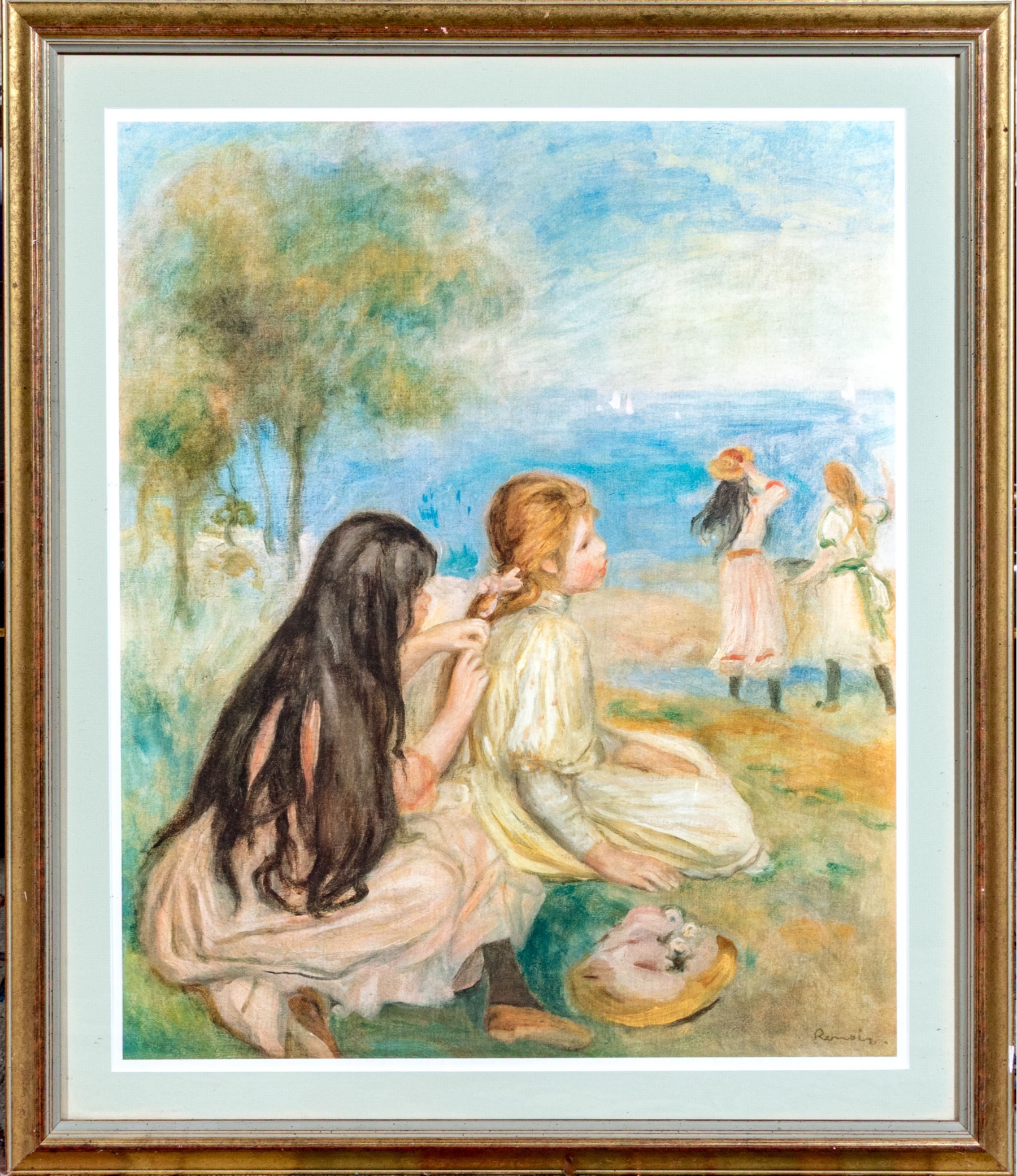 A high quality giclee after Pierre-Auguste Renoir (French, 1841-1919) "Young Girls at the Beach" depicting a refreshing post-impressionist scene of a girl with long, black hair braiding the hair if a blonde girl seated in the foreground as other girls enjoy the view of a vast ocean beside tall yellow and green trees. Plate signature lower right.
